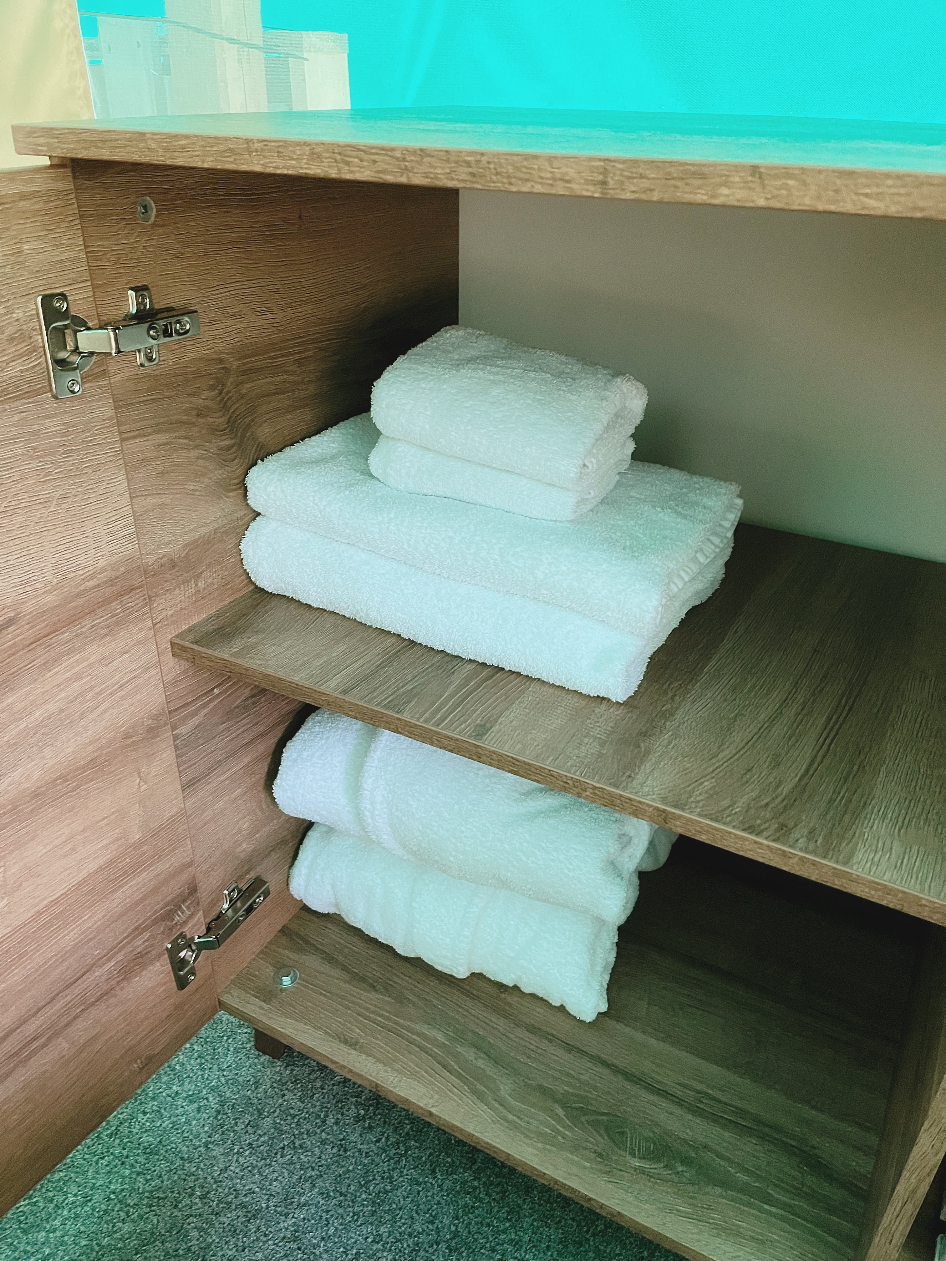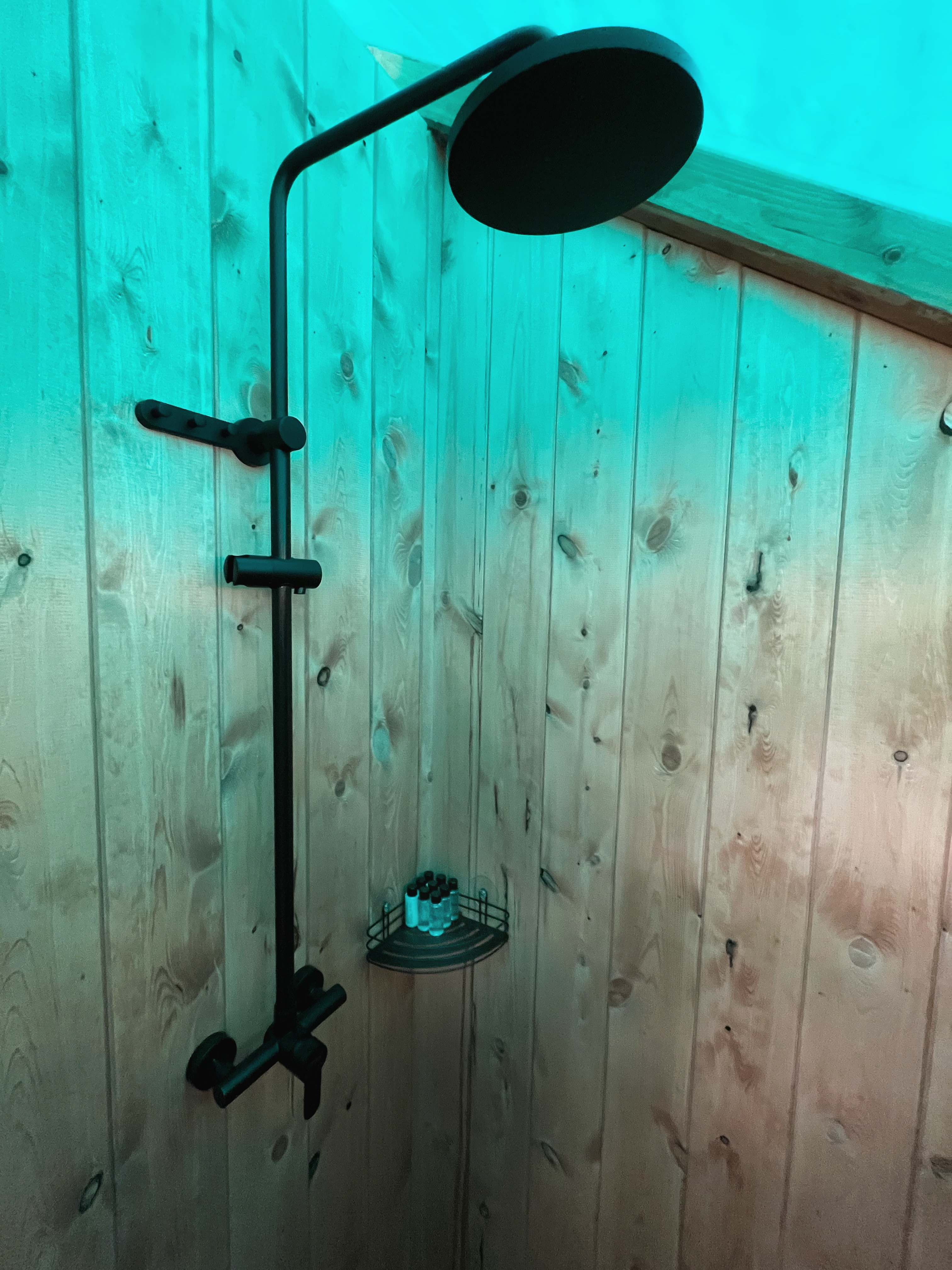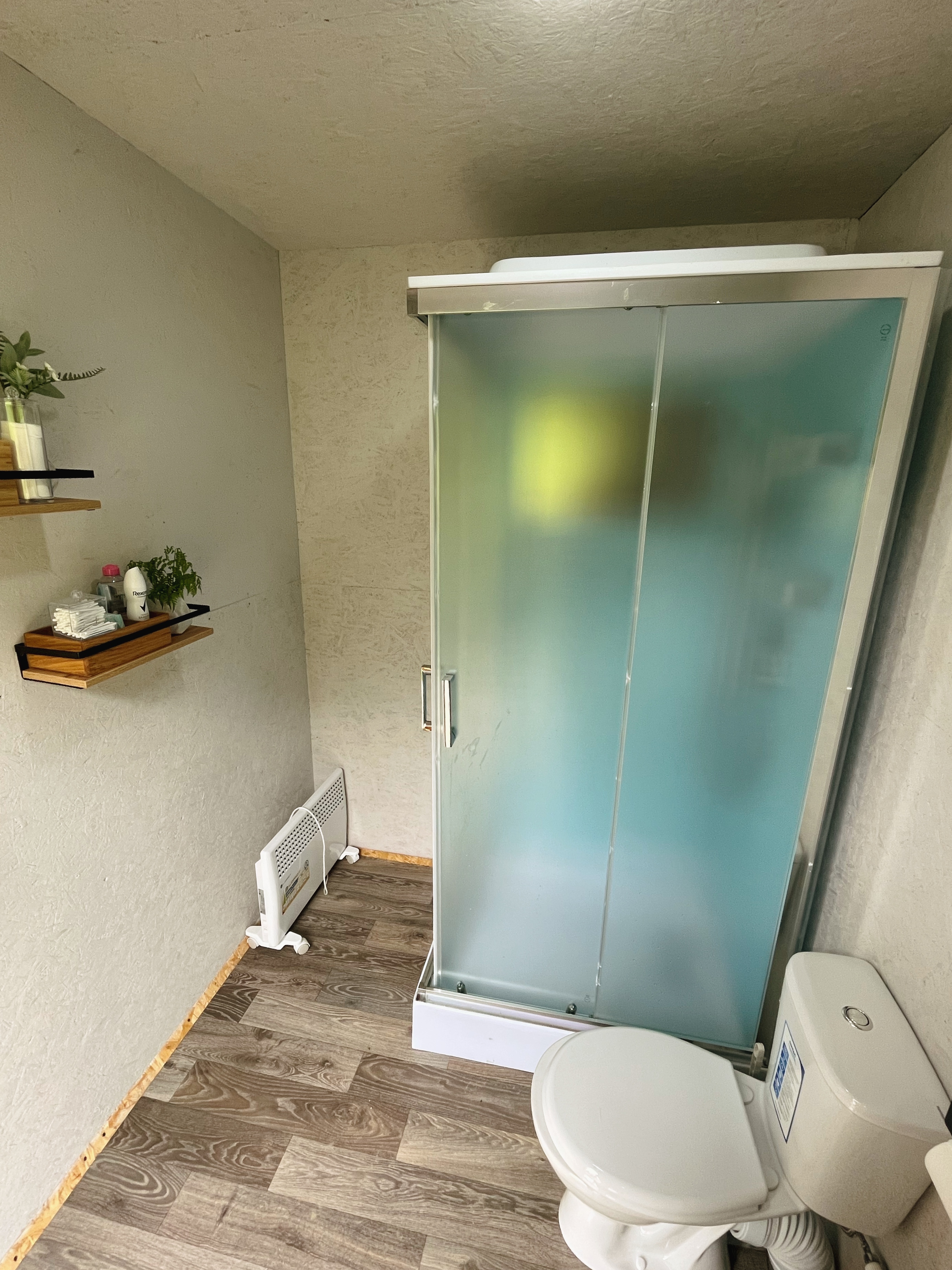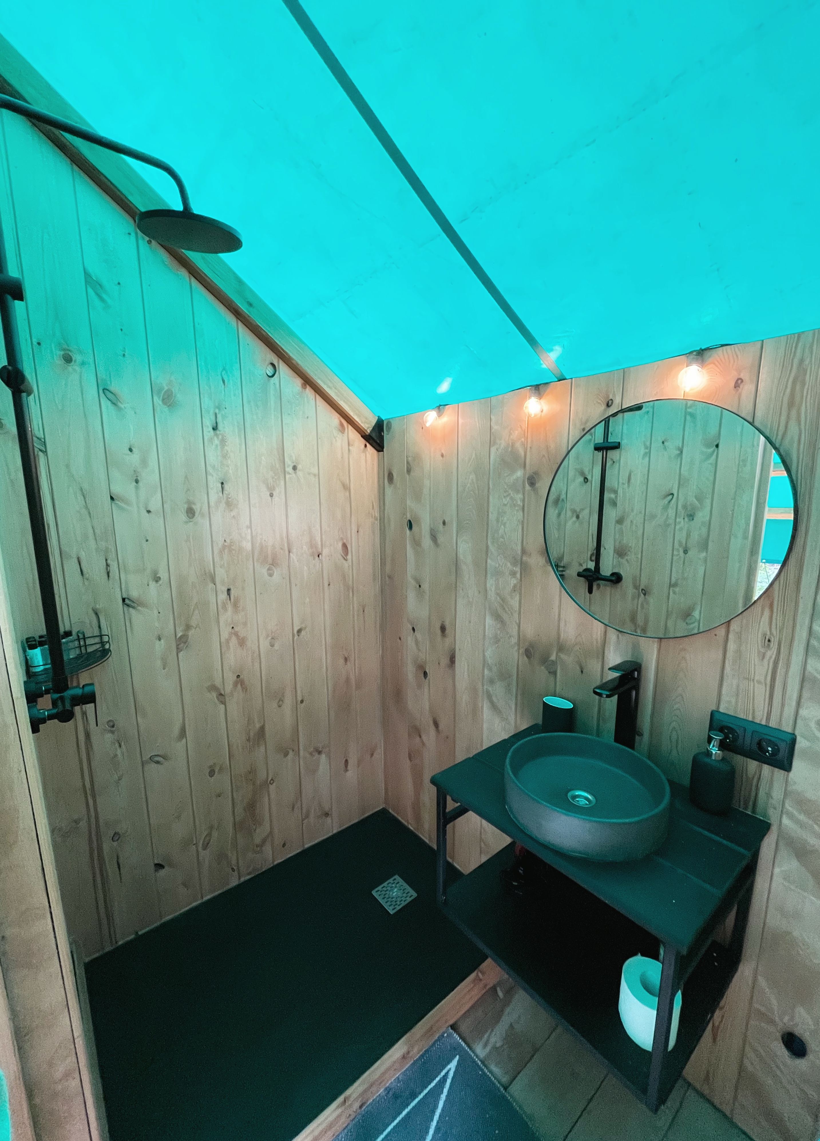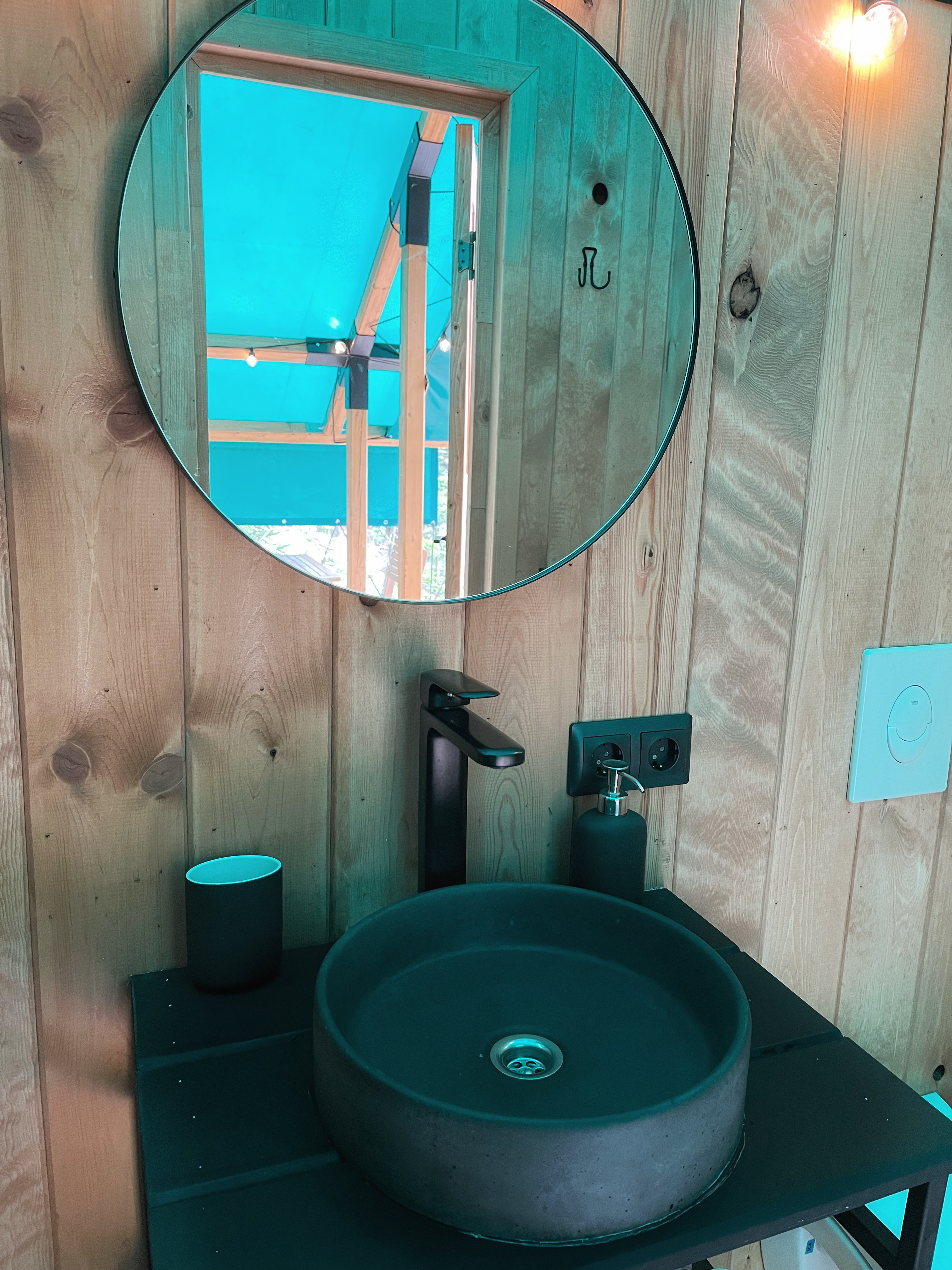 Общий санитарный модуль расположен возле глэмпинга №2 , в нем предусмотрены комнаты с душевой кабиной и раковиной, либо с унитазом и раковиной. Мангальная зона в шаговой доступности, на озере.