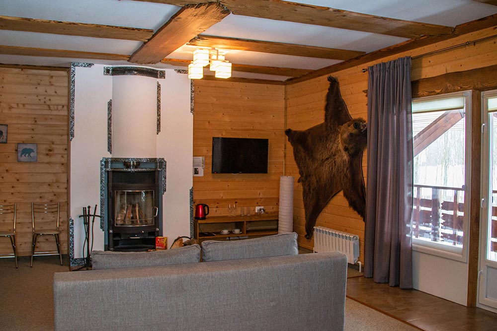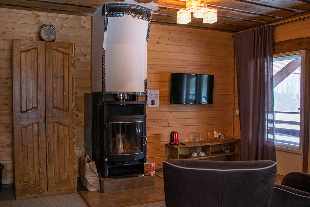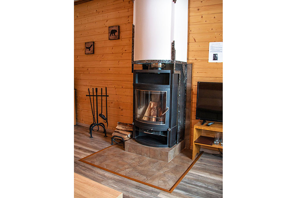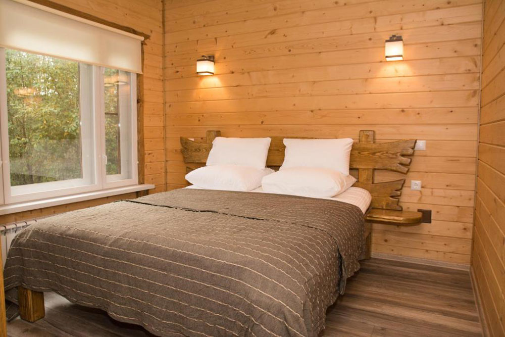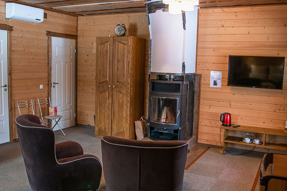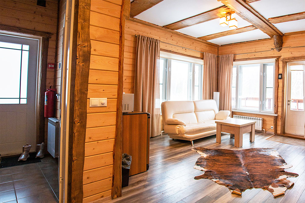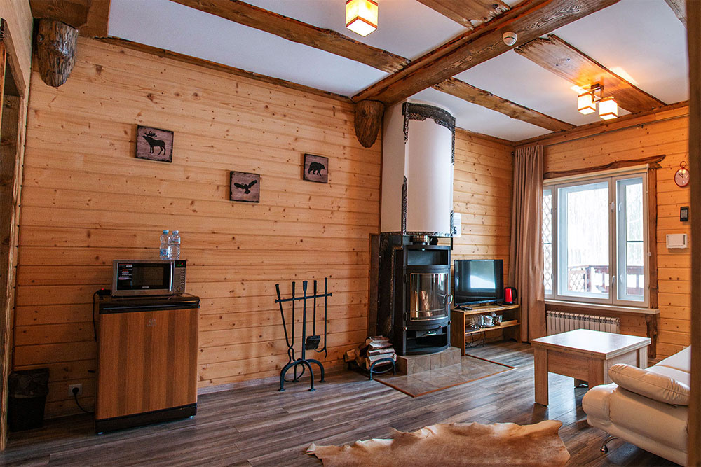 Здесь есть камин, душевая комната, большие окна с видом на лес и все необходимое для комфортного проживания, включая wi-fi.