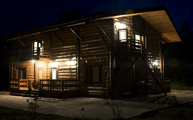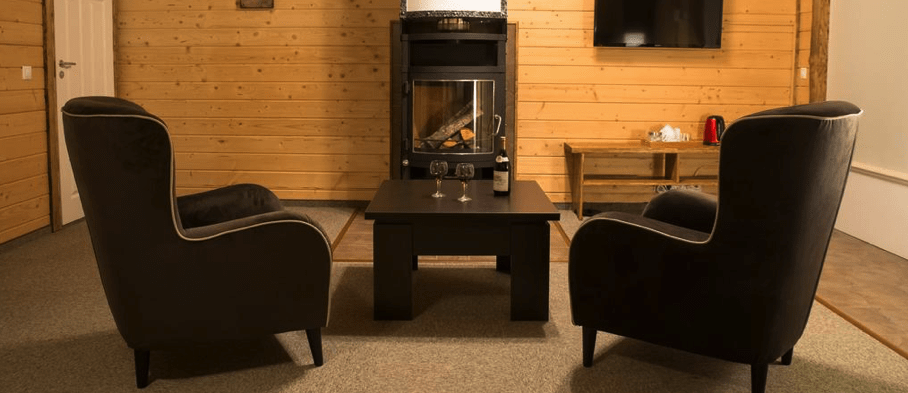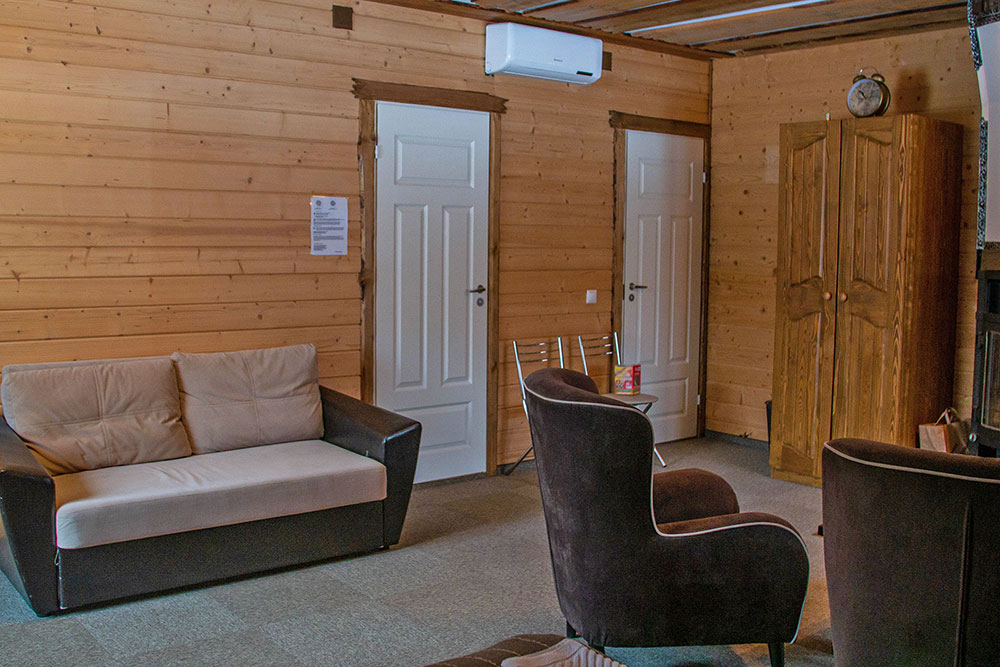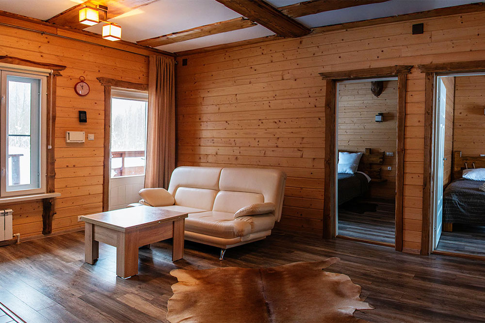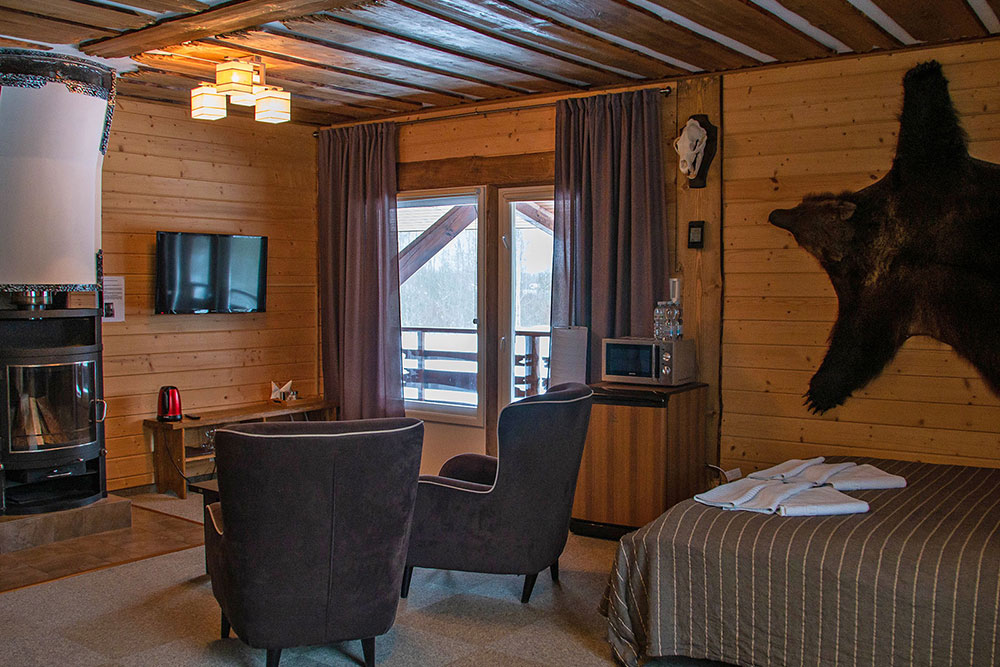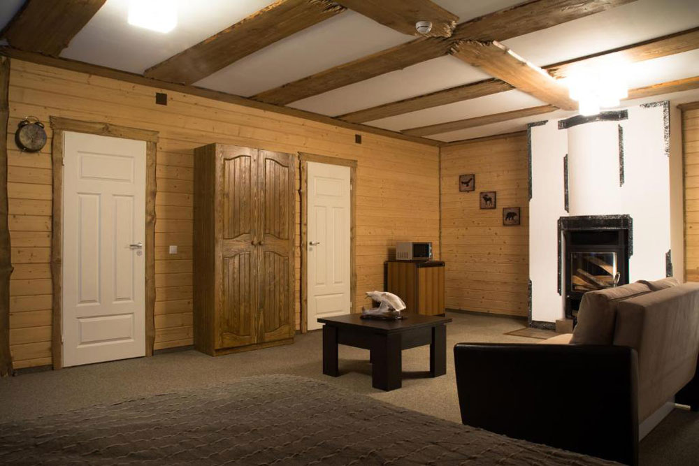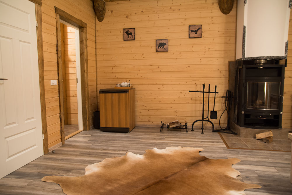 Здесь есть камин, душевая комната, большие окна с видом на лес и все необходимое для комфортного проживания, включая wi-fi.