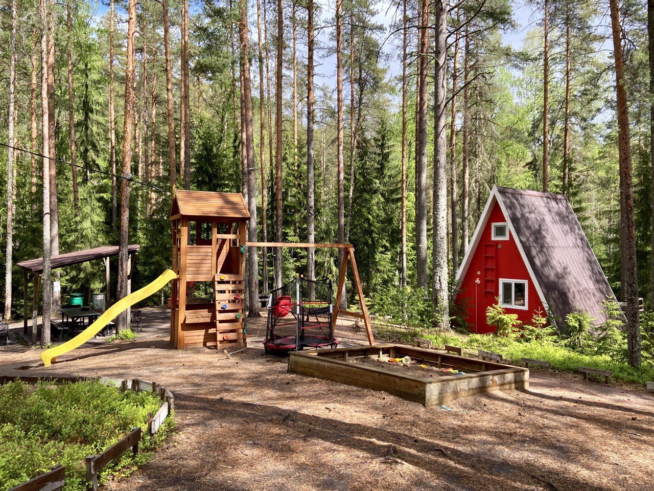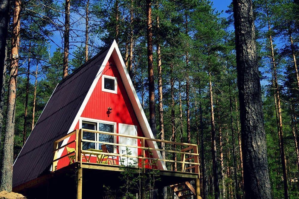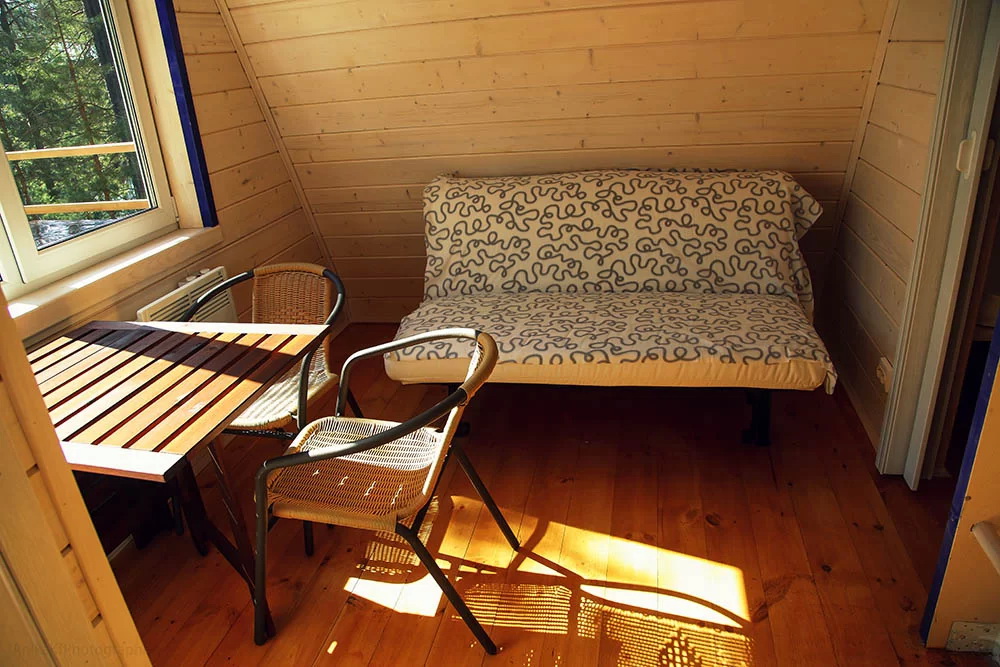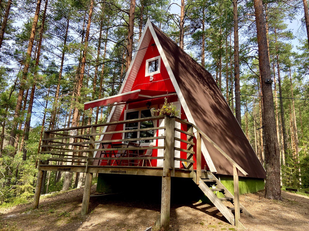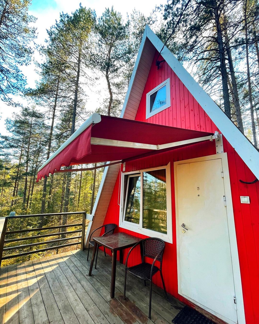 Оборудованный всем необходимым треугольный А-дом в сосновом лесу с видом на озеро террасой, оборудованной складным козырьком, и видом на озеро. Рядом бесплатная мангальная зона. К домикам ведут тропинки, вписанные в ландшафт соснового леса. Вместимость: от 1 до 4-х гостей, а также возможно размещение двух дополнительных гостей. Аренда коттеджа рассчитана и на холодные сезоны. Помещения утеплены, отопление теплыми полами и радиаторами, есть москитные сетки.