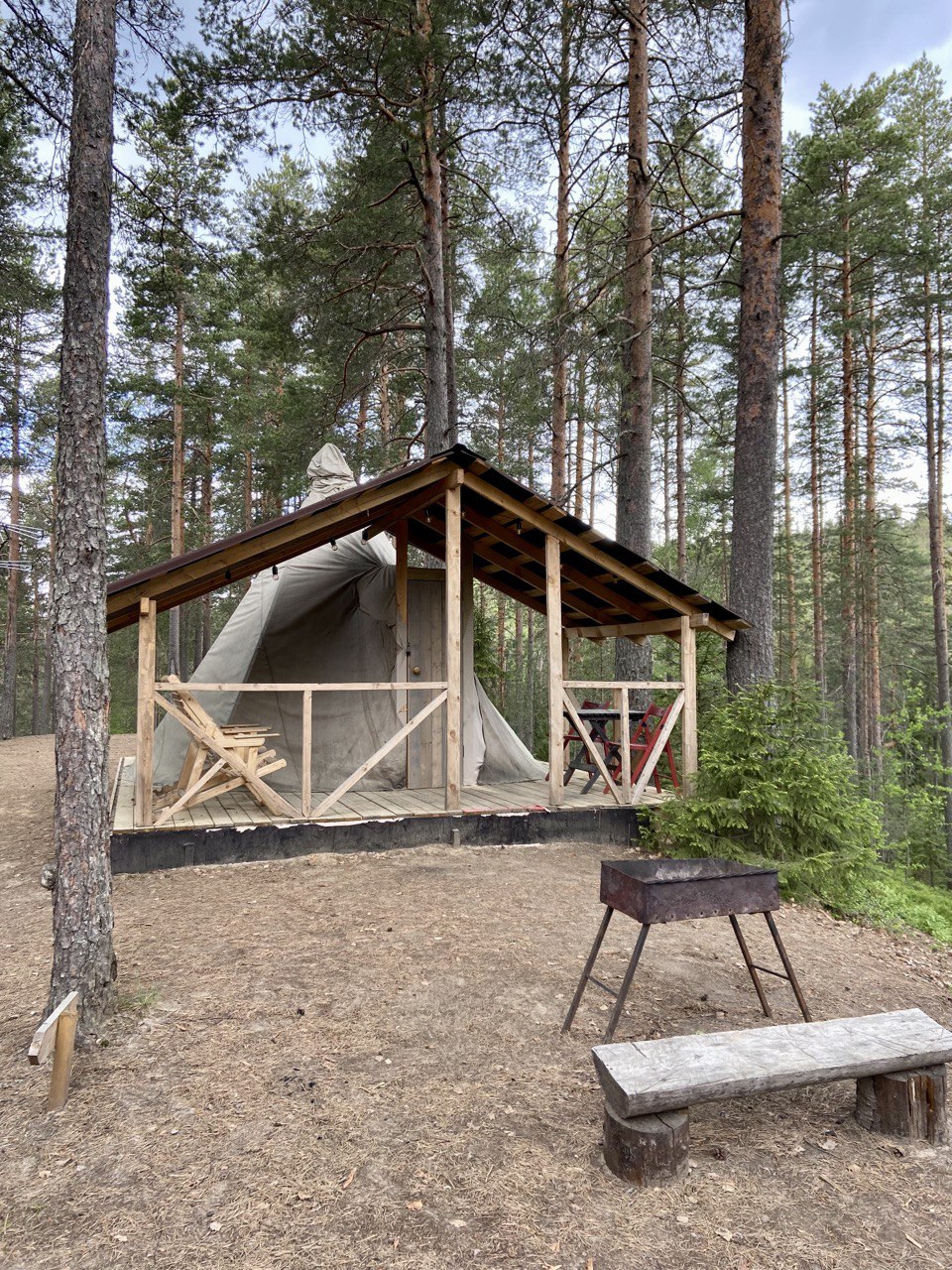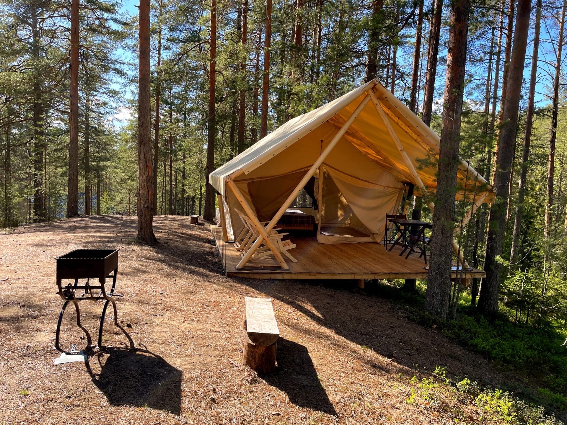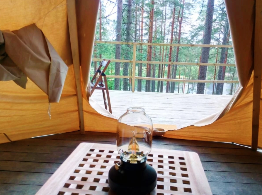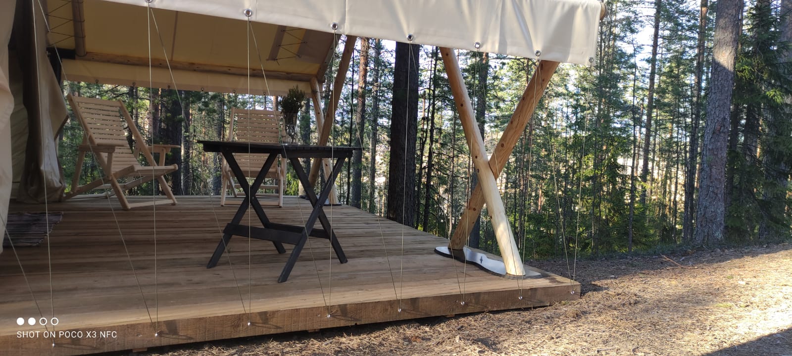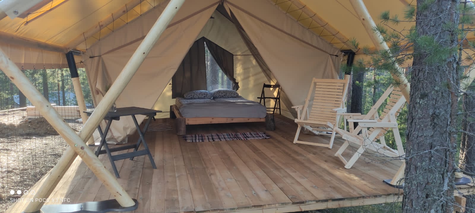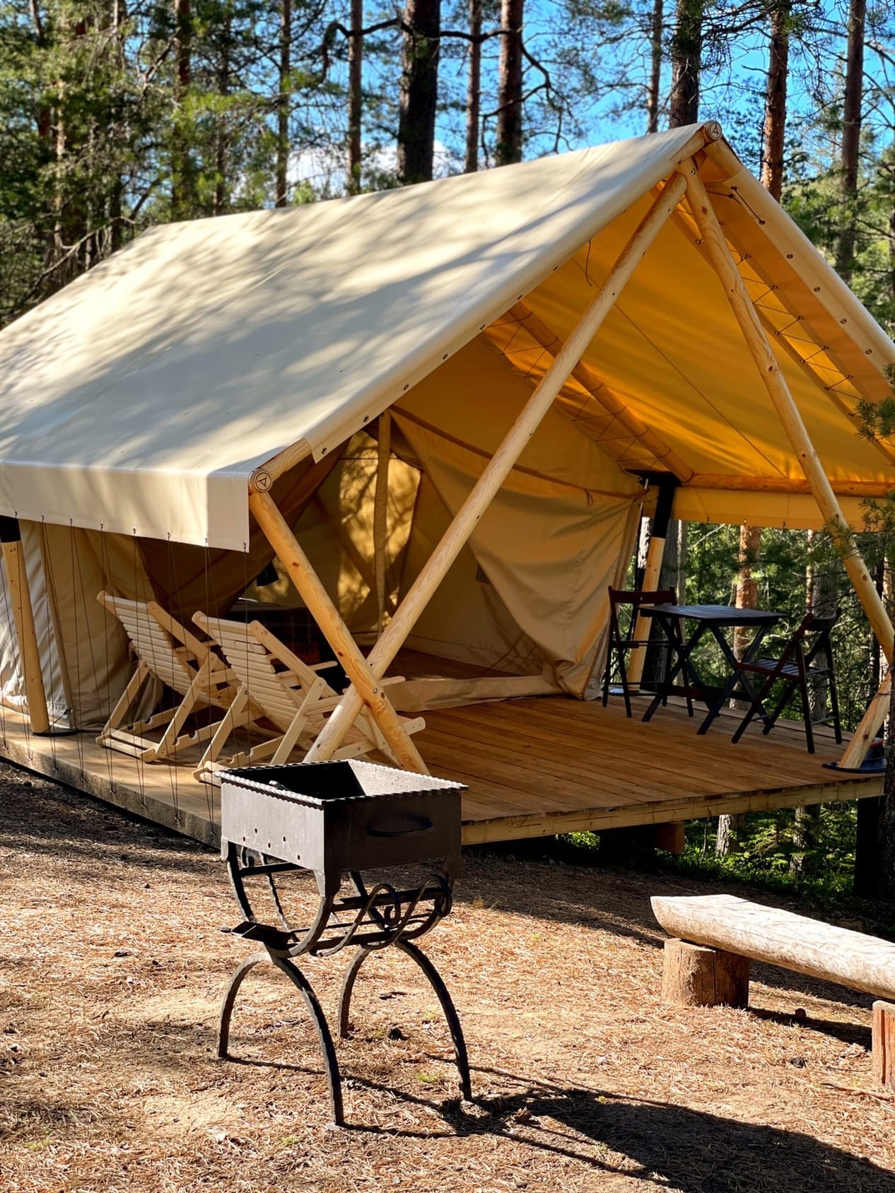 Сафари-тент – самый современный вид глэмпинга. Тент расположен на вершине холма в сосновом лесу с видом на озеро и оборудован мангальным местом, столом и креслами на террасе.