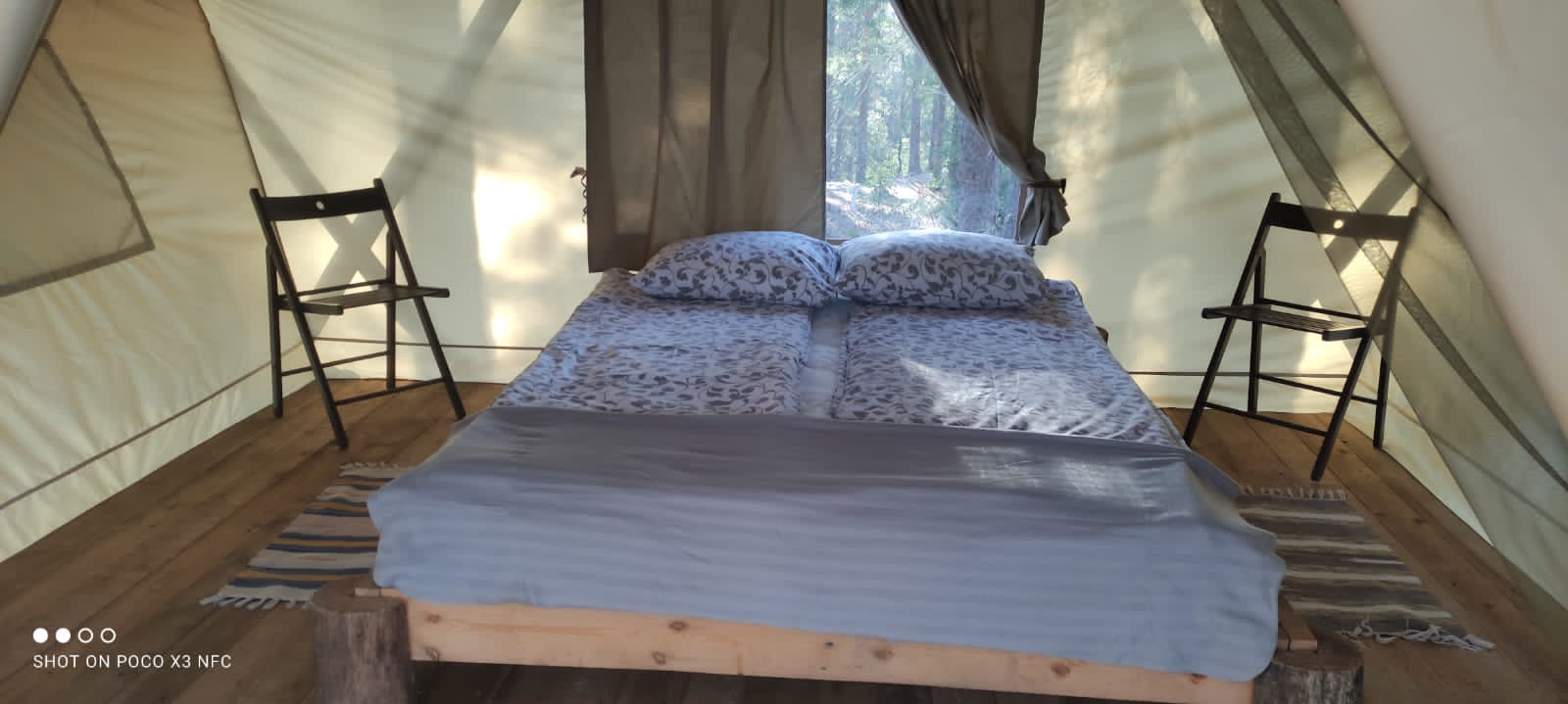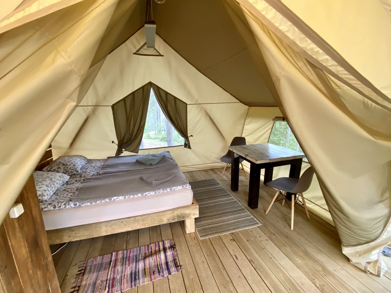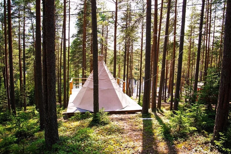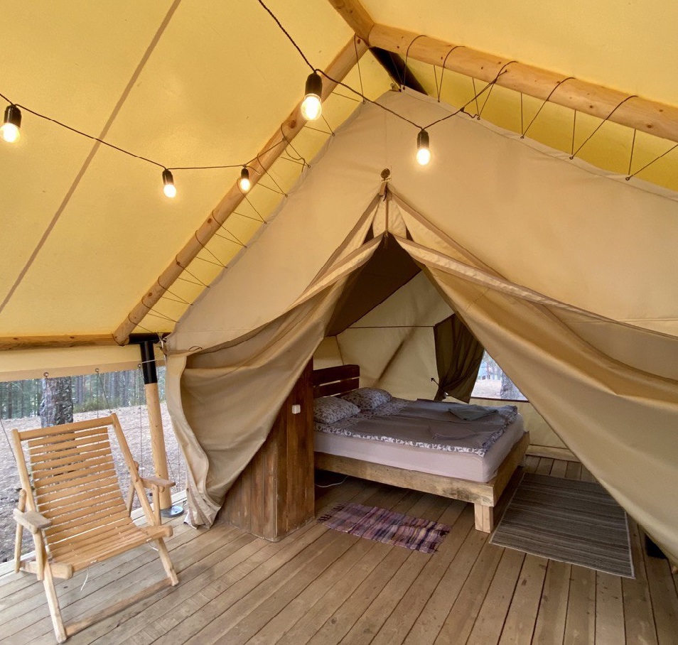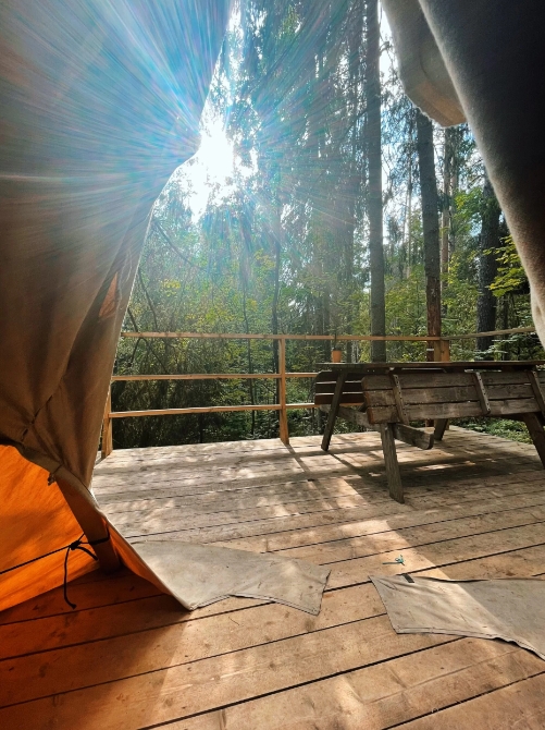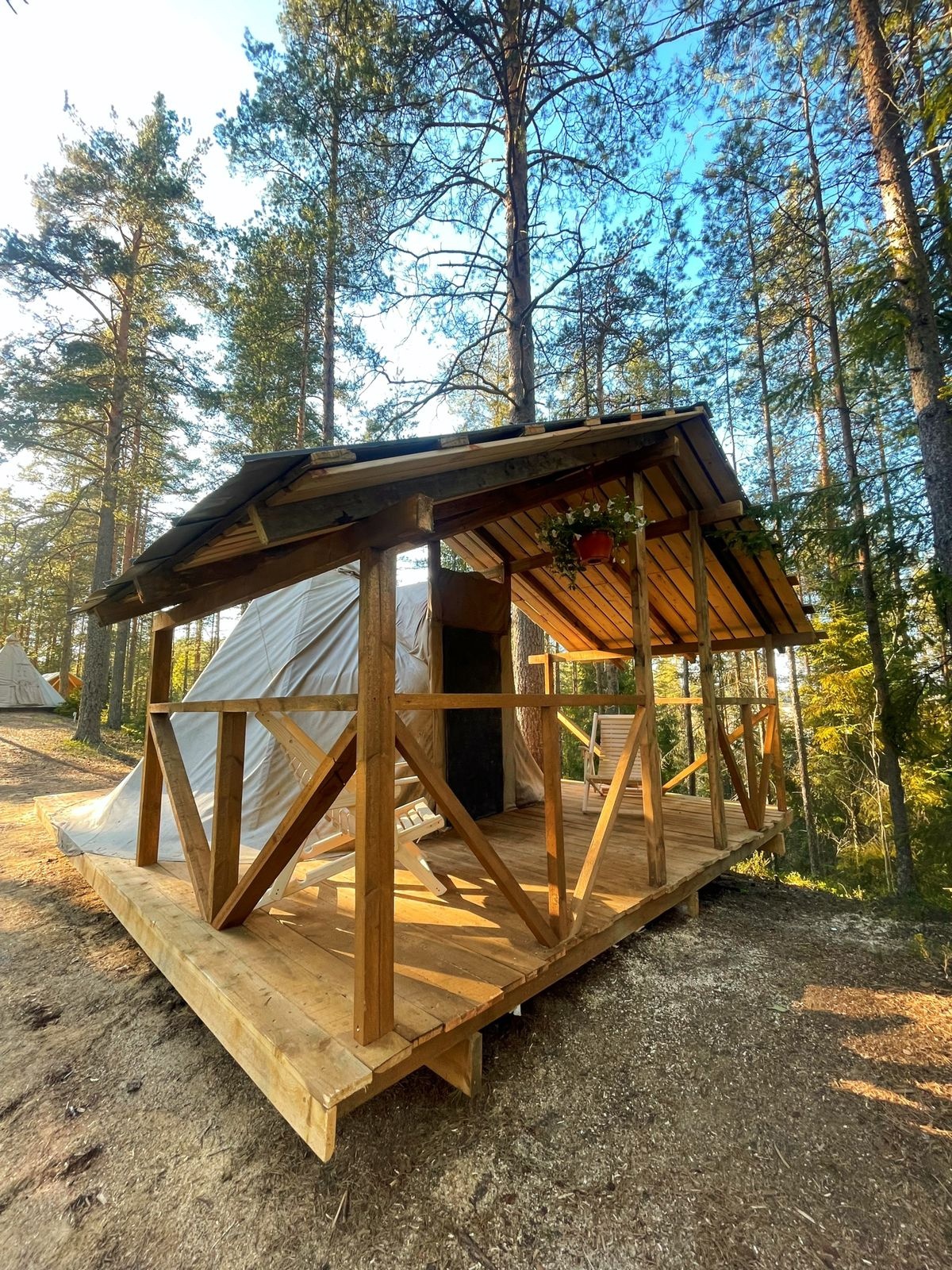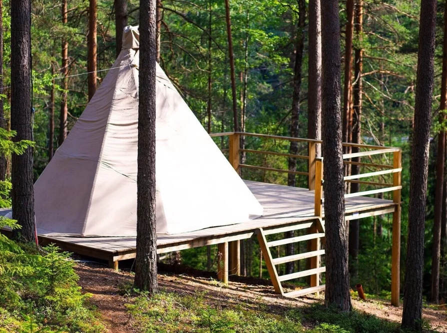 Сафари-тент – самый современный вид глэмпинга. Тент расположен на вершине холма в сосновом лесу с видом на озеро и оборудован мангальным местом, столом и креслами на террасе.