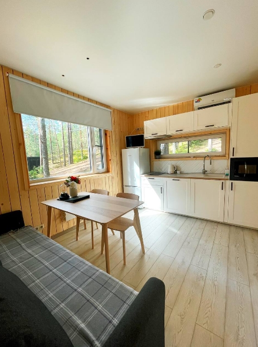 Тайни-Хаус – это небольшой стильный коттедж в максимально уединенной части нашего парка активного семейного и корпоративного отдыха, выполненный в стиле скандинавского минимализма. Такой домик идеально подойдет для двоих или семьи с ребенком. Небольшие размеры коттеджа компенсируются просторной террасой площадью 18 м2 и восхитительным видом, возможностью перекусить в хорошем ресторане и воспользоваться десятками развлечений на открытом воздухе в любое время года. К домикам ведут тропинки, вписанные в ландшафт соснового леса.