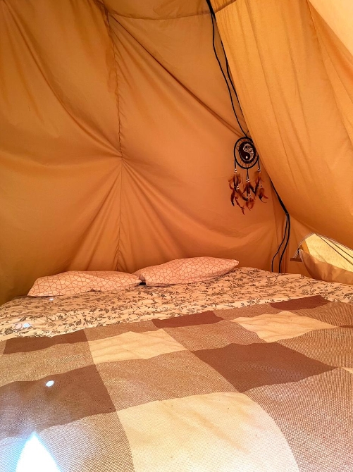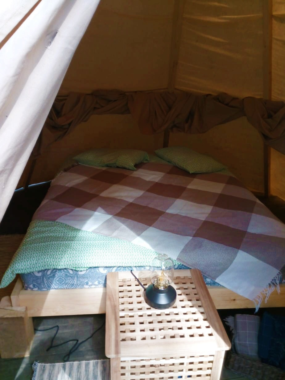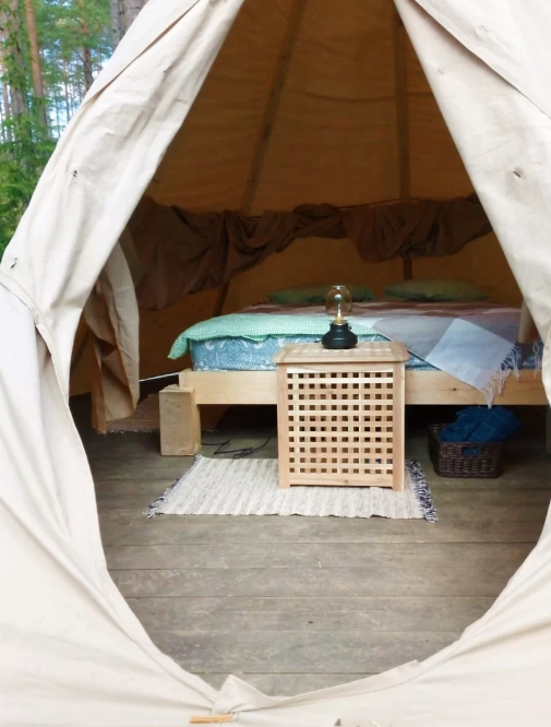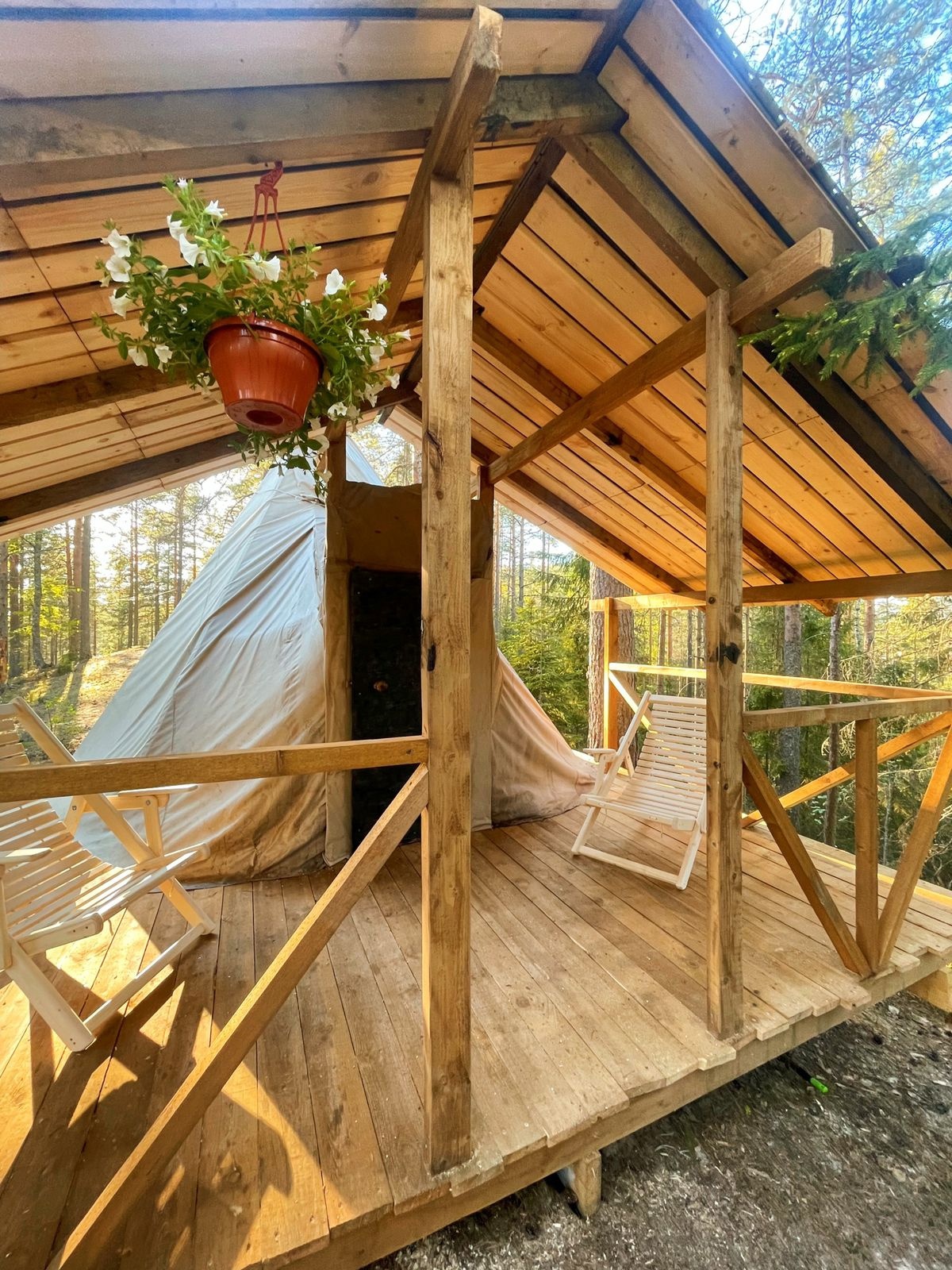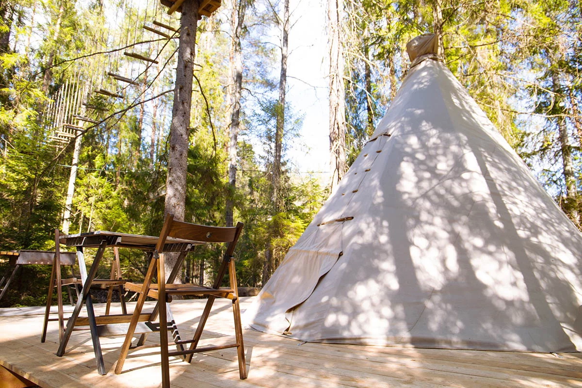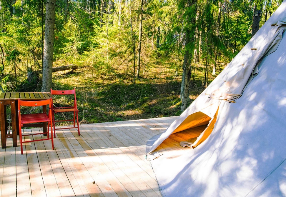 Два удобных типи расположены в сосновом лесу на вершине холма с видом на озеро. Каждый типи оборудован собственным мангальным местом и столом со стульями на террасе.