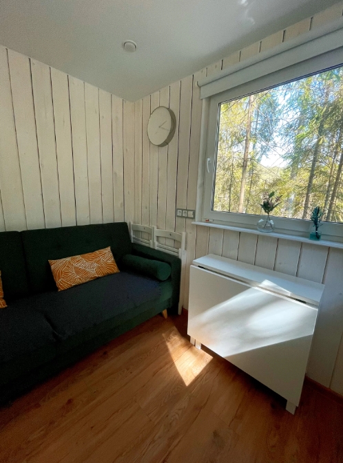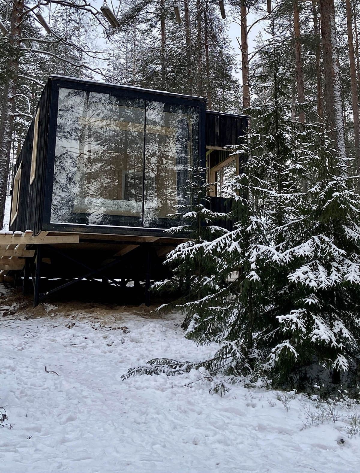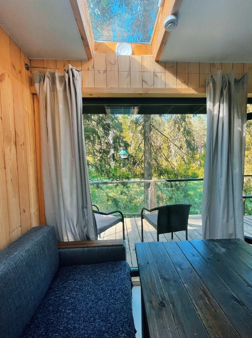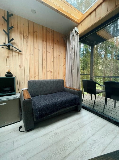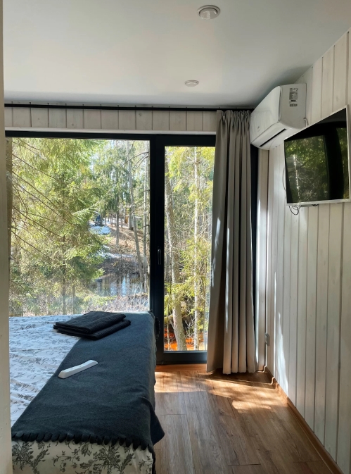 - Комната: теплый пол, двуспальная кровать с матрасом ИКЕА, бра для чтения, стол, 2 стула, полки, телевизор, мини-холодильник, электрический чайник, набор посуды на 2х человек (чашки, тарелки, стаканы, приборы), панорамное остекление в пол с видом на озеро или речку и лес, потолочное окно над кроватью.