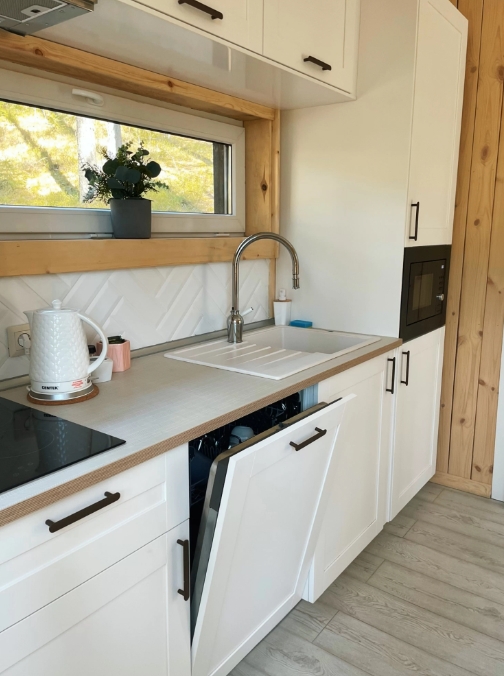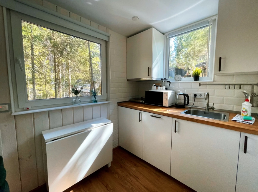 Сканди-Хаусы оборудованы современной бытовой техникой (индукционная плита, вытяжка, холодильник, посудомоечная машина, микроволновка, электрический чайник). Помещения отапливаются теплыми полами и инфракрасными обогревателями, окна открываются для проветривания. Одним из поводов выбора данного коттеджа является его панорамное остекление во всю стену в спальне с видом на озеро и лес и потолочное окно прямо над кроватью, позволяющее любоваться звездным небом в ясную погоду.