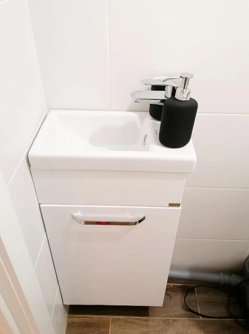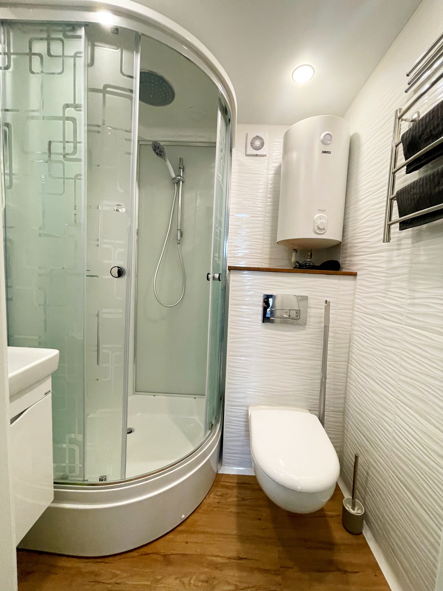 - Санузел с теплым полом, душевой кабиной, бойлером Zanussi 50 л, раковиной, вытяжкой, феном, сушилкой для полотенец, унитазом, детским горшком и ступенькой.