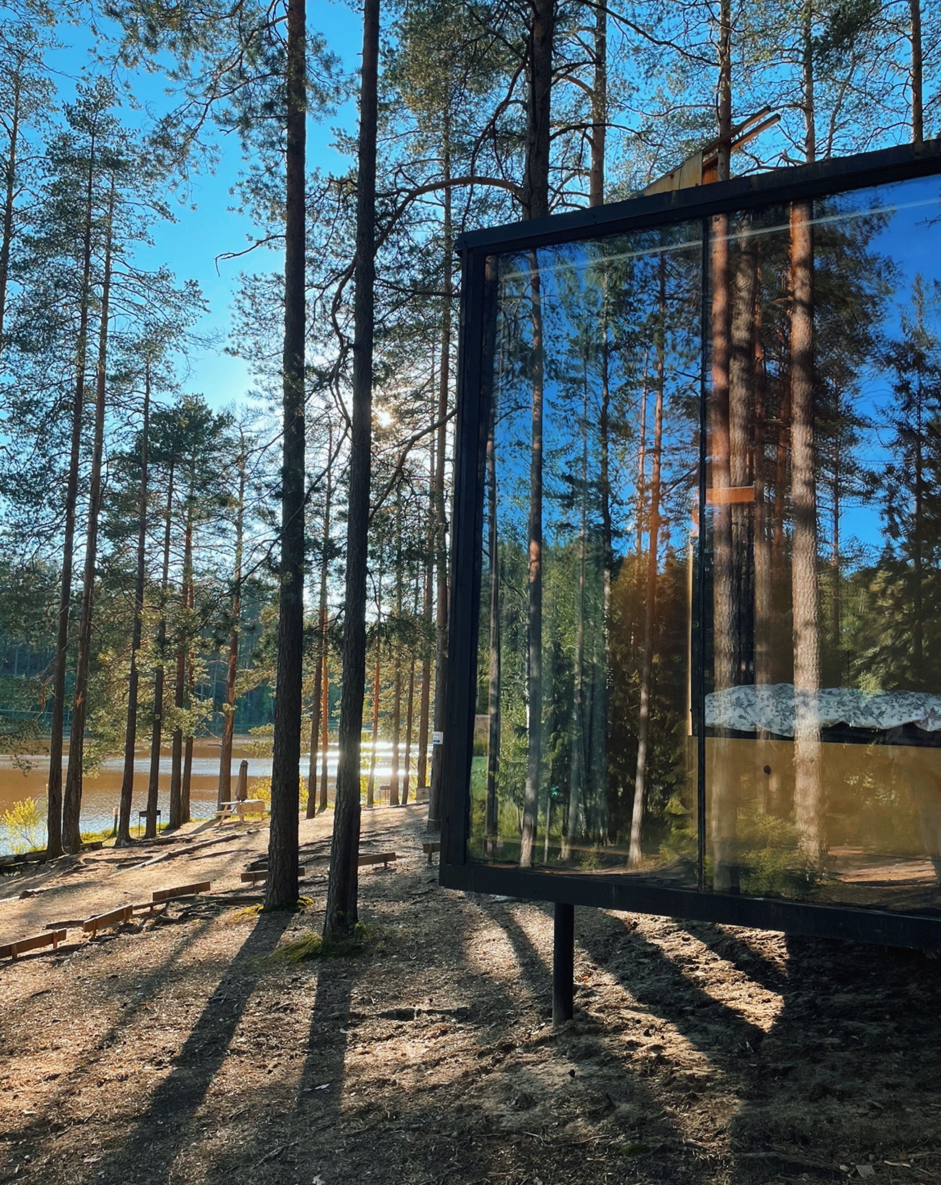 Стильный номер в сосновом лесу на берегу лесного озера с панорамным окном и индивидуальной террасой с мангалом. Основное преимущество номера – наличие сауны прямо в номере (в проживание включено 2 часа сауны в сутки, а если вы проживаете несколько дней, можно использовать все время в один день). К домикам ведут тропинки, вписанные в ландшафт соснового леса.