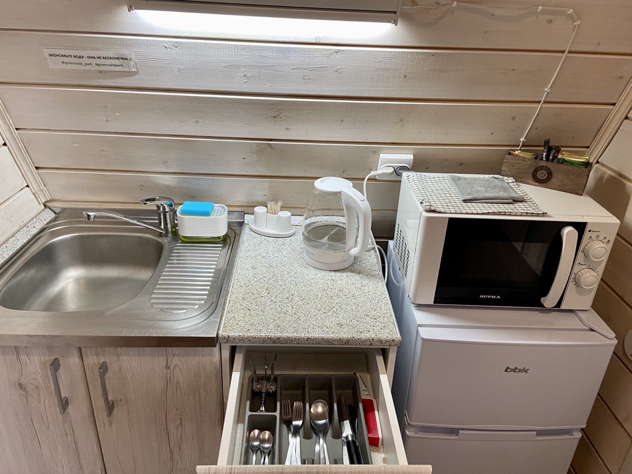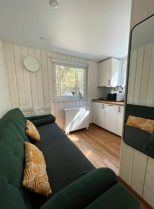 - Кухня-гостиная с холодильником, электрическим чайником, мойкой, микроволновкой, набором посуды на 4-6 человек, телевизором, двуспальным раскладным диваном, раскладным столом и двумя стульями.