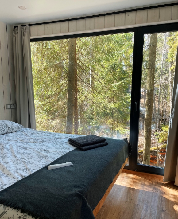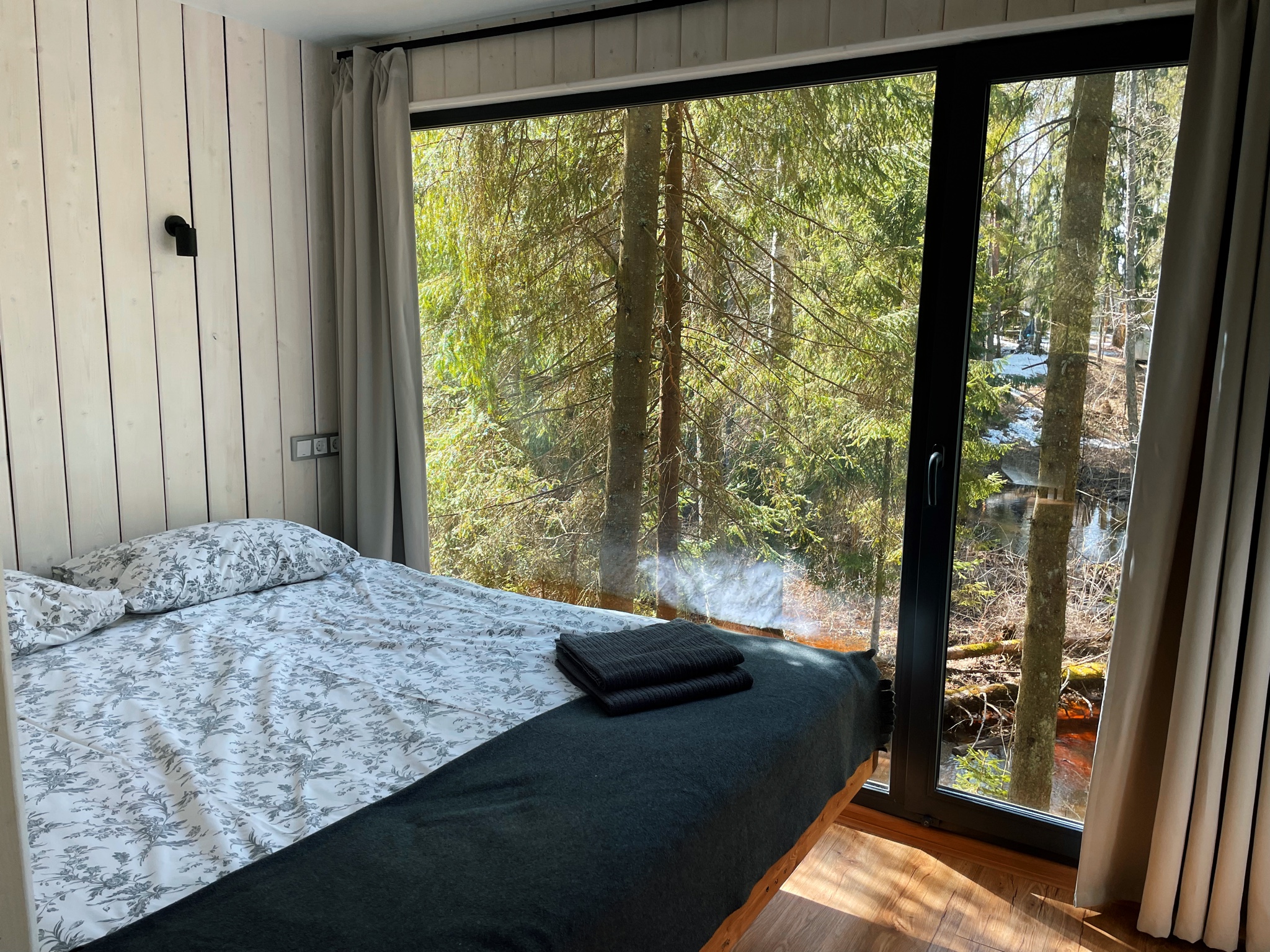 - Спальня: двуспальная кровать, панорамное остекление стены с видом на реку и лес и окно для проветривания, бра для чтения, телевизор.
