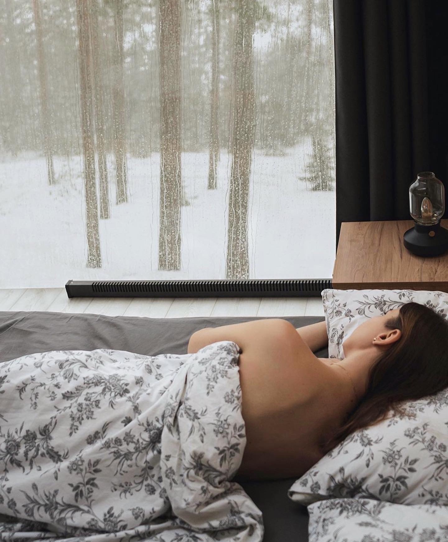 - Спальня: теплый пол, двуспальная кровать, телевизор, встроенные шкафы, бра для чтения, панорамное остекление в пол с видом на озеро и лес.