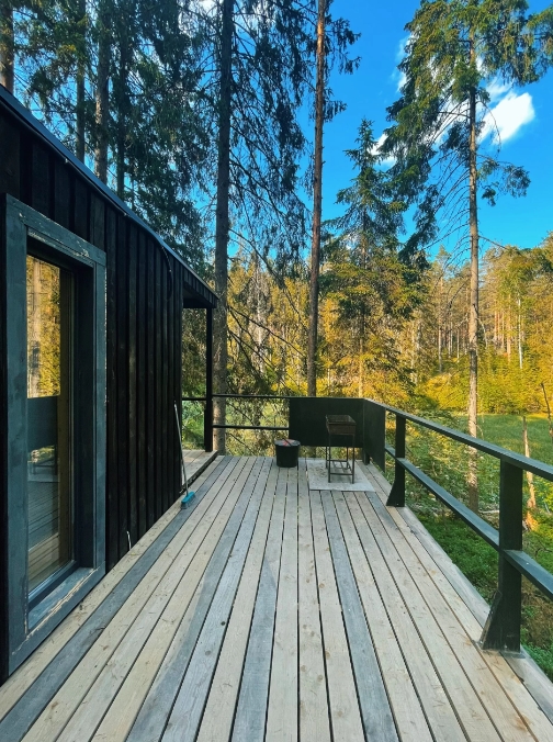 - Крытая терраса 10 м2 с шезлонгами/креслами, подвесным креслом, видом на лес и реку, розеткой и освещением.