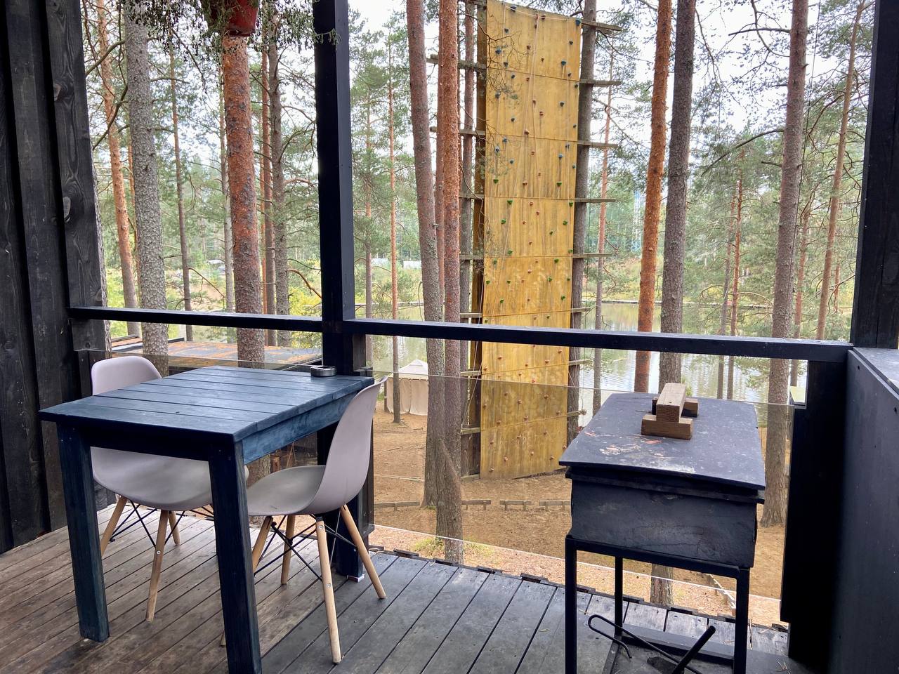 - Крытая терраса со столом и подвесным креслом с видом на лес и озеро, розеткой и освещением.