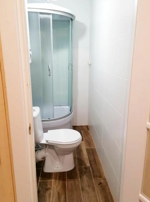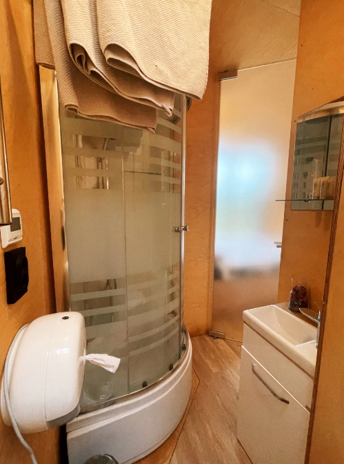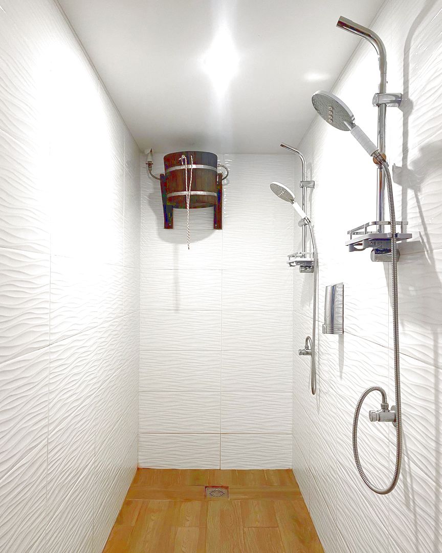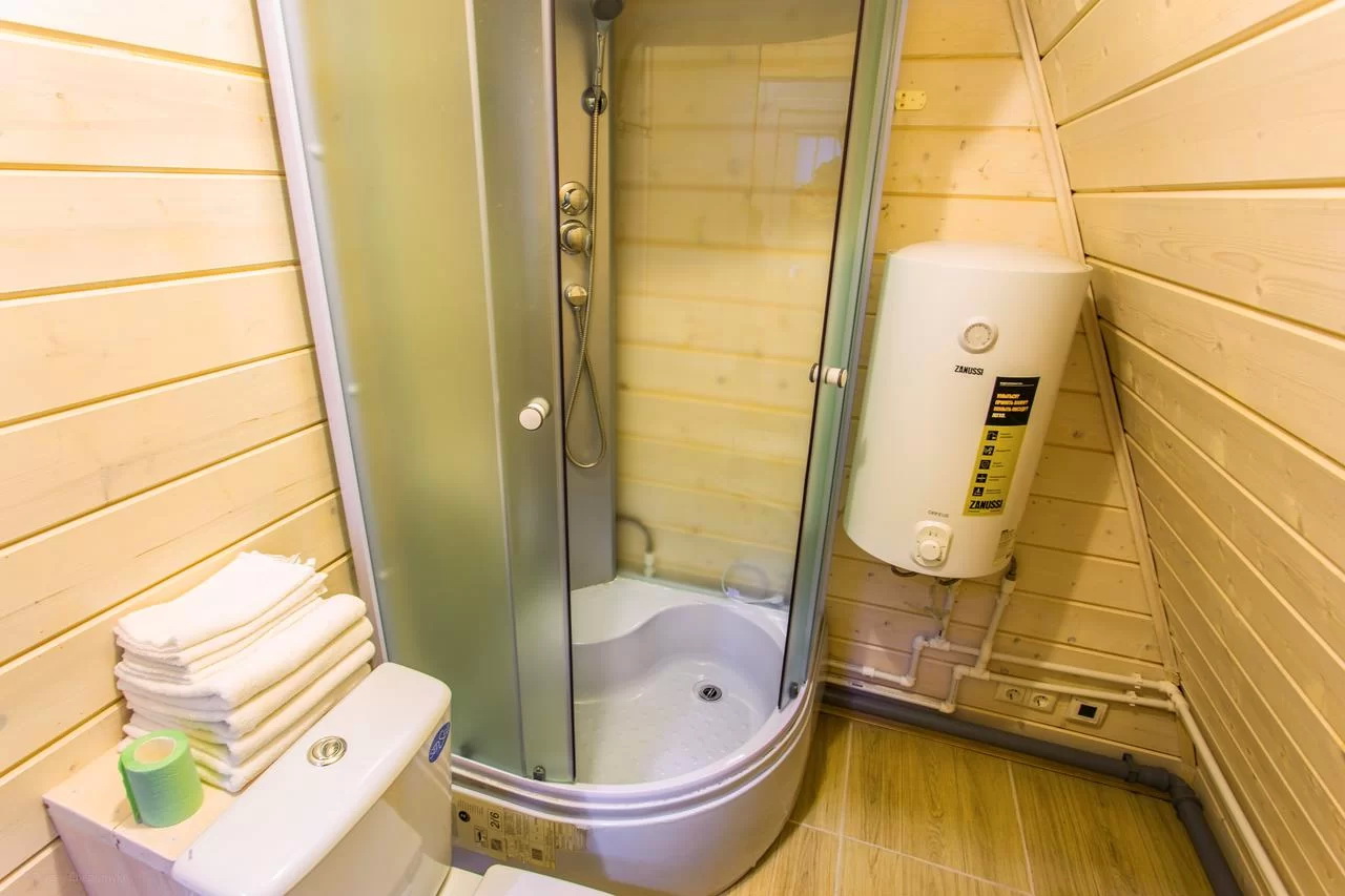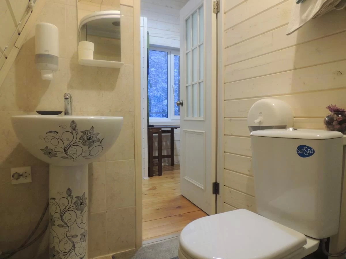 - Раздельный санузел (туалет с унитазом и раковиной, фен) и просторный душ, где также есть обливное ведро.