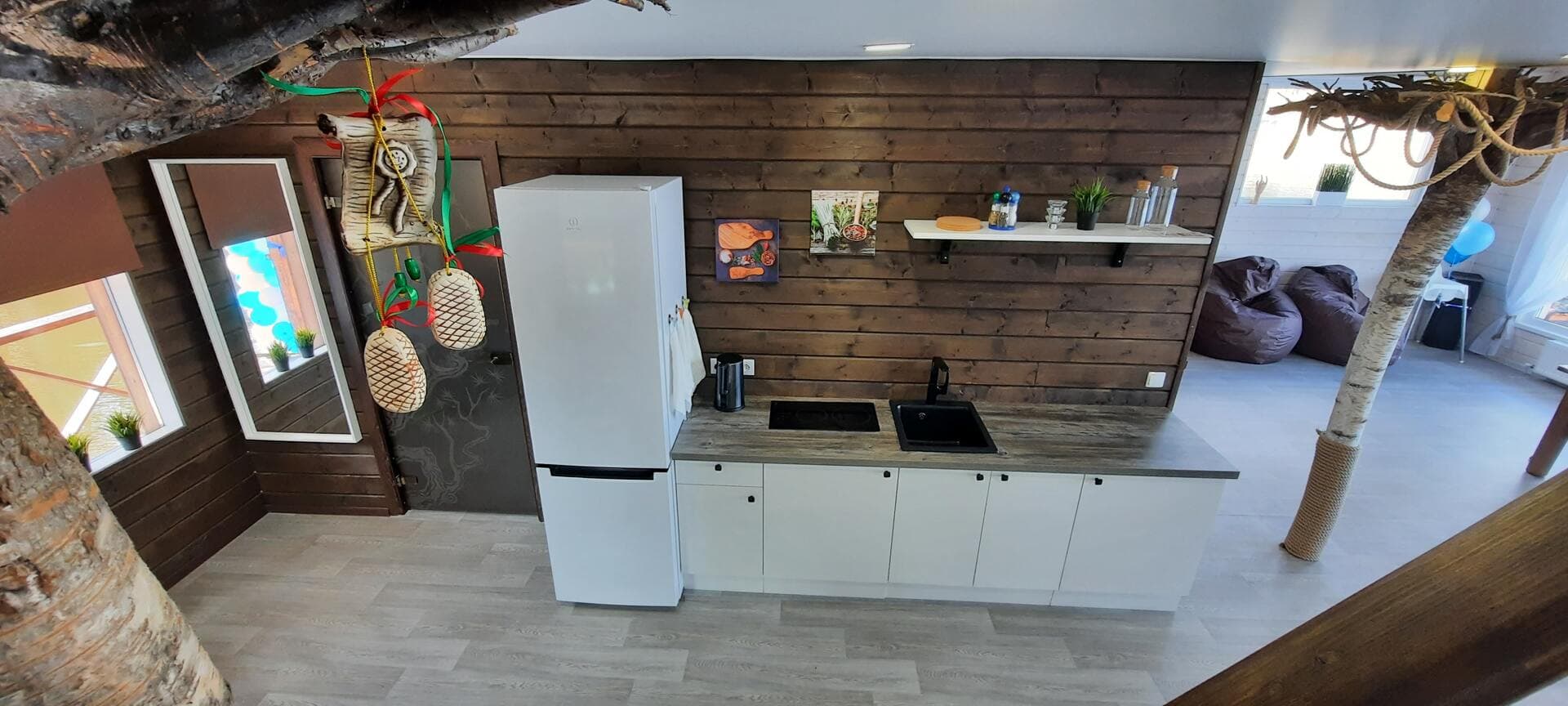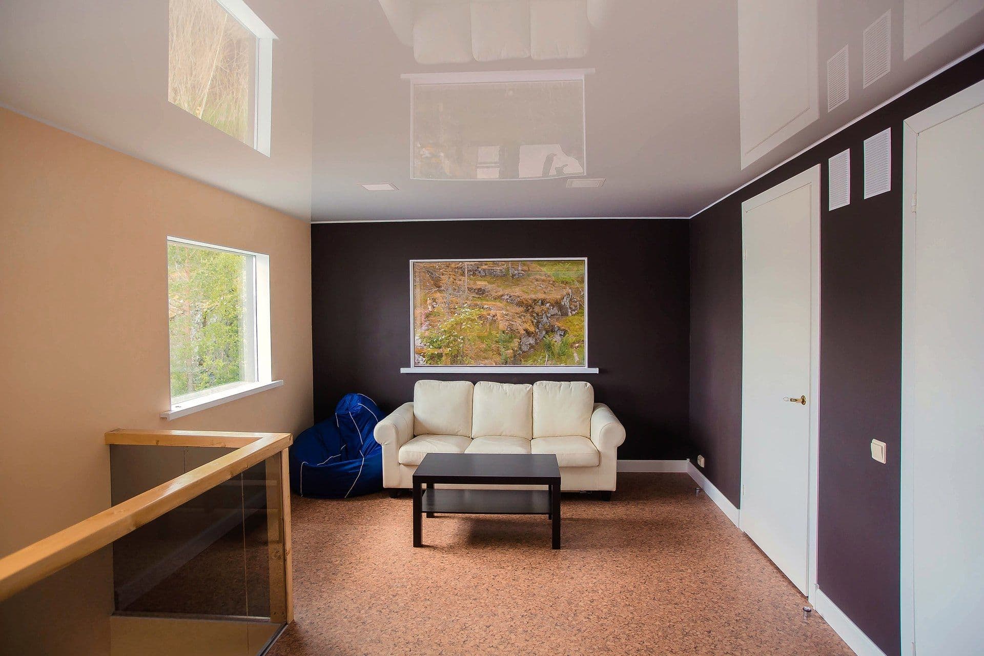 Большой светлый зал на первом этаже с высоким 5-метровым потолком отлично подходит для отдыха компанией. Здесь же есть аккустическая система с Bluetooth.