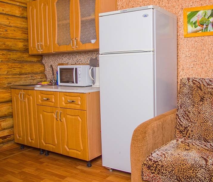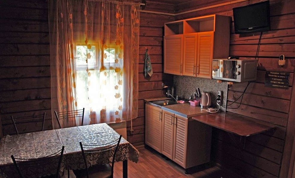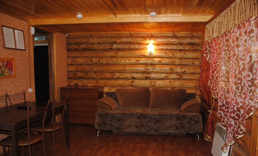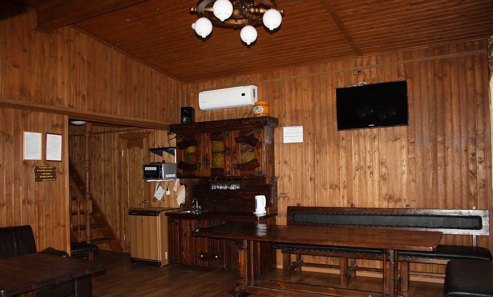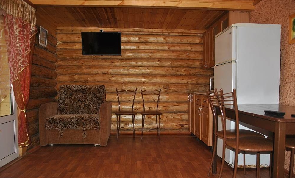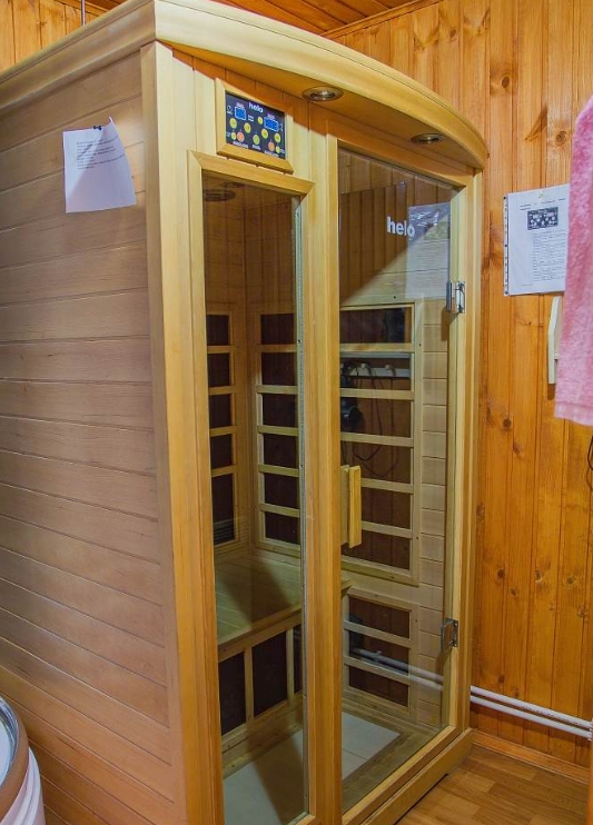 Небольшая гостиная с кухонным уголком (холодильник, микроволновка, чайник, посуда), ТВ, диван, туалет, душ, инфракрасная сауна.