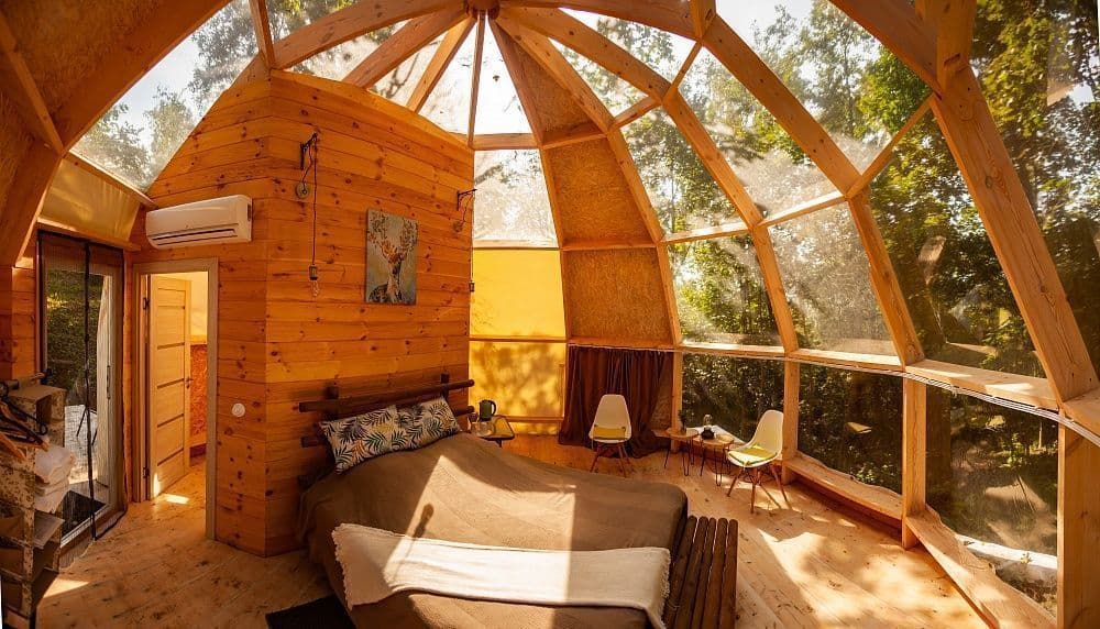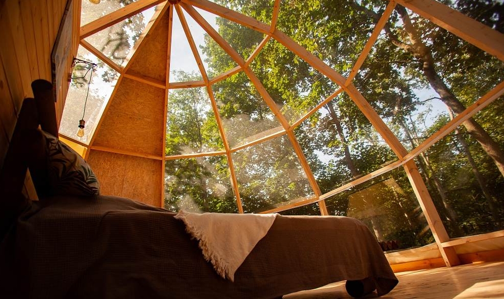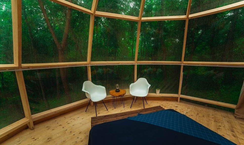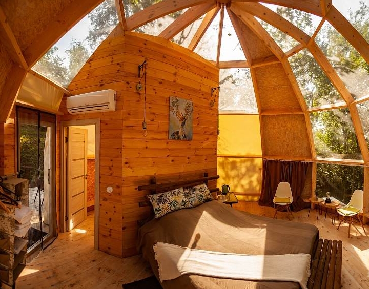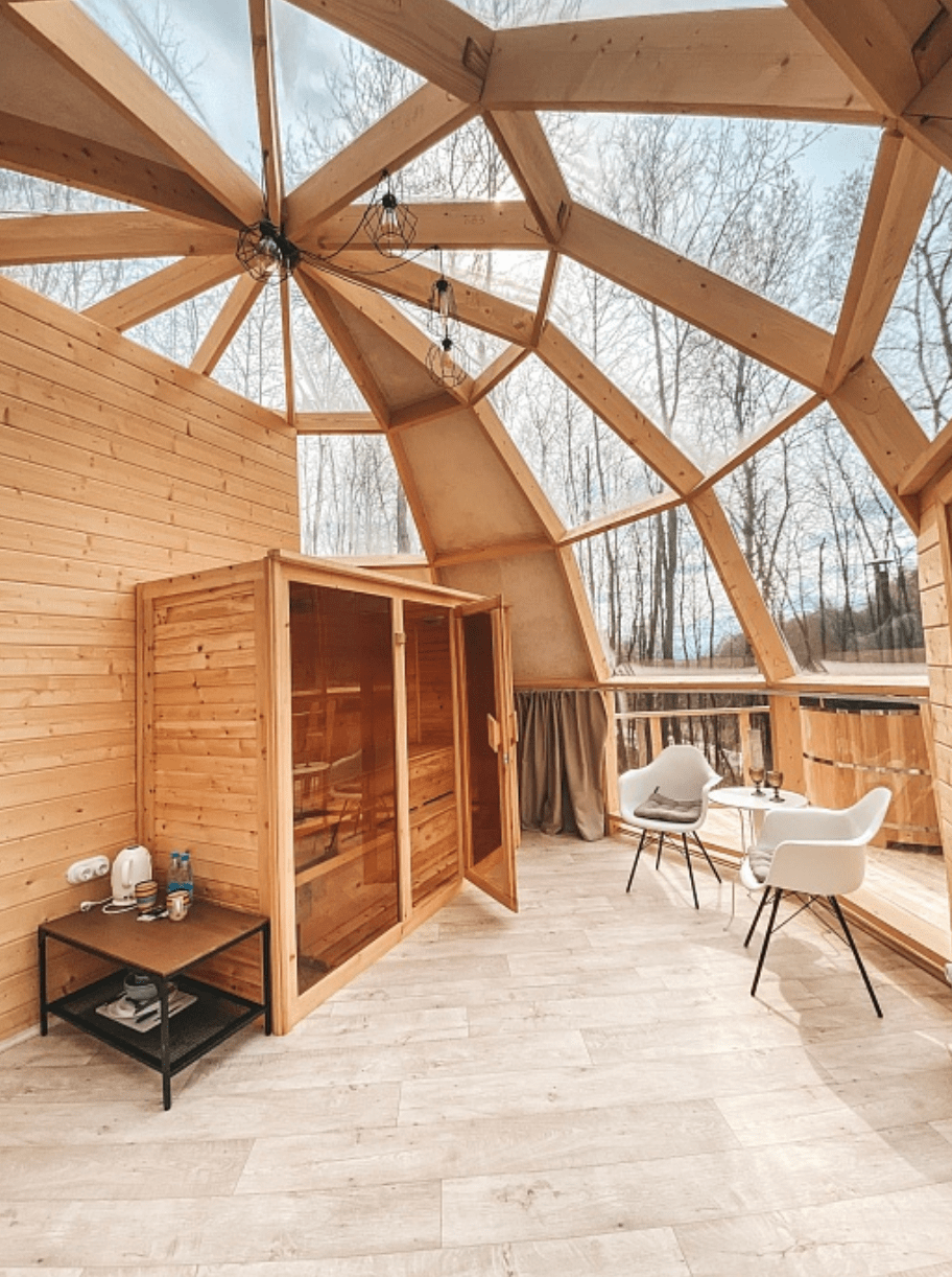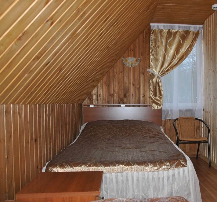 Небольшая гостиная с кухонным уголком (холодильник, микроволновка, чайник, посуда), ТВ, диван, туалет, душ, инфракрасная сауна.