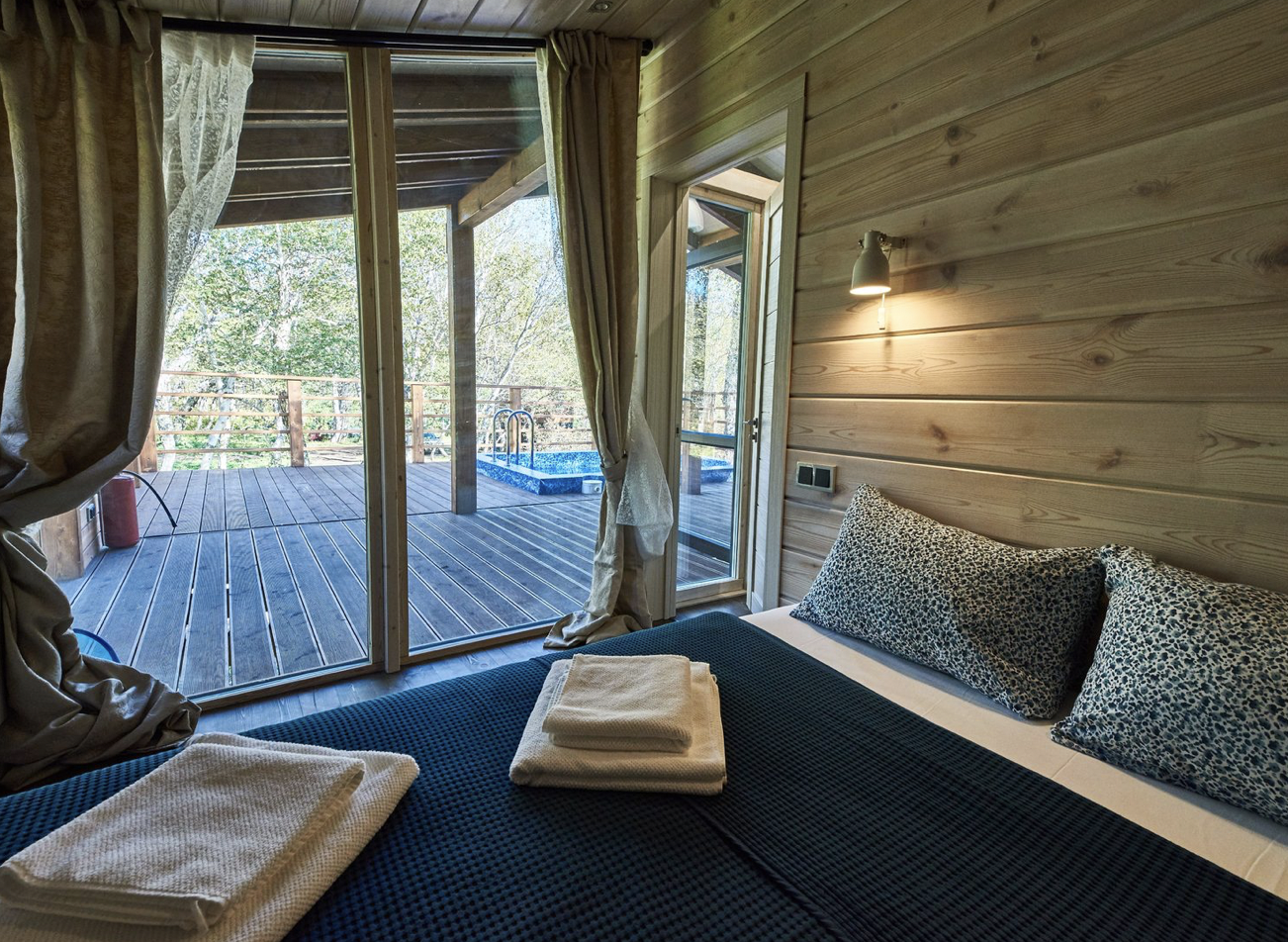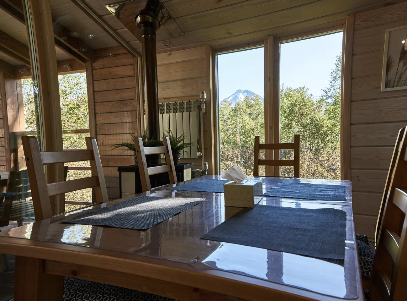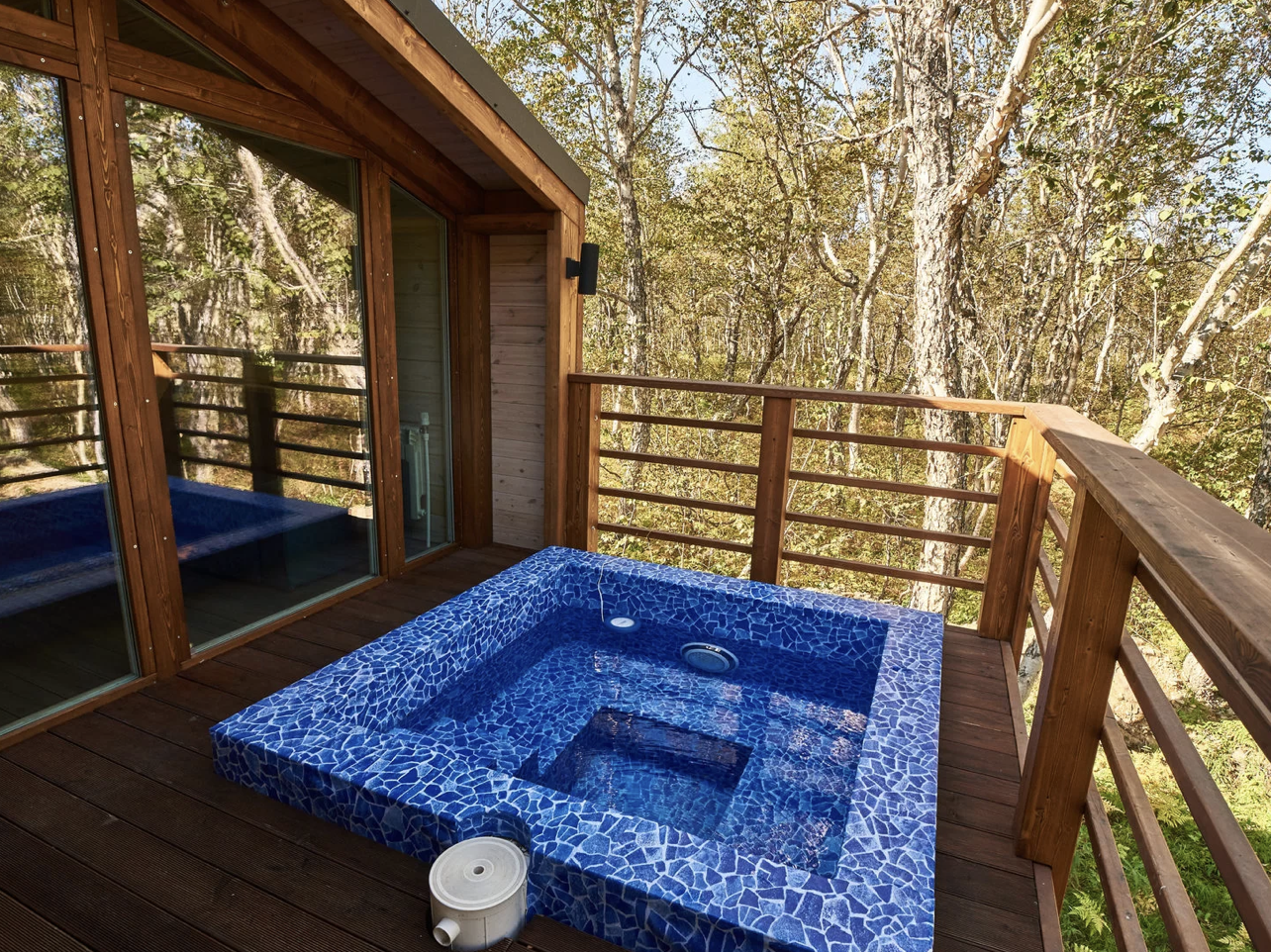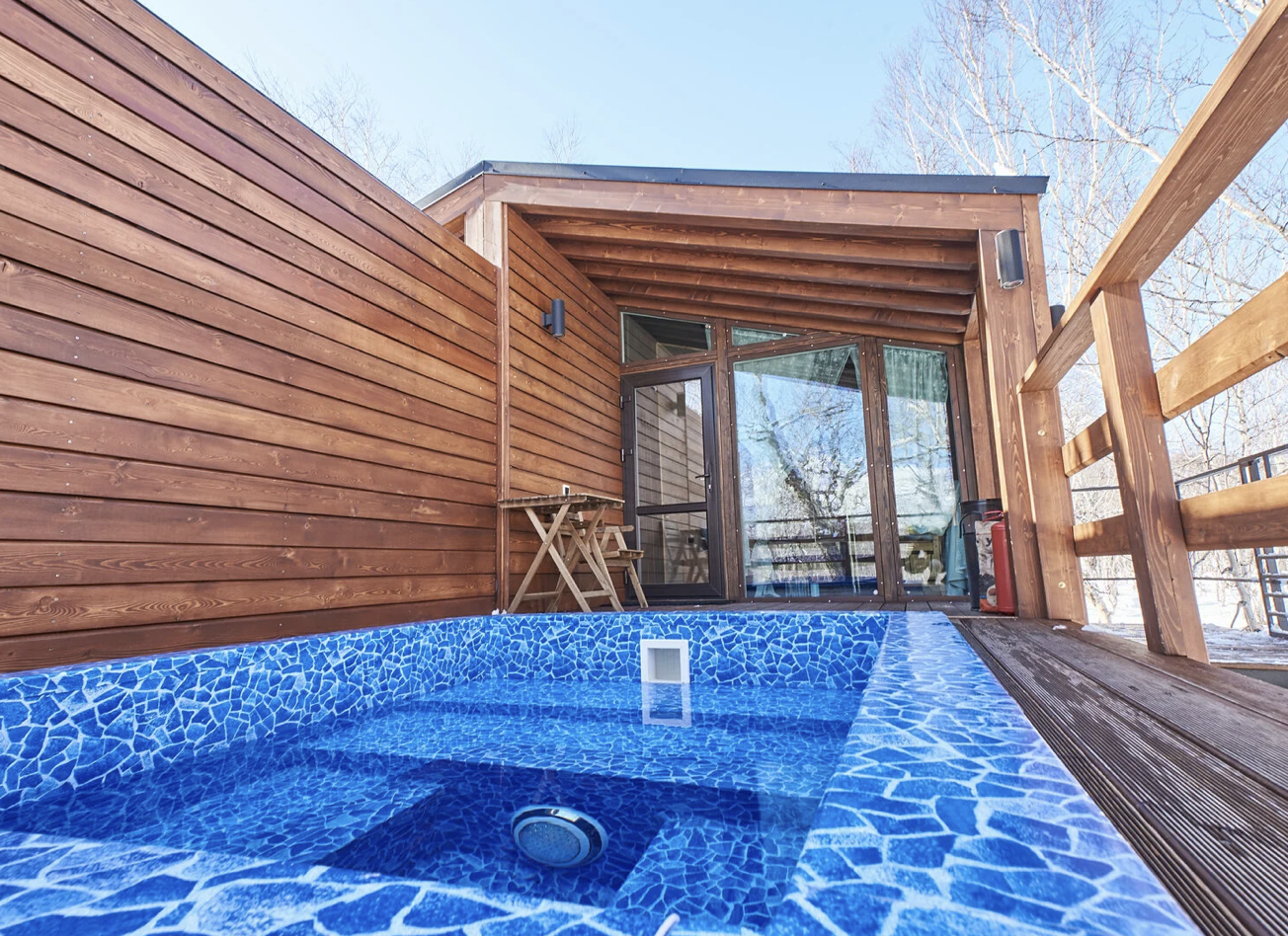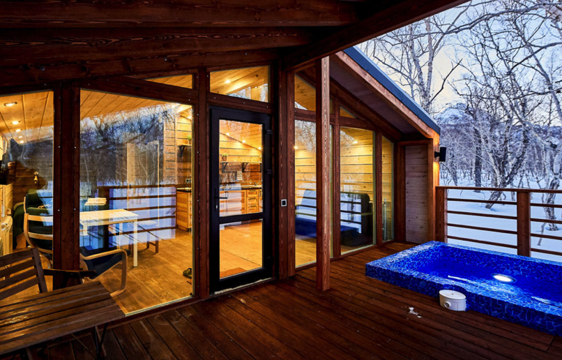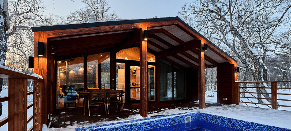 Уютное шале, выполненное в скандинавском стиле с панорамными окнами, террасой и индивидуальным бассейном с термальной водой, окружённое нетронутой человеком камчатской природой. Панорамные окна шале дают возможность в полной мере насладиться видами на камчатские вулканы, горы и лес.