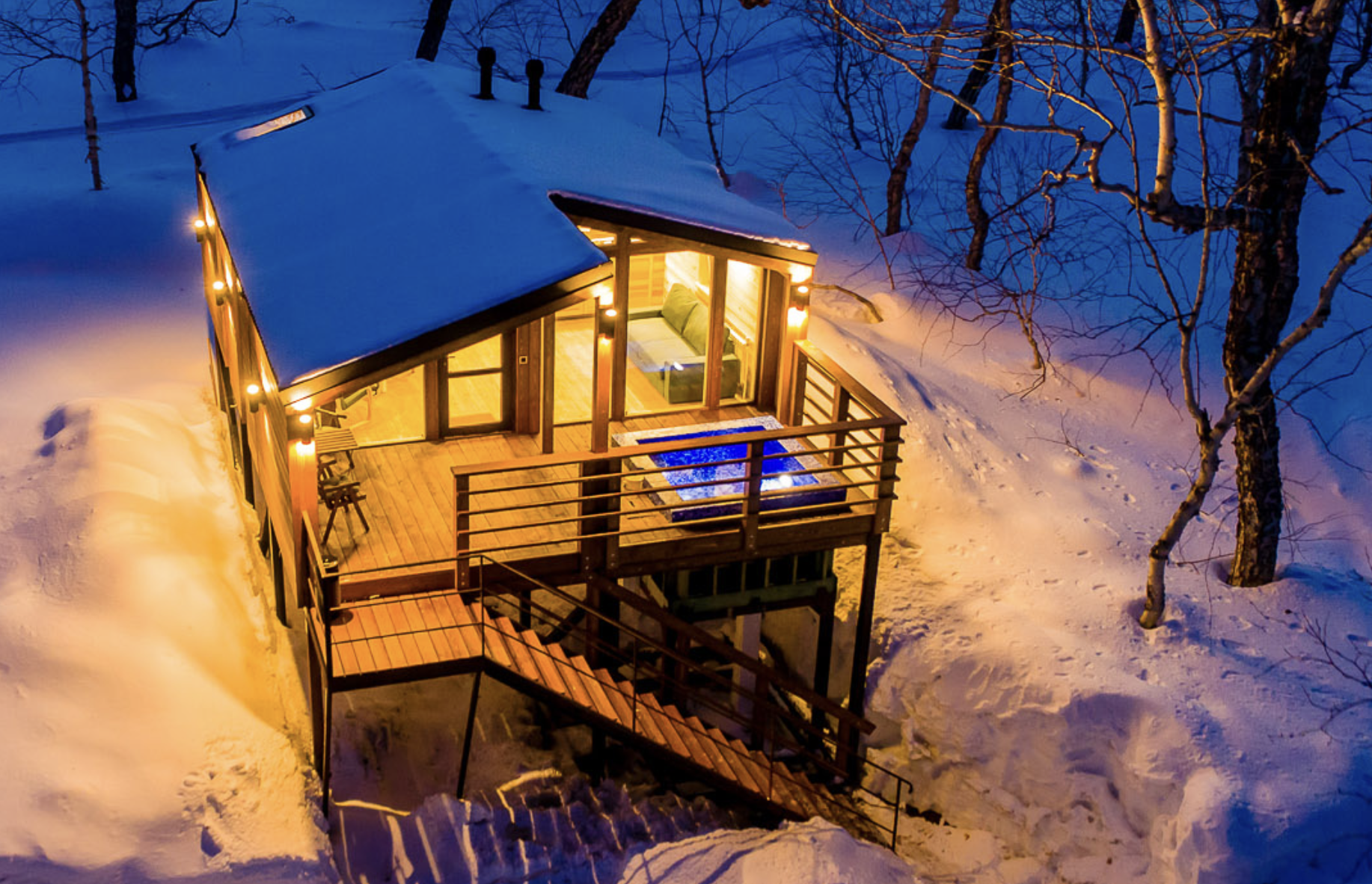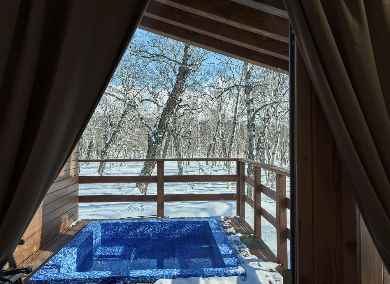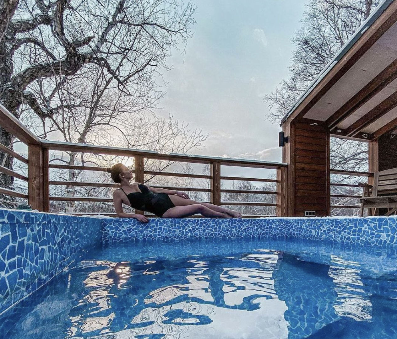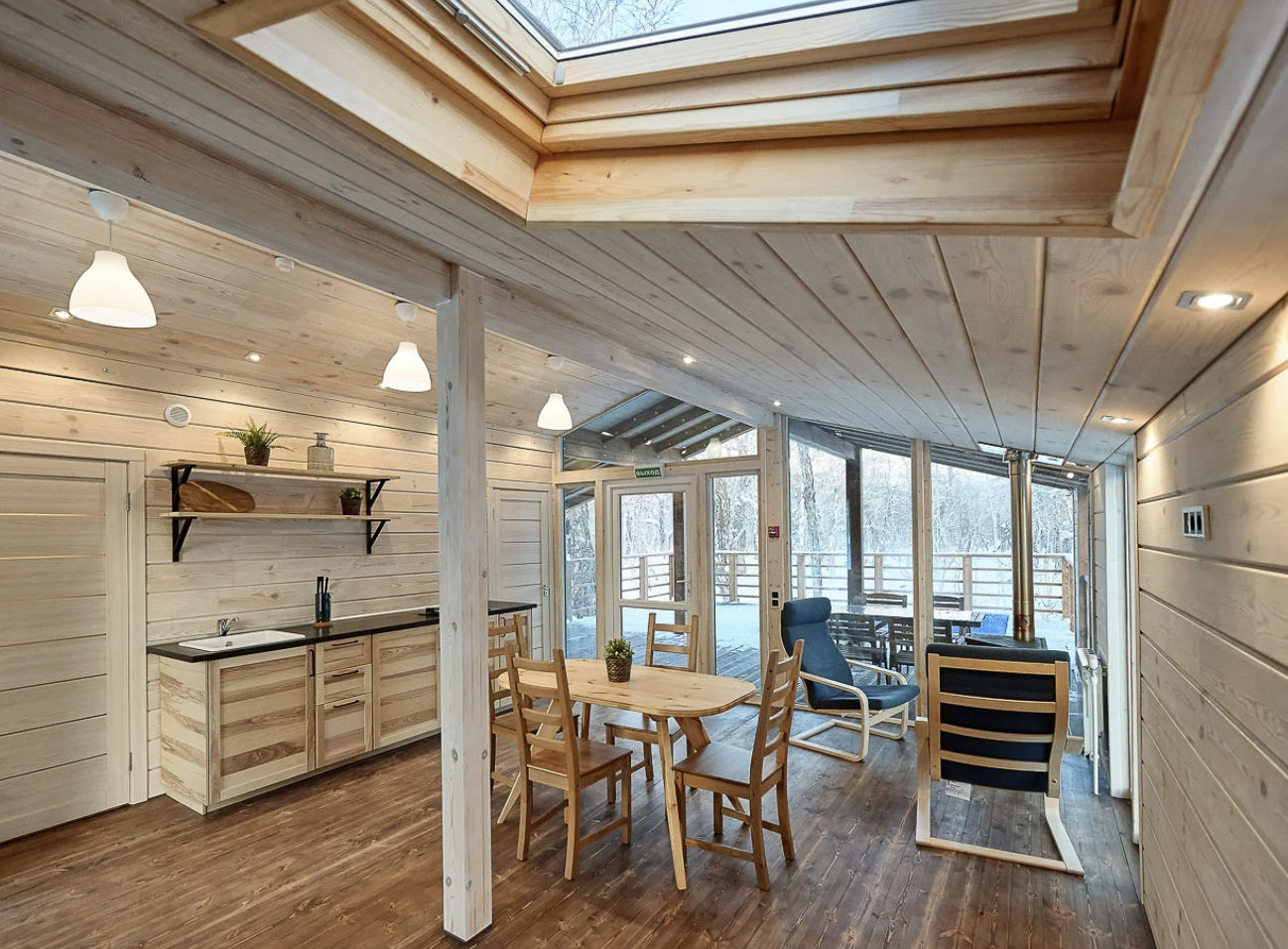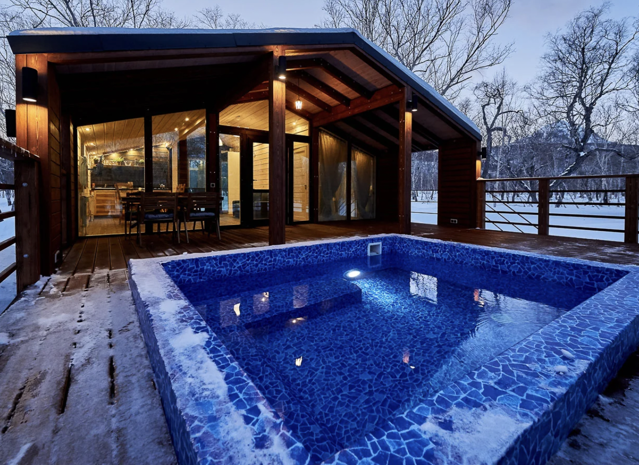 Уютное шале, выполненное в скандинавском стиле с панорамными окнами, террасой и индивидуальным бассейном с термальной водой, окружённое нетронутой человеком камчатской природой. Панорамные окна шале дают возможность в полной мере насладиться видами на камчатские вулканы, горы и лес.