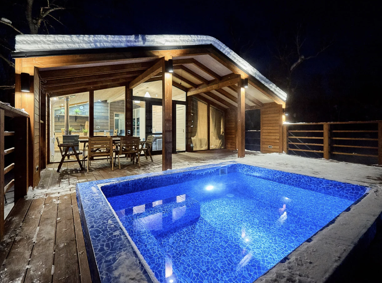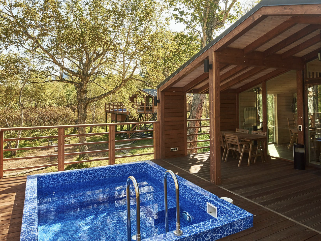 Каждое шале парк-отеля построено в скандинавском стиле, имеет панорамные окна и индивидуальный открытый бассейн с термальной водой.
