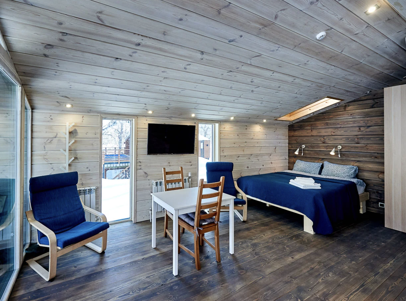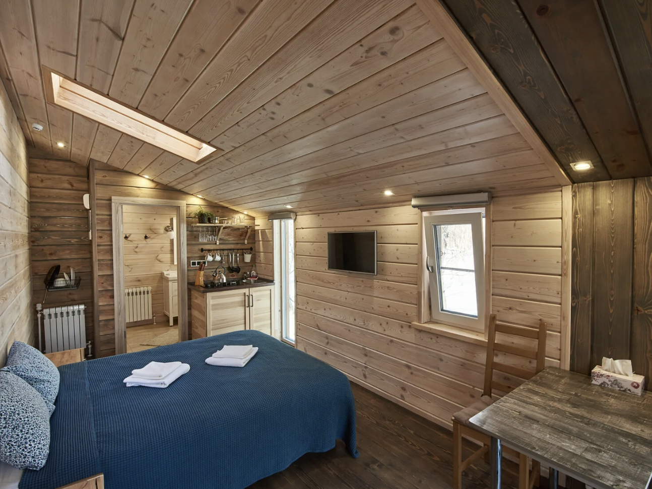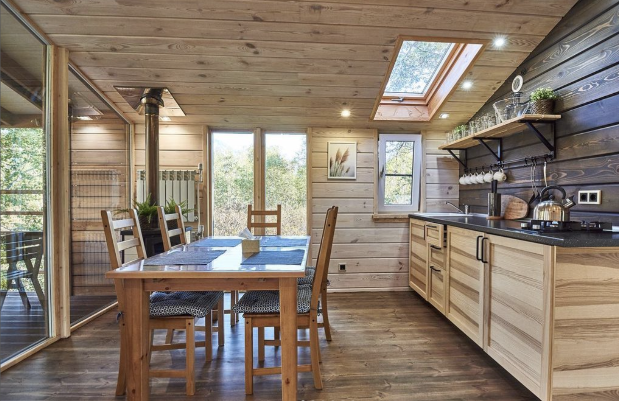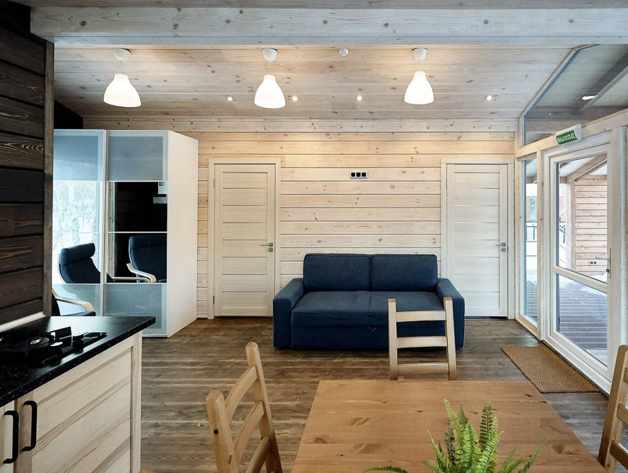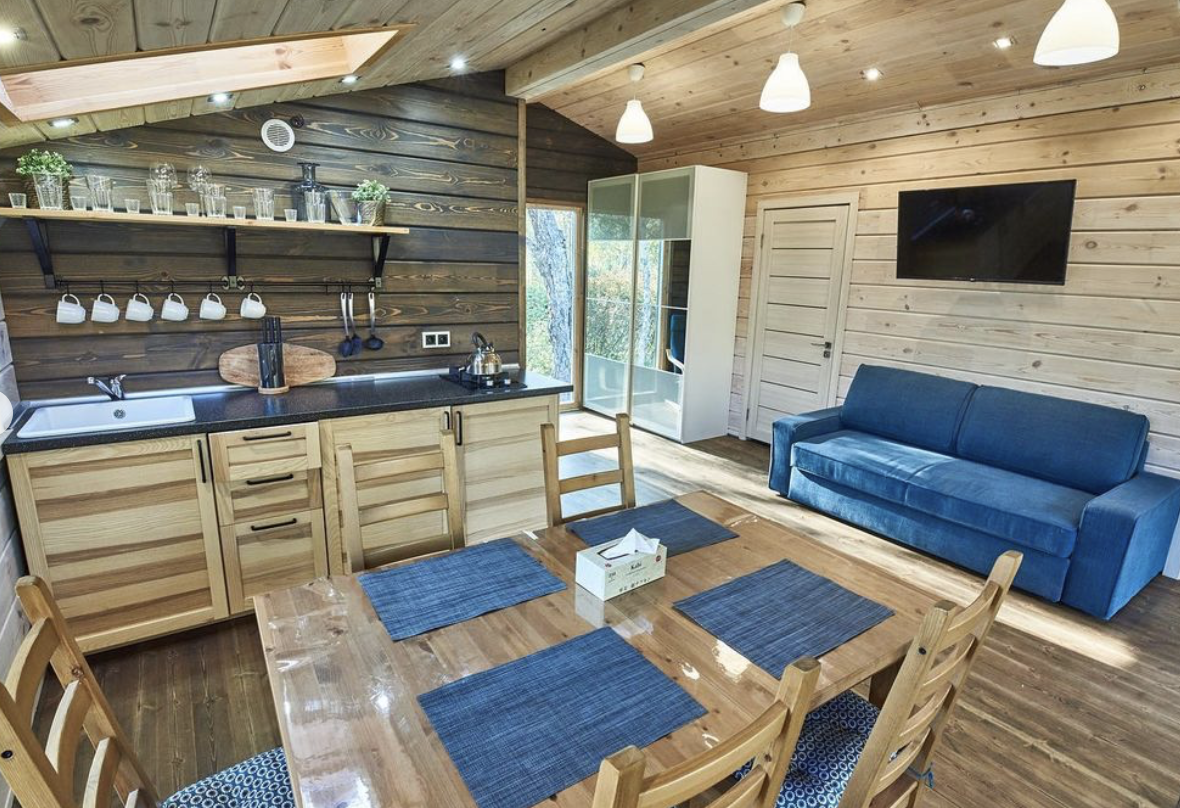 Шале состоит из двух комнат, одной спальни и зала, совмещенным с кухней. Оборудовано удобной и современной мебелью .