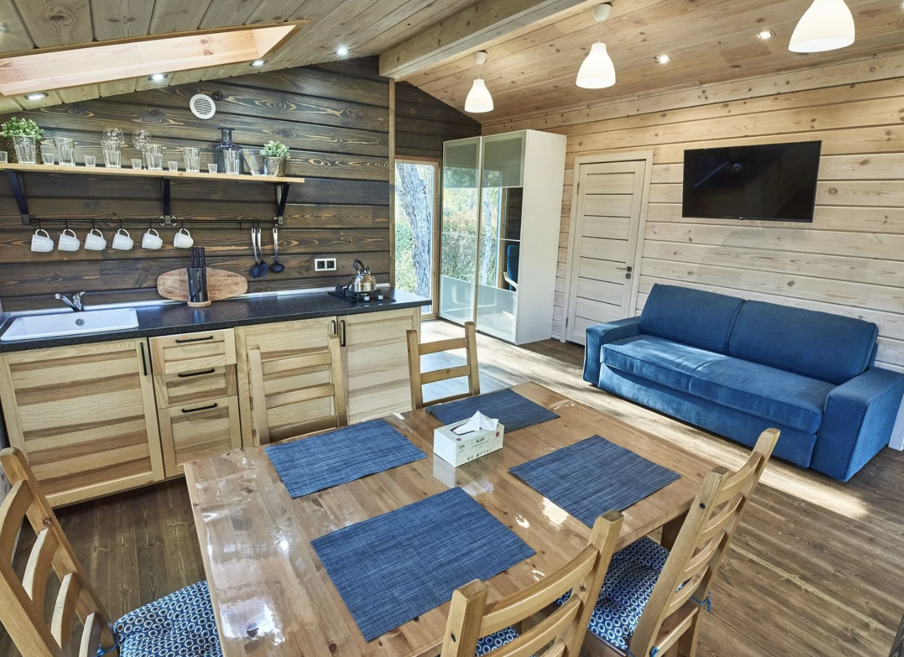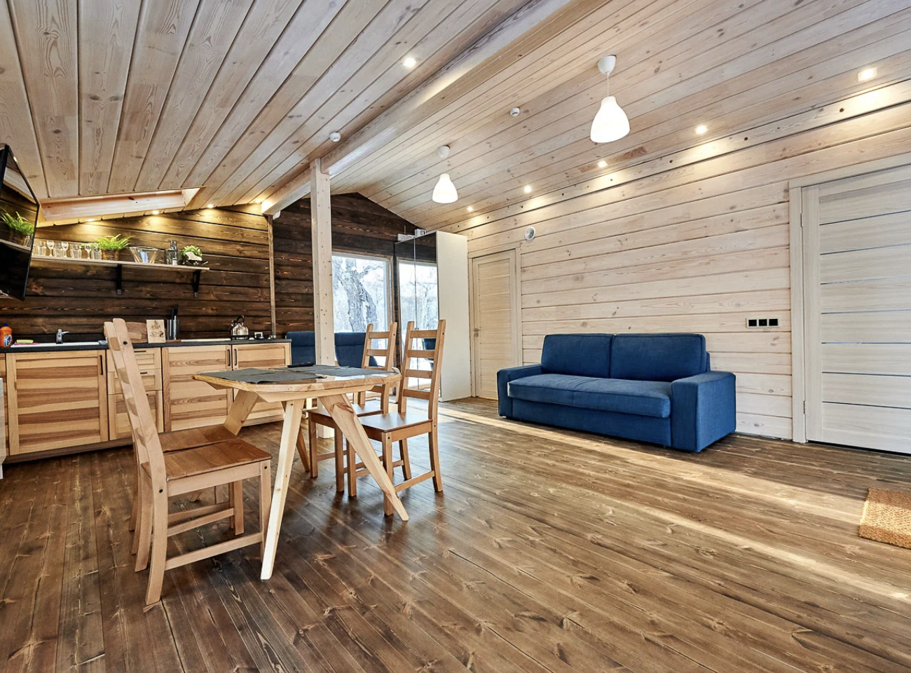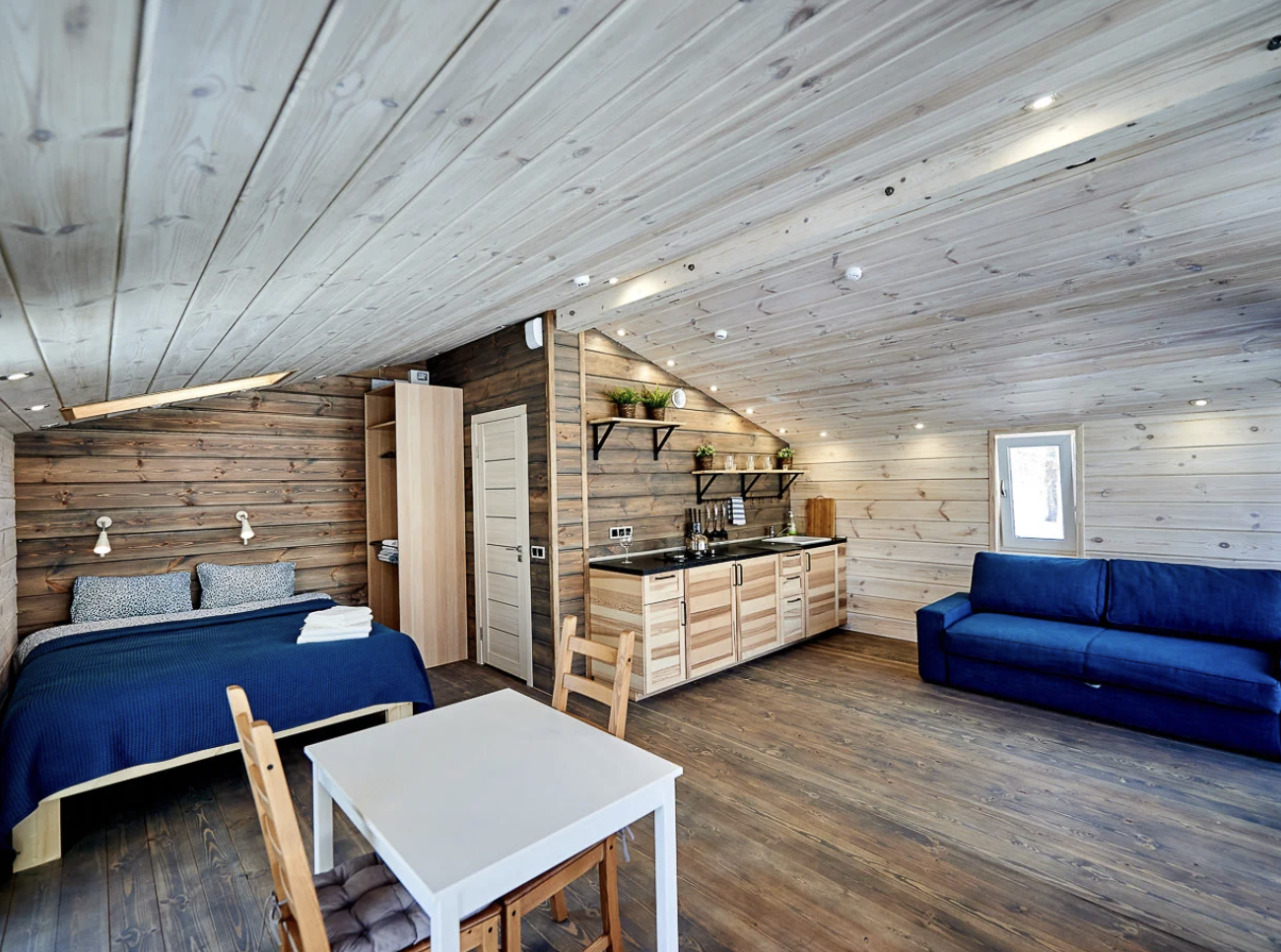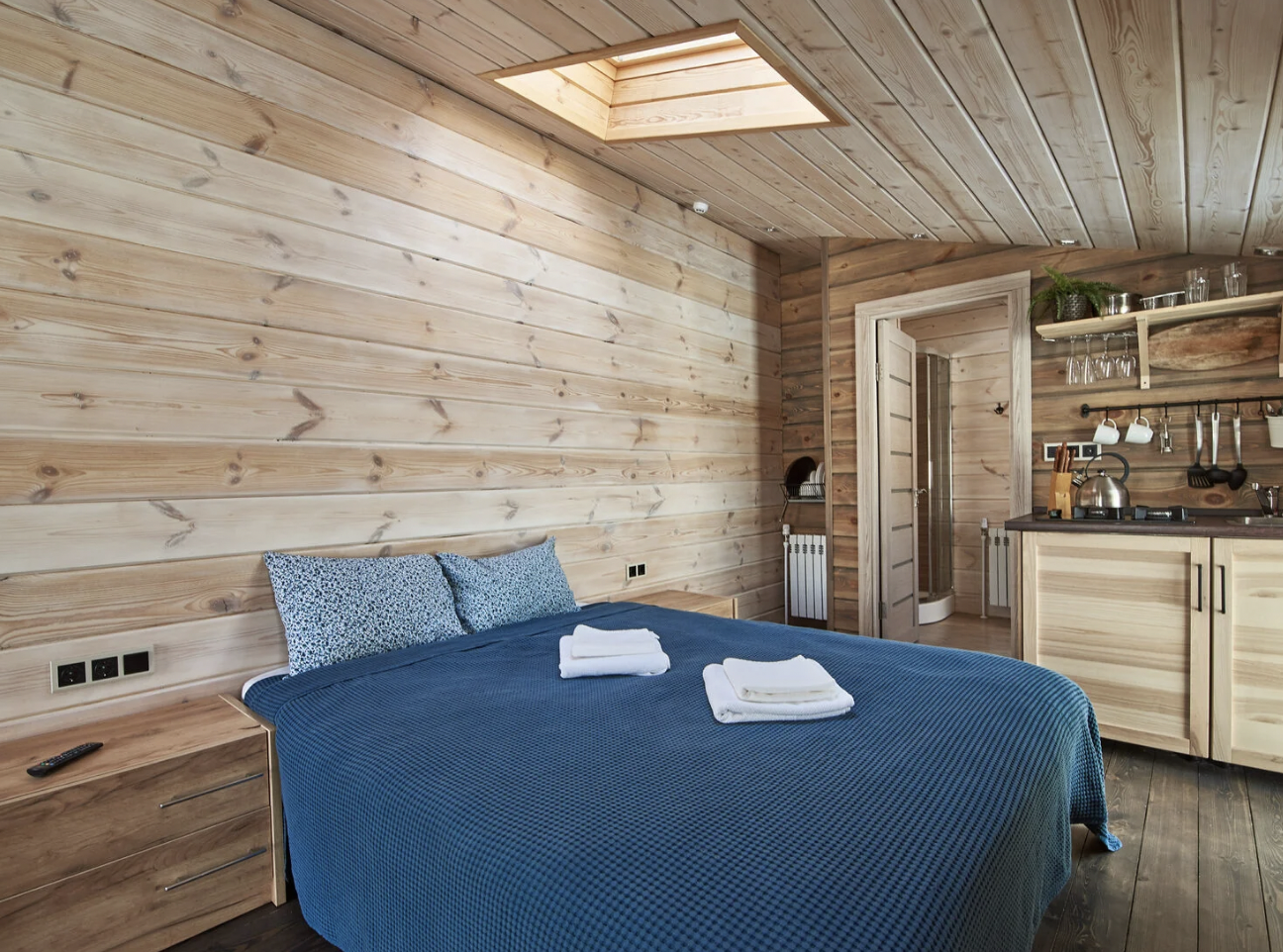 Шале состоит из двух комнат, одной спальни и зала, совмещенным с кухней. Оборудовано удобной и современной мебелью .