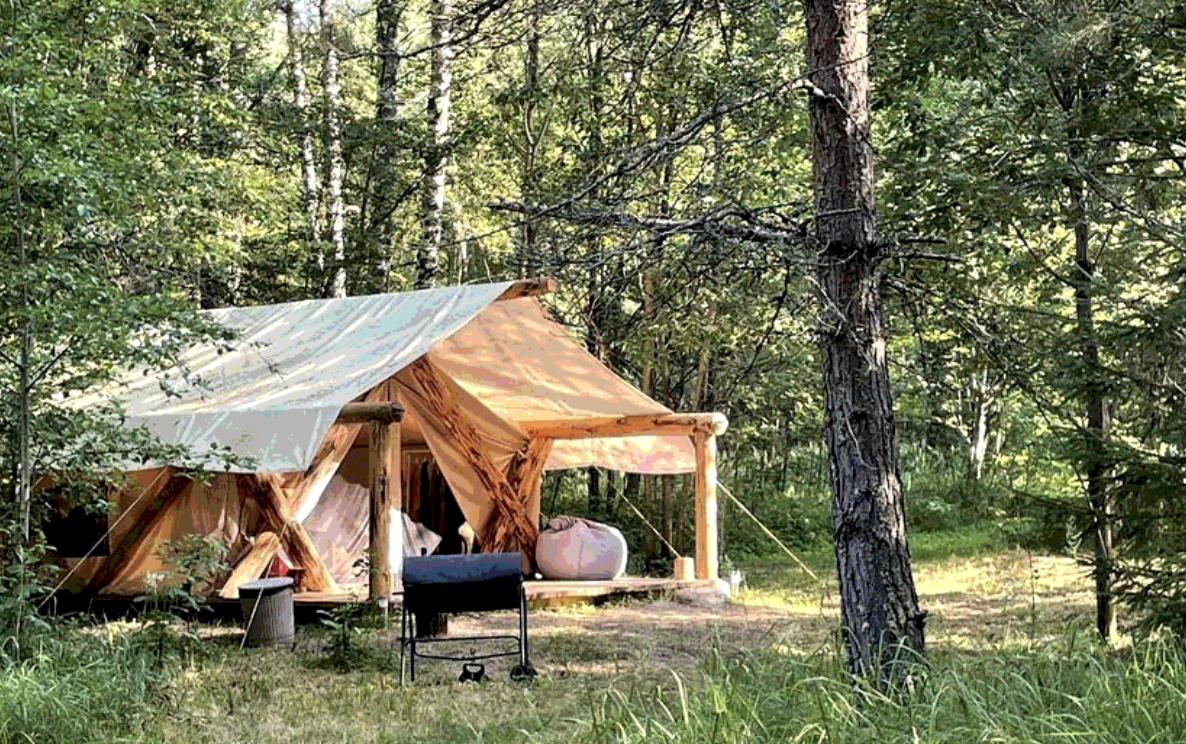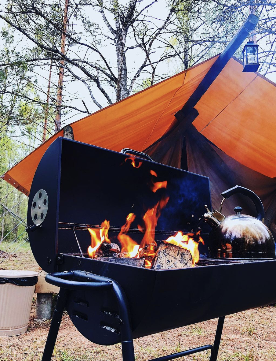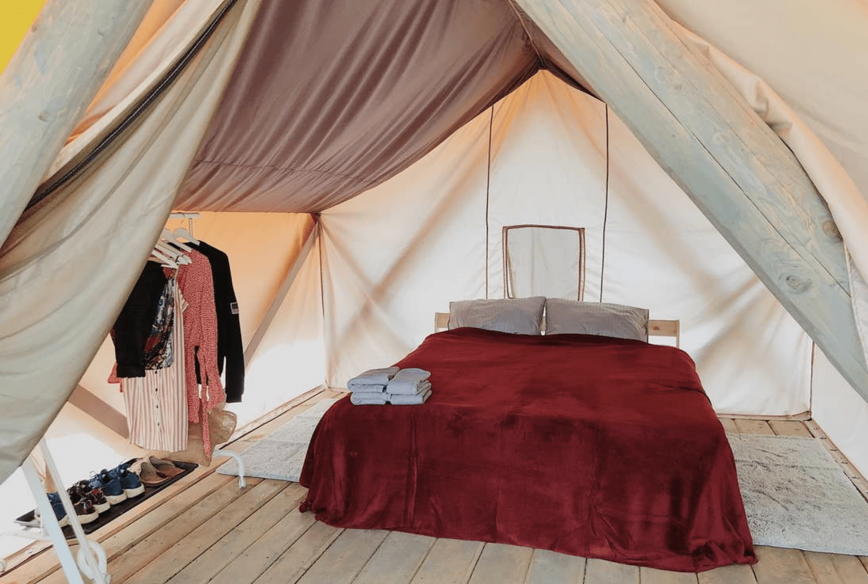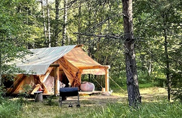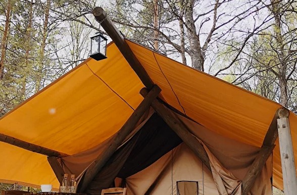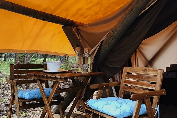 В каждом глэмпе расположена большая кровать, по желанию можно добавить еще одно спальное место. Предусмотрена зона барбекю со столом и угольным грилем.