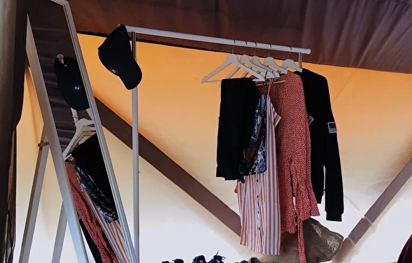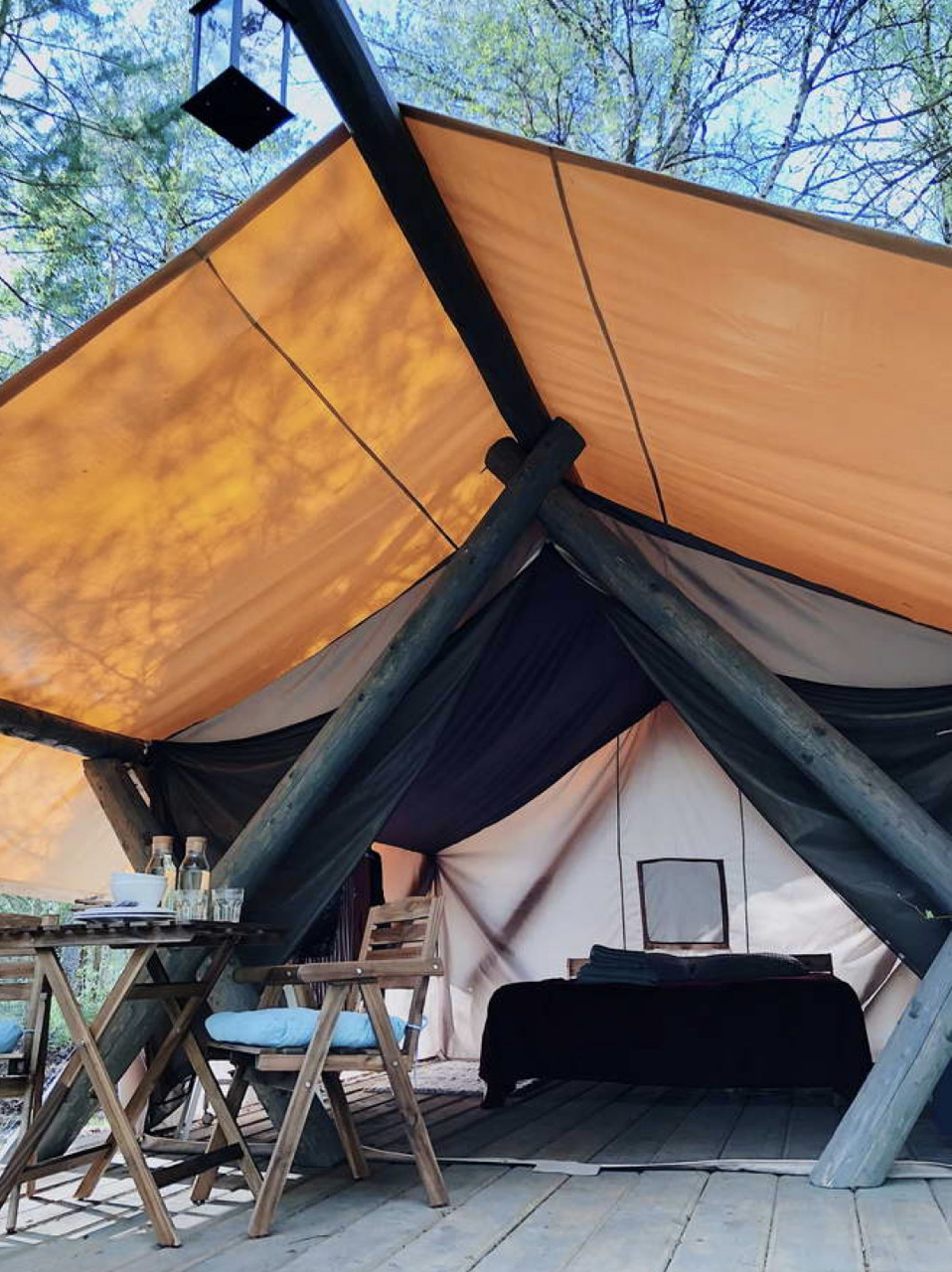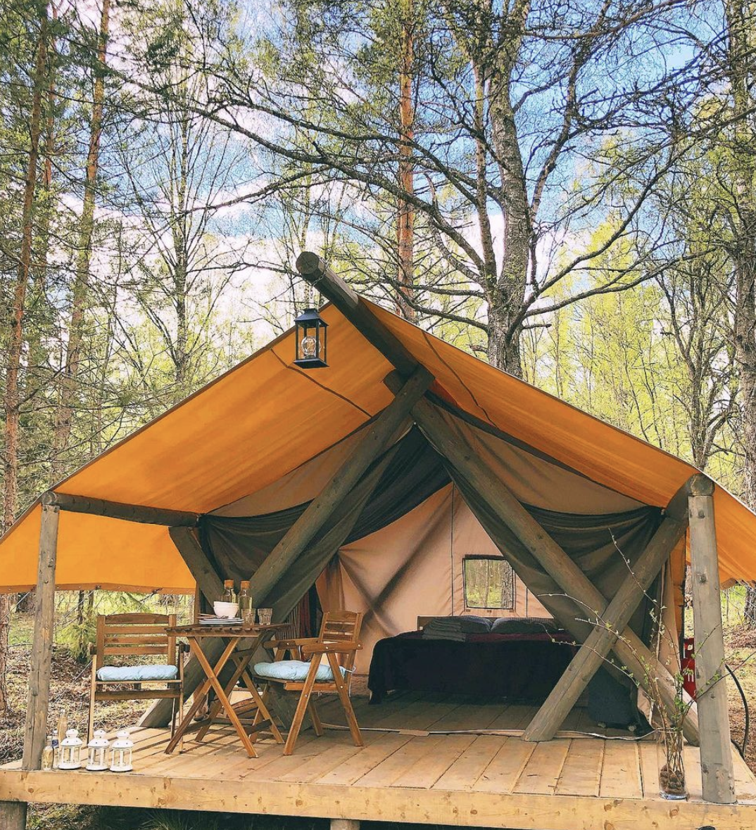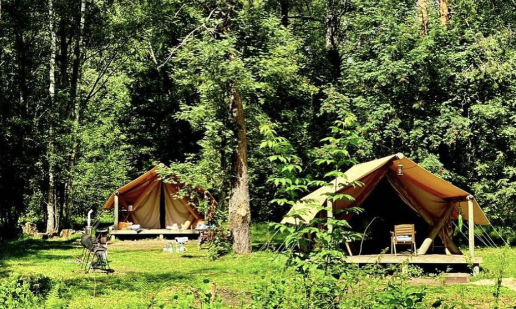 В каждом глэмпе расположена большая кровать, по желанию можно добавить еще одно спальное место. Предусмотрена зона барбекю со столом и угольным грилем.
