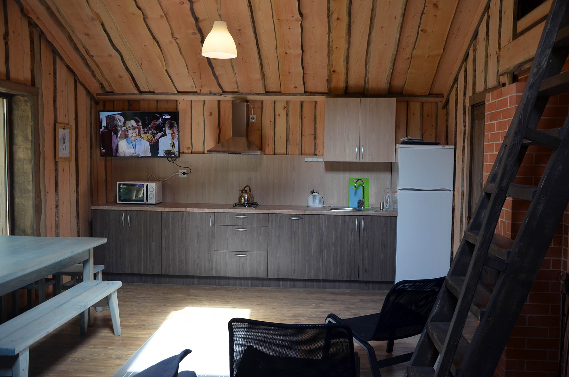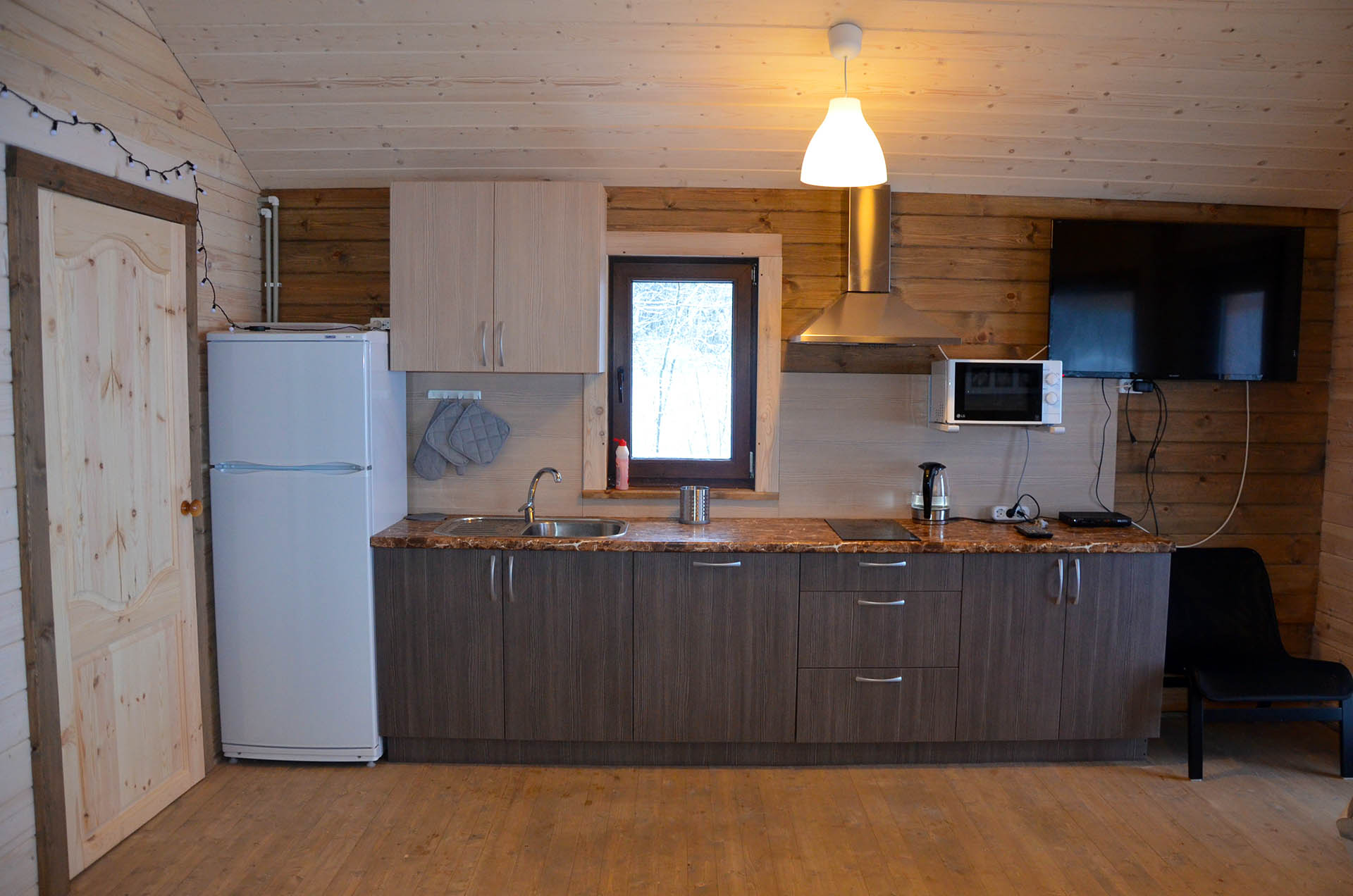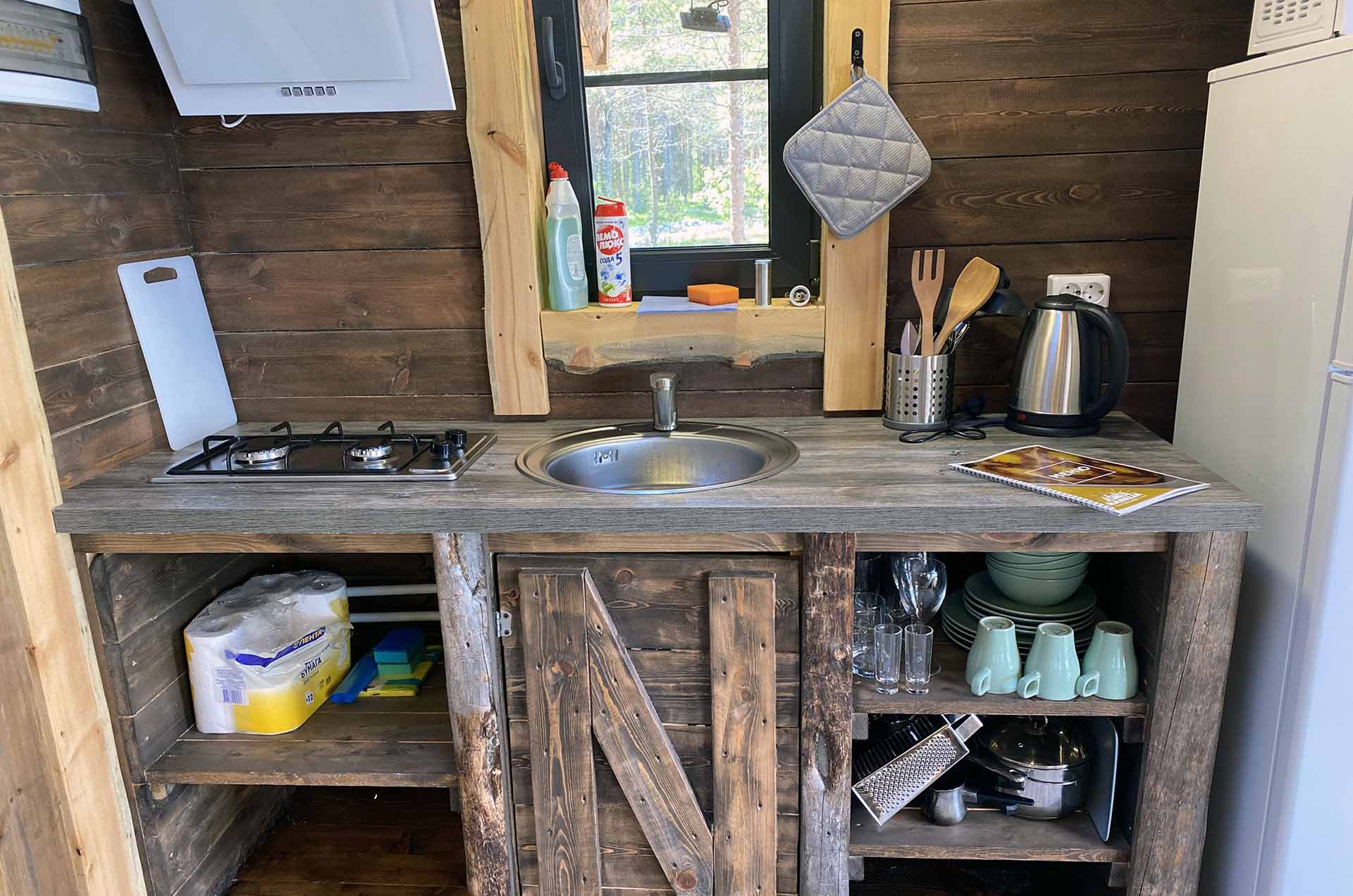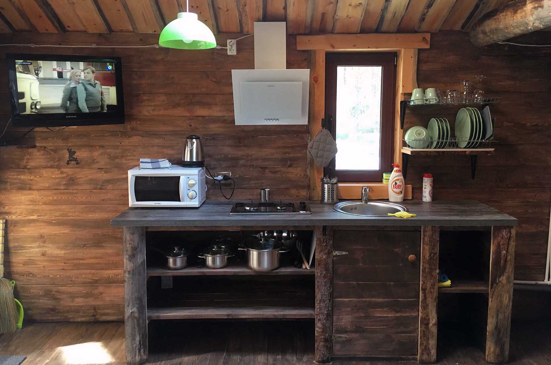 - Кухня:Холодильник; Микроволновка; Варочная поверхность; Чайник; Набор посуды; Принадлежности для барбекю