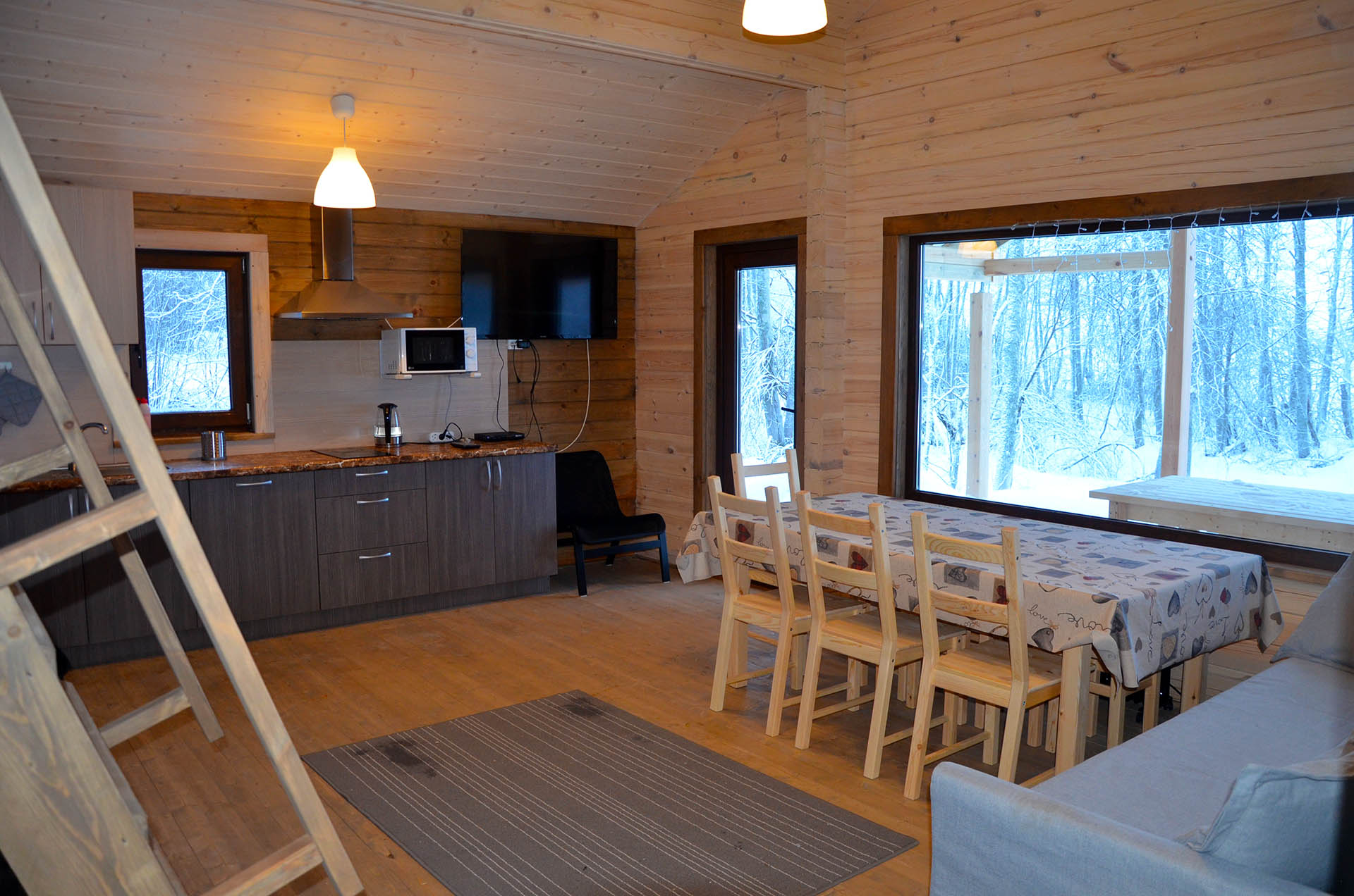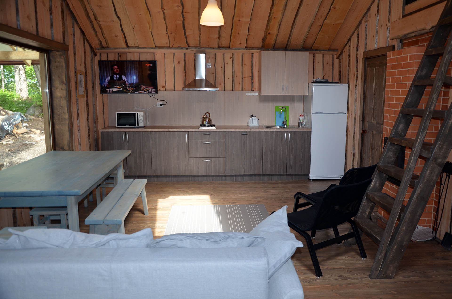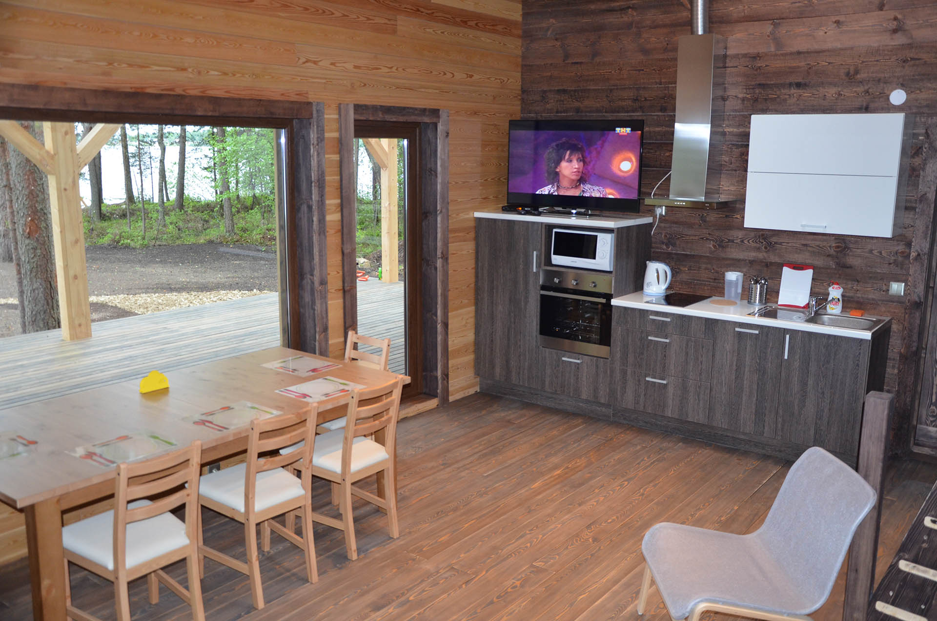 - Кухня:Холодильник; Микроволновка; Варочная поверхность; Чайник; Набор посуды; Принадлежности для барбекю