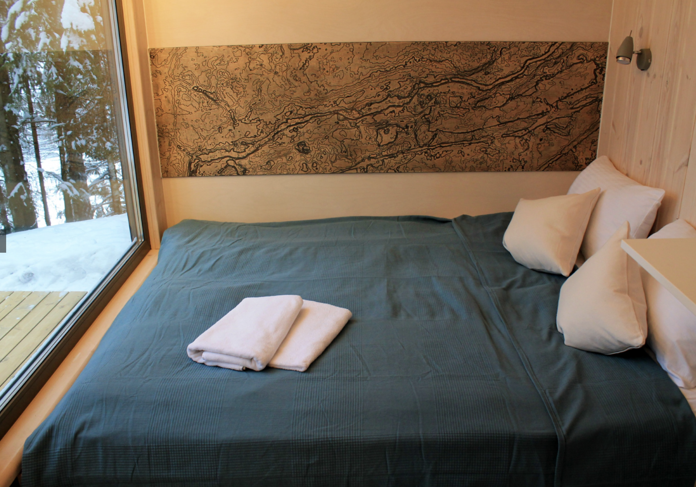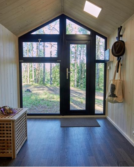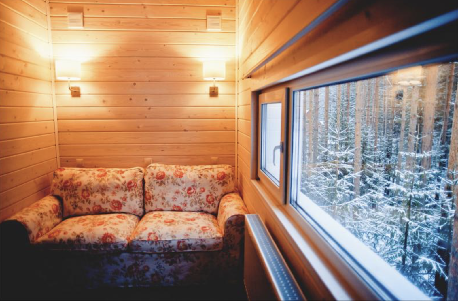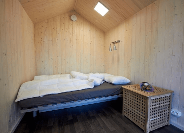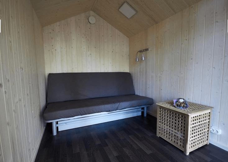 Внутри удобный двухместный раскладной диван, постельное белье, тумбочка, вешалка для одежды, пара стульев и столик, есть электрическое освещение, обогреватель и розетки. Конструкция хижины хорошо вентилируется в жаркие летние месяцы и утеплена для самых суровых морозов.