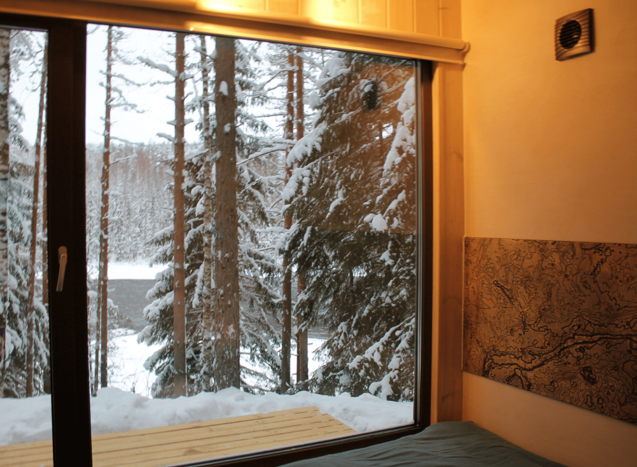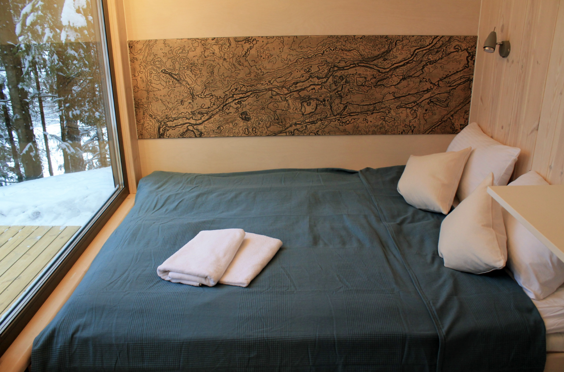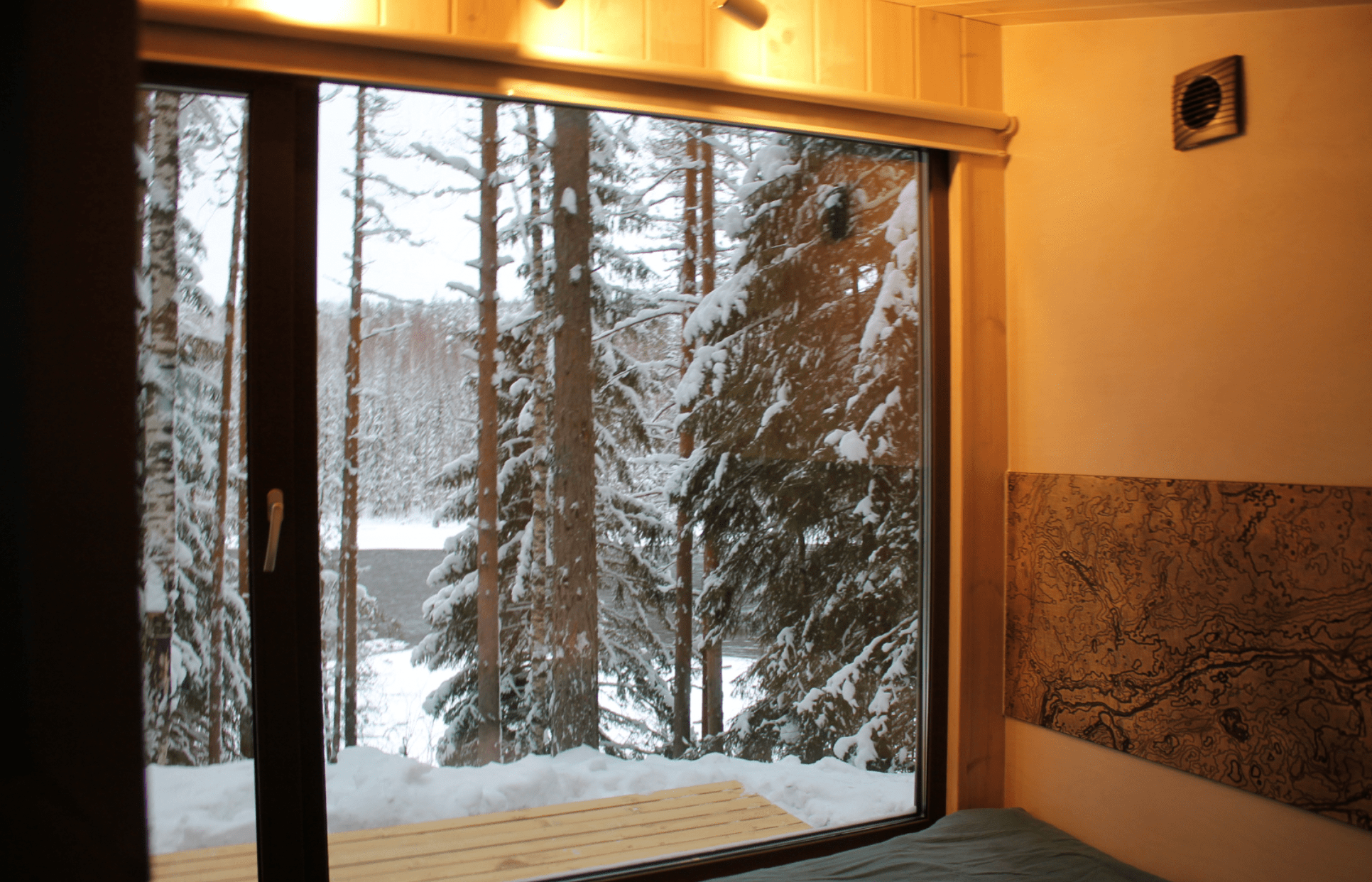 Внутри удобный двухместный раскладной диван, постельное белье, тумбочка, вешалка для одежды, пара стульев и столик, есть электрическое освещение, обогреватель и розетки. Конструкция хижины хорошо вентилируется в жаркие летние месяцы и утеплена для самых суровых морозов.