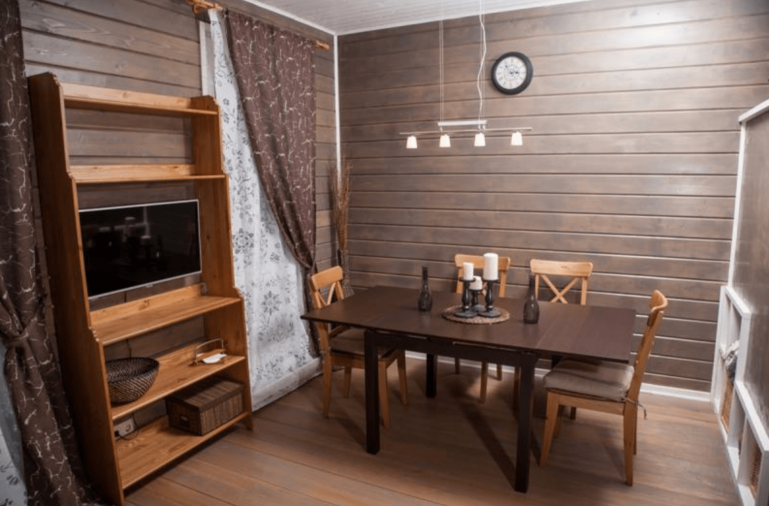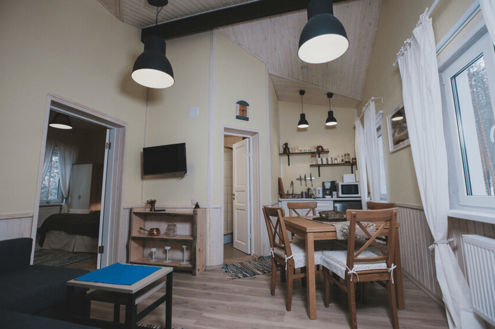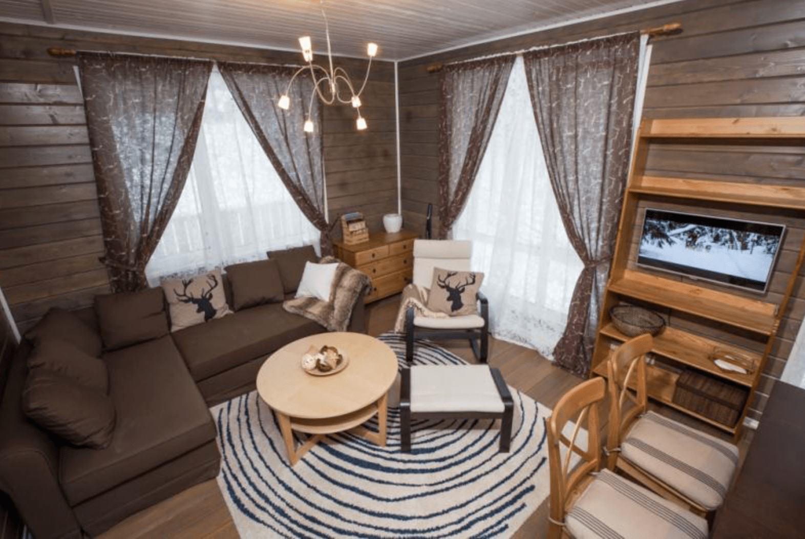 В отделке интерьера использовано натуральное дерево – сосна и лиственница. Оформление выдержано в скандинавском стиле, каждая деталь здесь тщательно продумана.