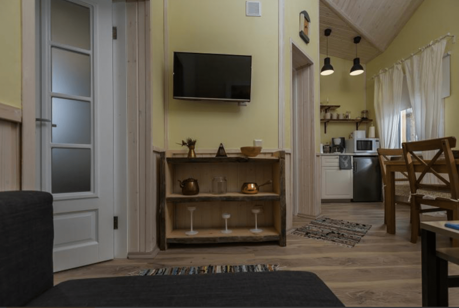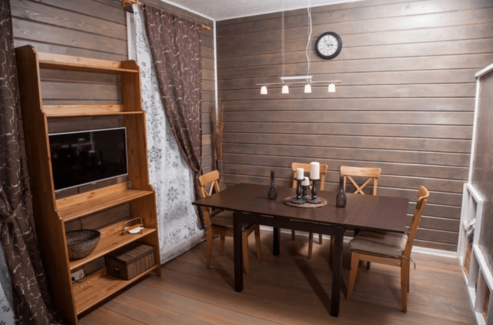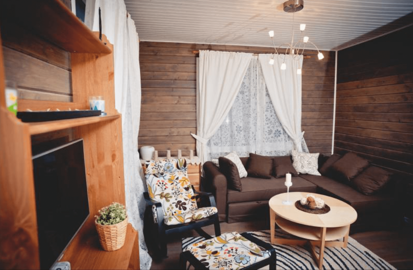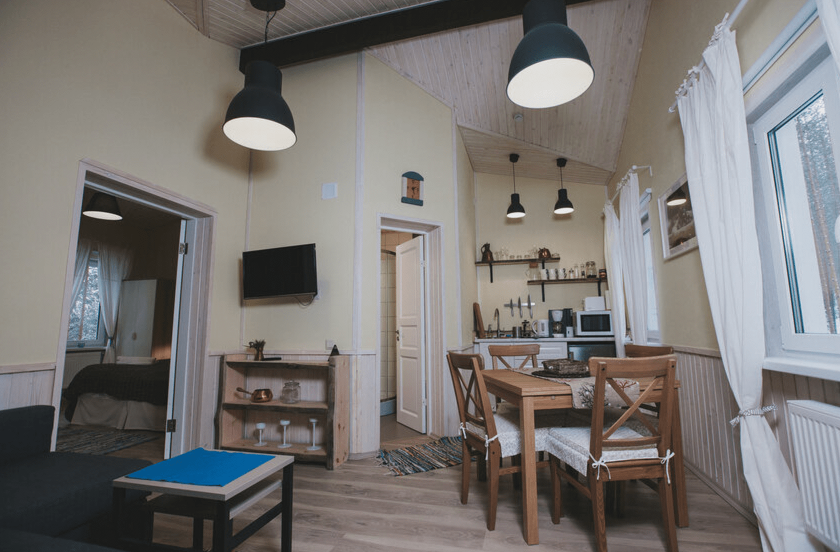 В отделке интерьера использовано натуральное дерево – сосна и лиственница. Оформление выдержано в скандинавском стиле, каждая деталь здесь тщательно продумана.