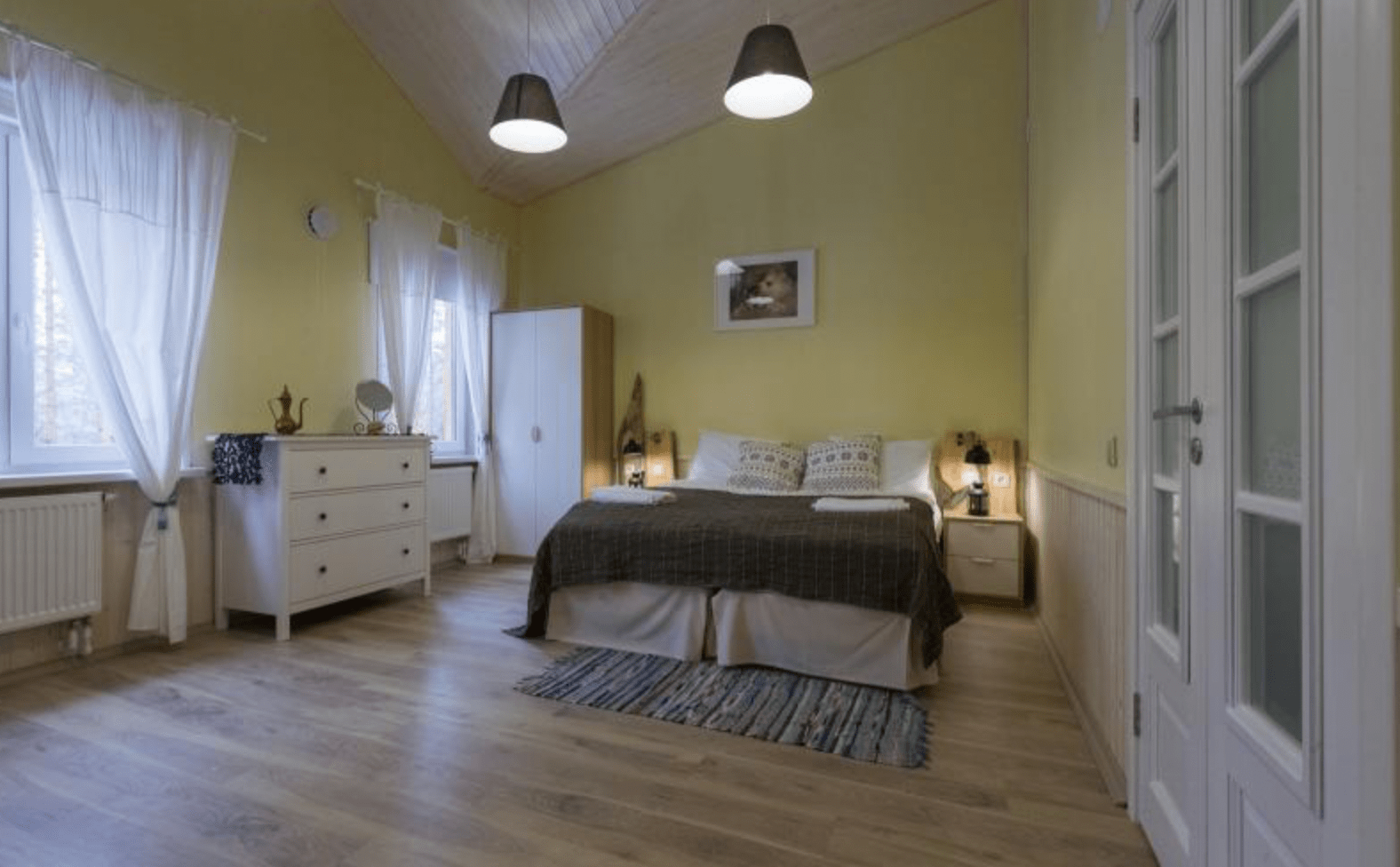 Как и во всем комплексе, большая двуспальная кровать при желании гостей легко трансформируется в две односпальные.