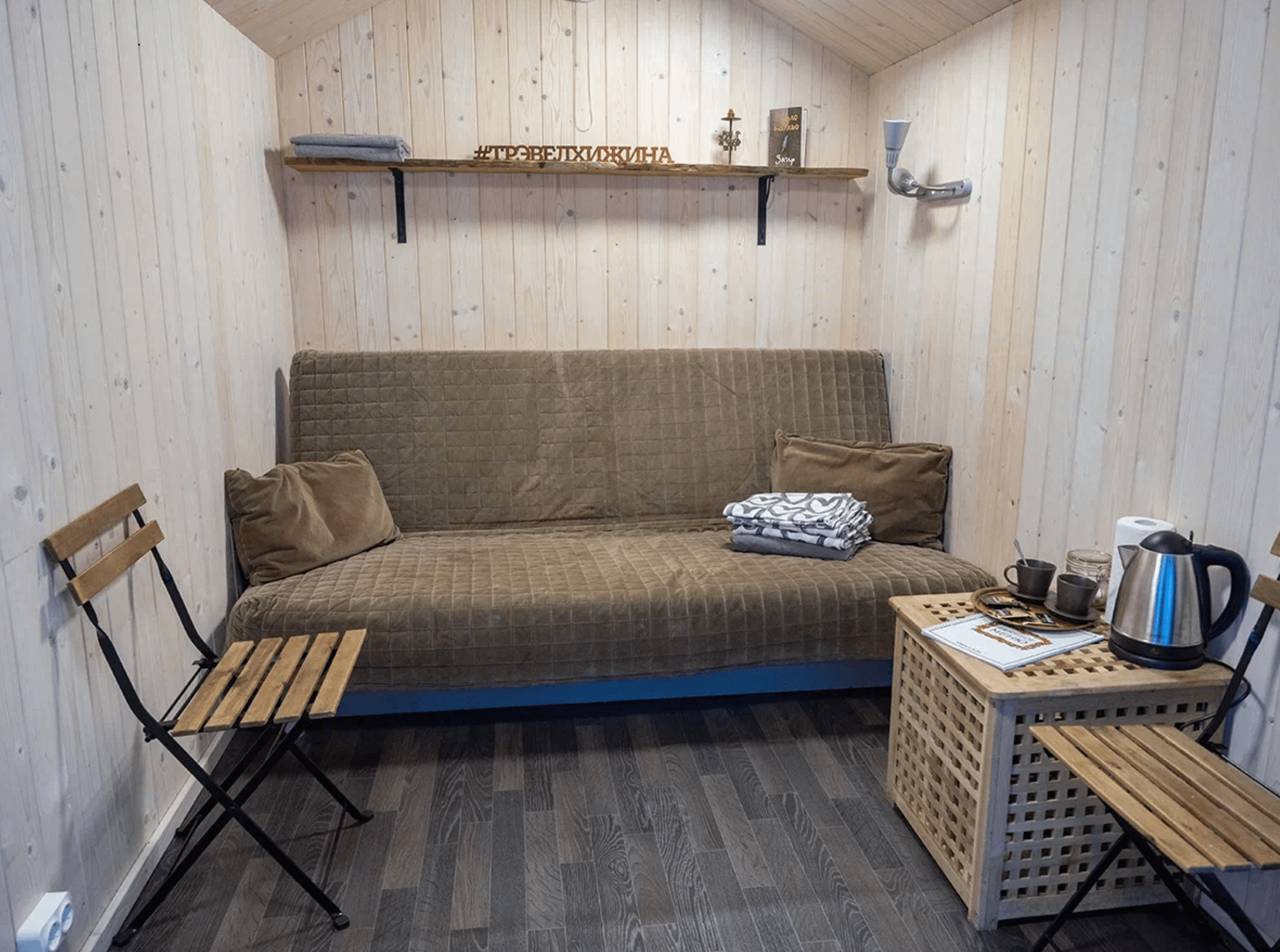 В хижине есть все необходимое для комфортного проживания вдвоем: большая удобная кровать, стеллаж для одежды, обогреватель, столик, стулья и электрический чайник.