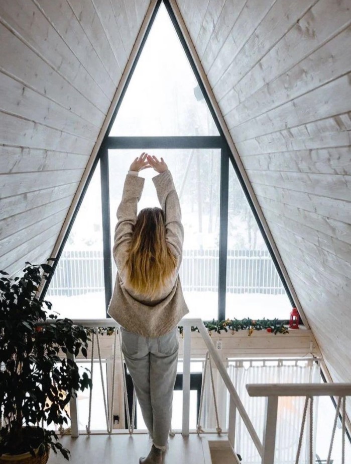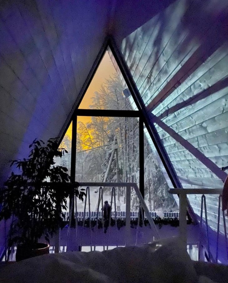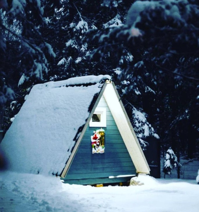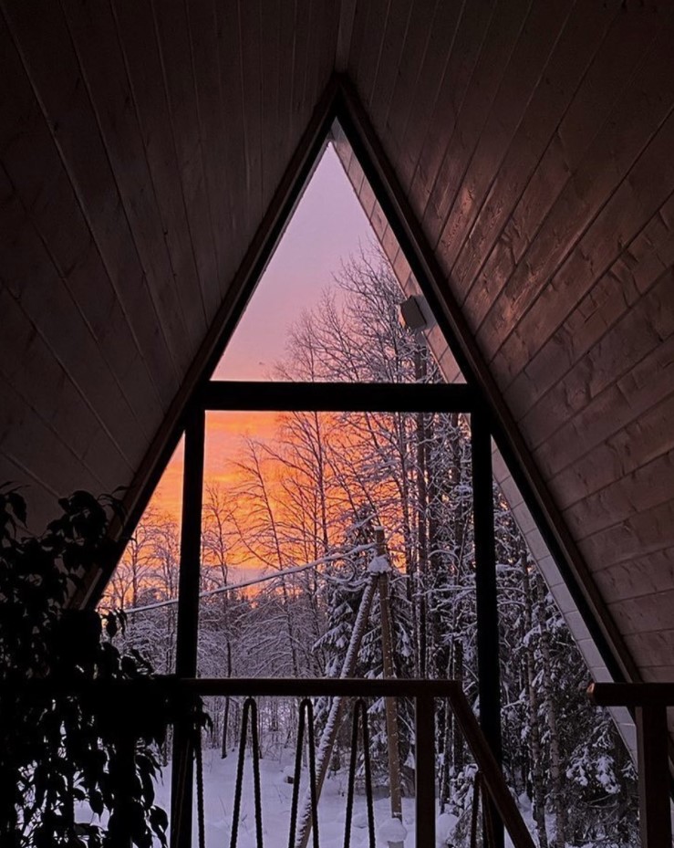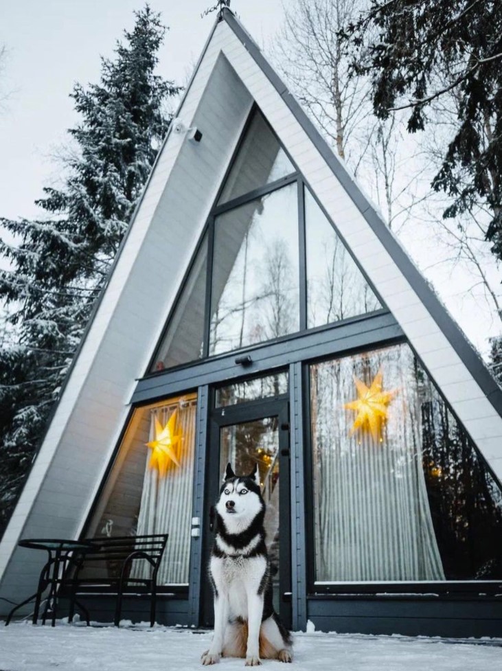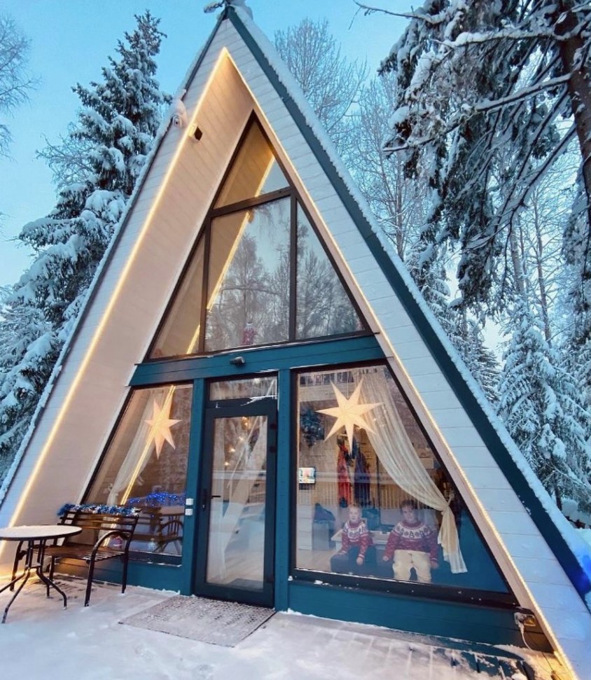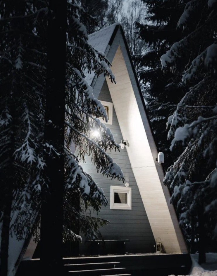 Уютная A-Frame сауна смотрится как сказочный домик в лесу.