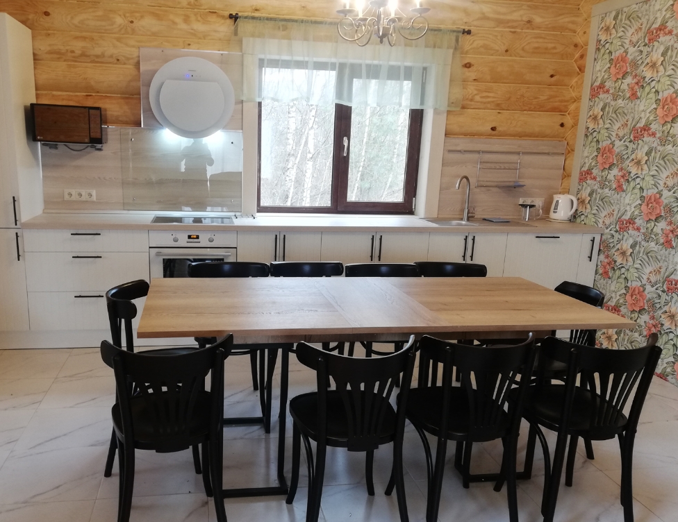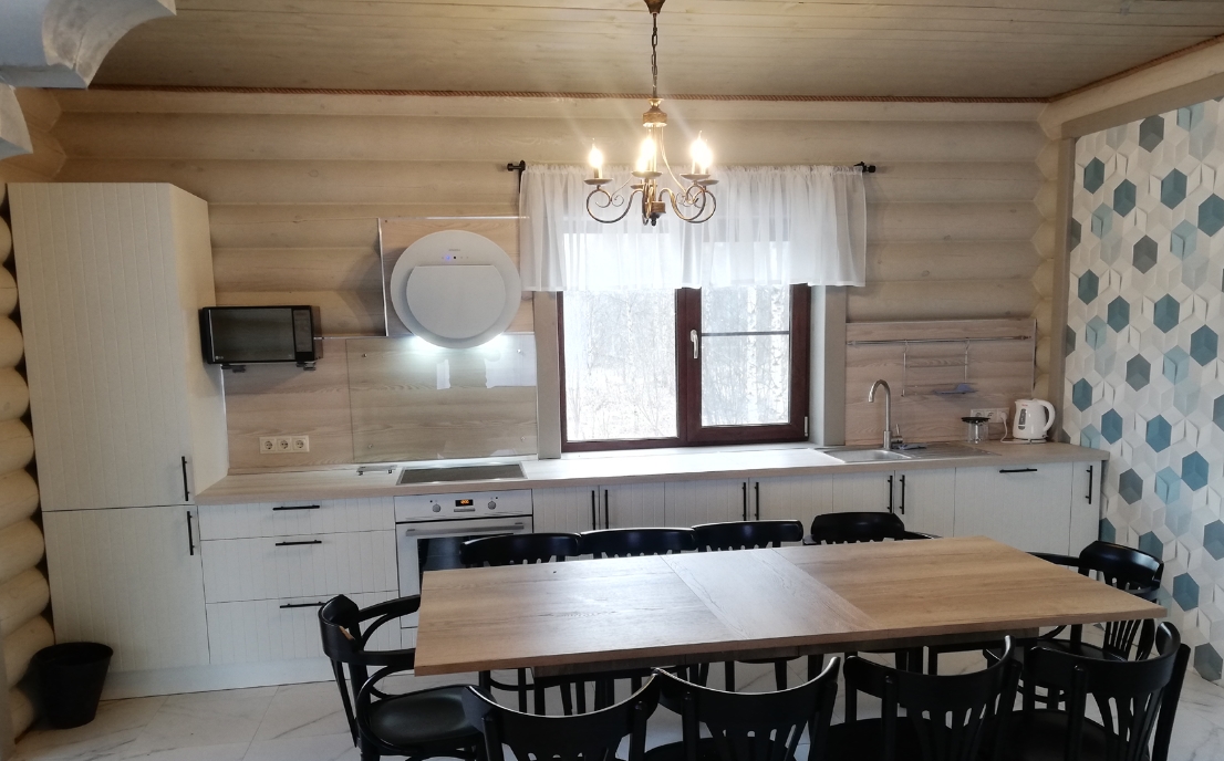 Коттедж укомплектован современной эргономичной мебелью и новейшей бытовой техникой. Большая кухня с холодильником, морозильной камерой, варочной поверхностью, духовкой, посудомоечной машиной, всей необходимой посудой позволяет организовать полноценное приготовление и прием пищи.