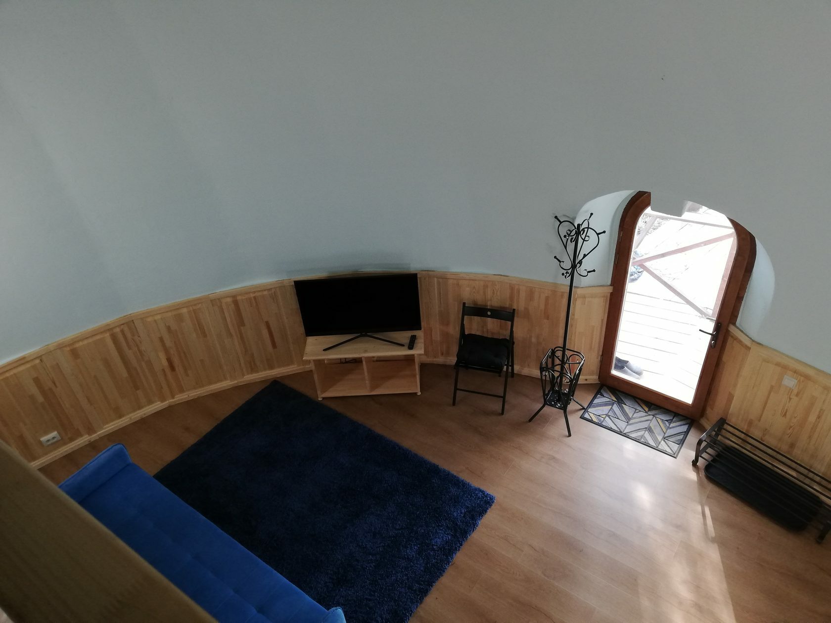 Планировка дома состоит из: просторной гостиной с высоким сводчатым потолком, совмещенной с современной кухней; комфортного санузла с горячей и холодной водой и душем; уютной спальни для родителей; и антресоли на втором этаже, где могут разместиться два ребенка. Для дополнительных гостей предусмотрен комфортный раскладной диван.