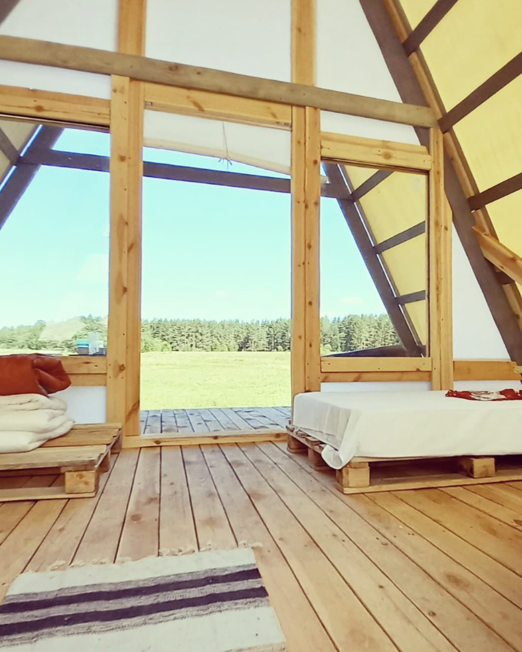 Гости проживают в индейских типи, оборудованных кроватями, тумбами, вешалкой для хранения вещей, зеркалом и милым этническим декором.