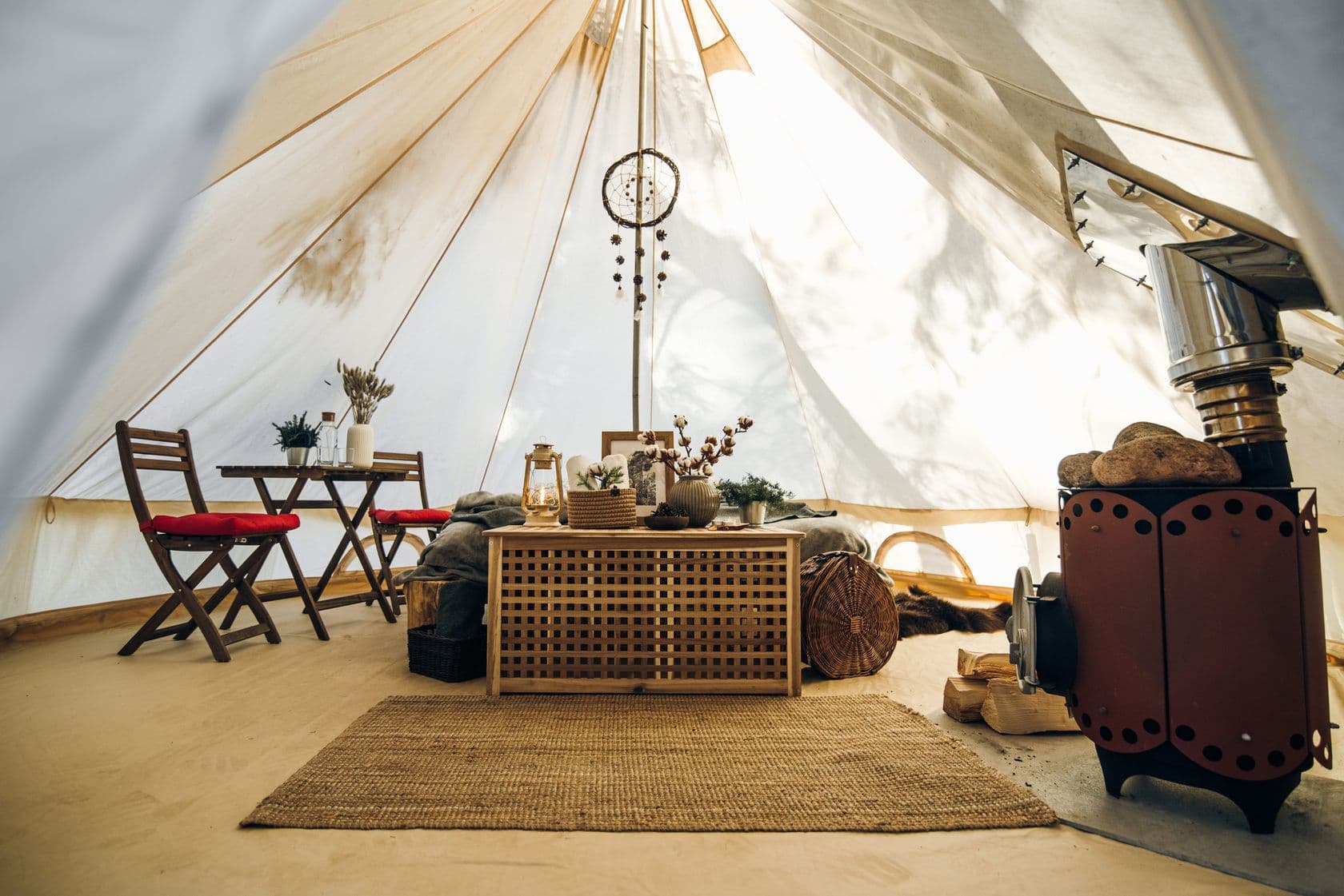 В шатре: большая двуспальная кровать, печь, постельное бельё и полотенца на всех гостей. На прилегающей территории шатра: освещение гирляндой, индивидуальный мангал, решетка гриль, садовые стулья и стол, гамак.