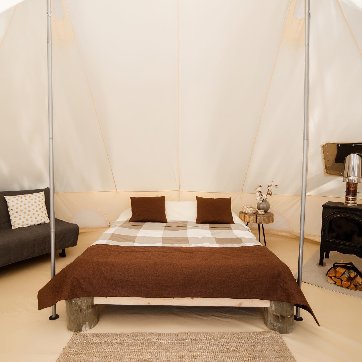 В шатре: большая двуспальная кровать 160х200 см и односпальная кровать 90х200 см, печь, постельное бельё и полотенца на всех гостей.