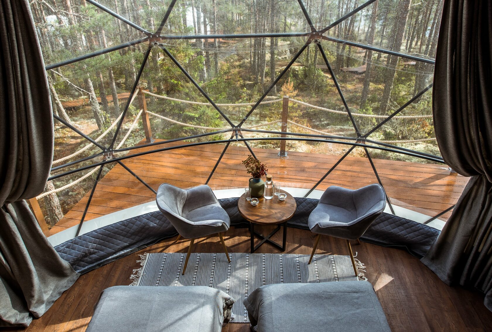 Внутри две удобные нижние кровати или одна большая для пар и дополнительное спальное место наверху, прикроватный столик, два кресла и журнальный стол у панорамного окна с видом на лес и озеро. Также шкаф для одежды, розетки, биотуалет и раковина для умывания. Гостям предоставляется два полотенца.