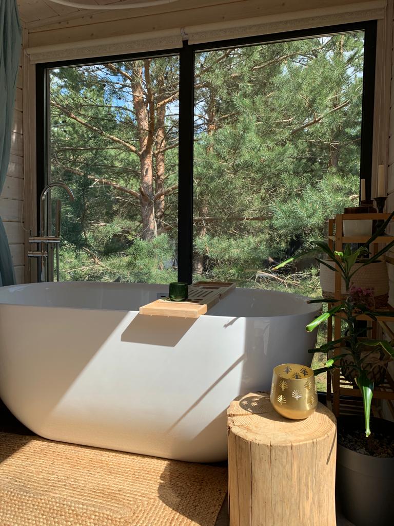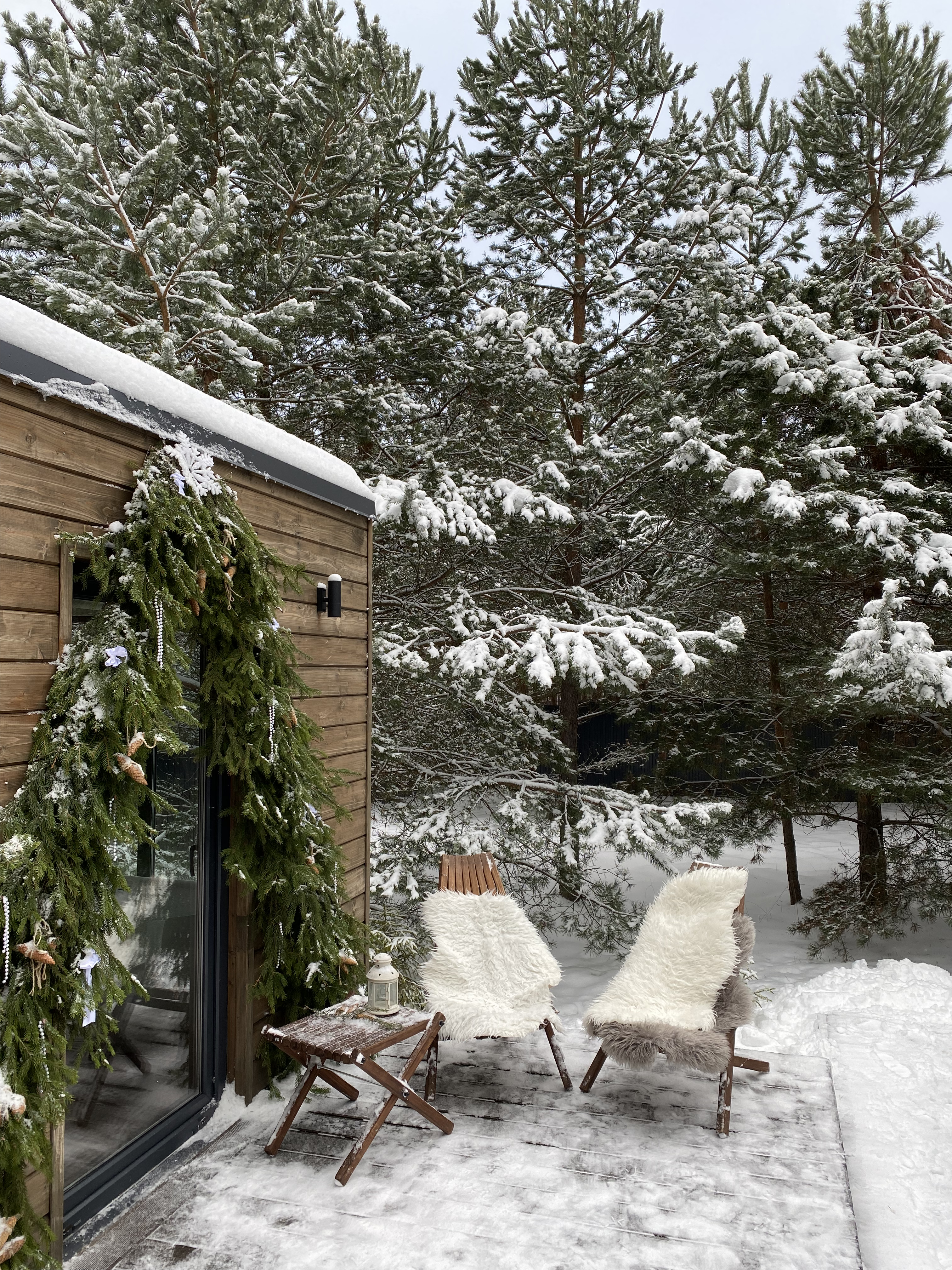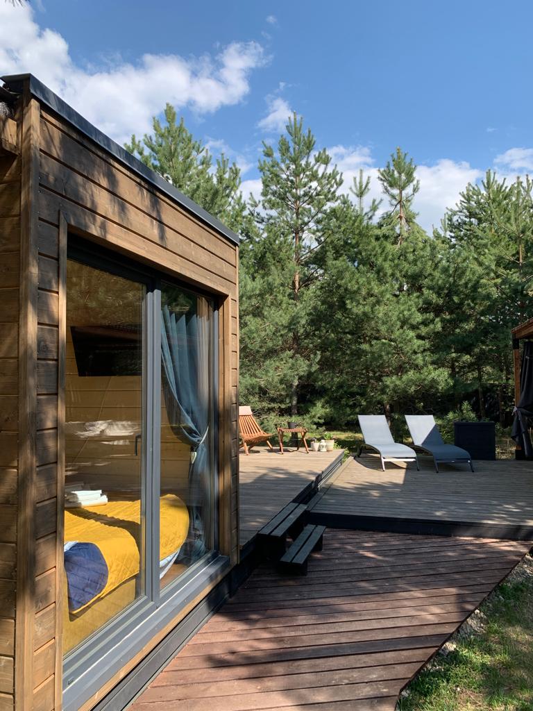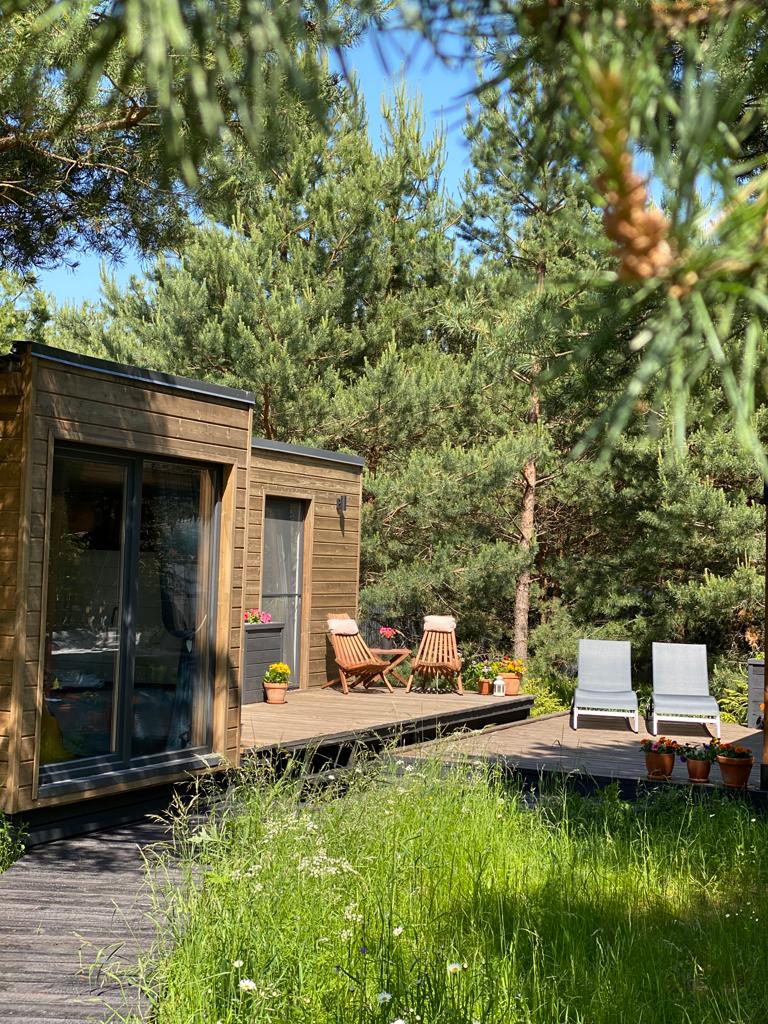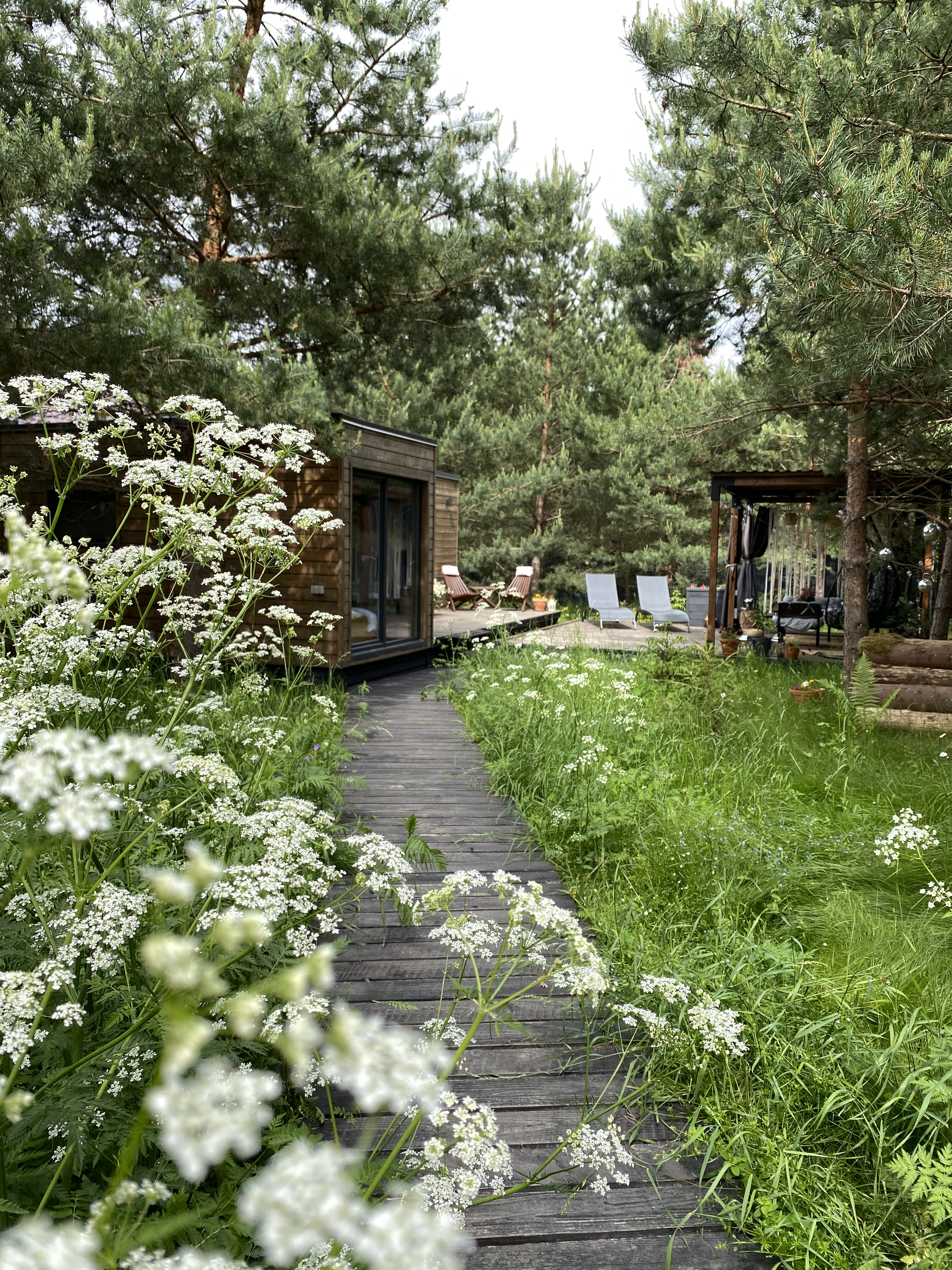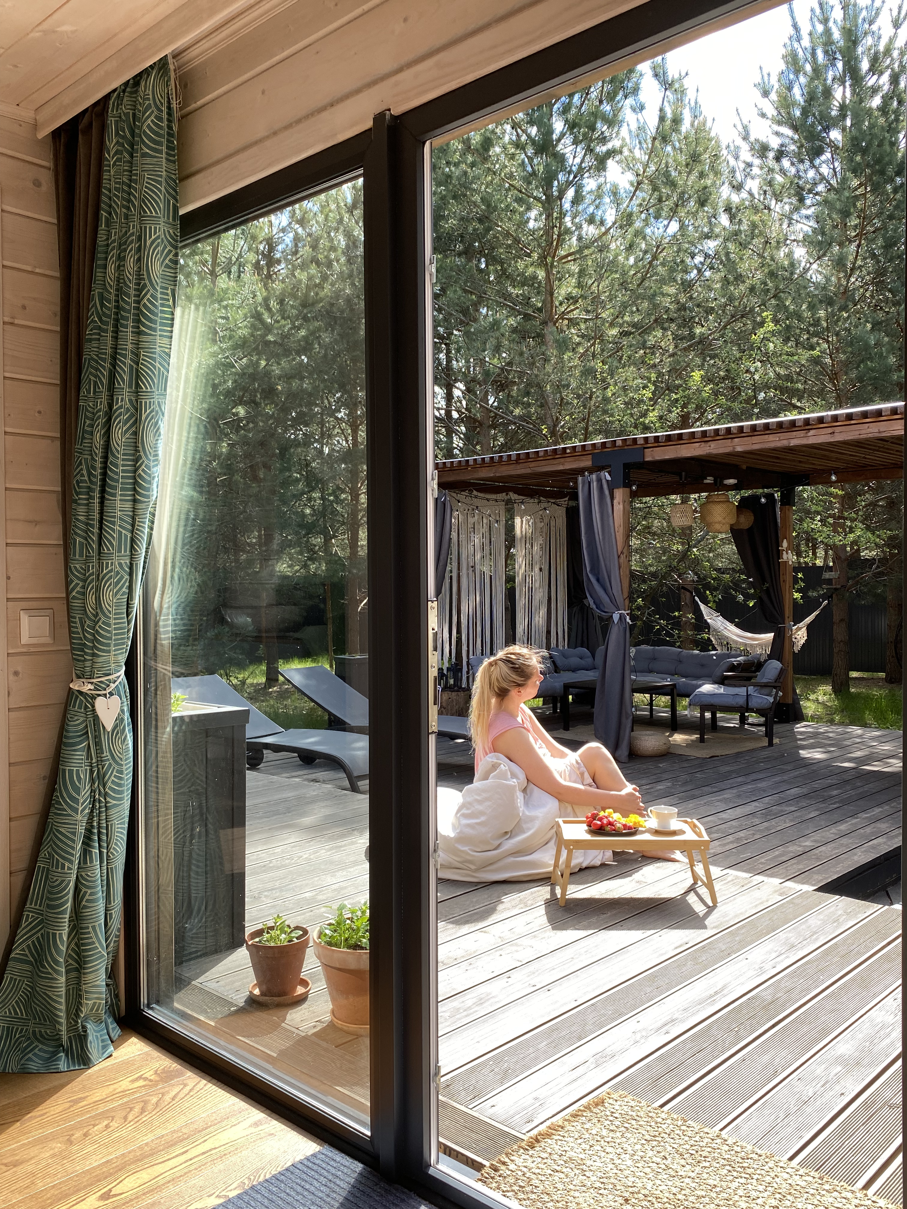 Дом, терраса и беседка находятся прямо среди соснового леса.