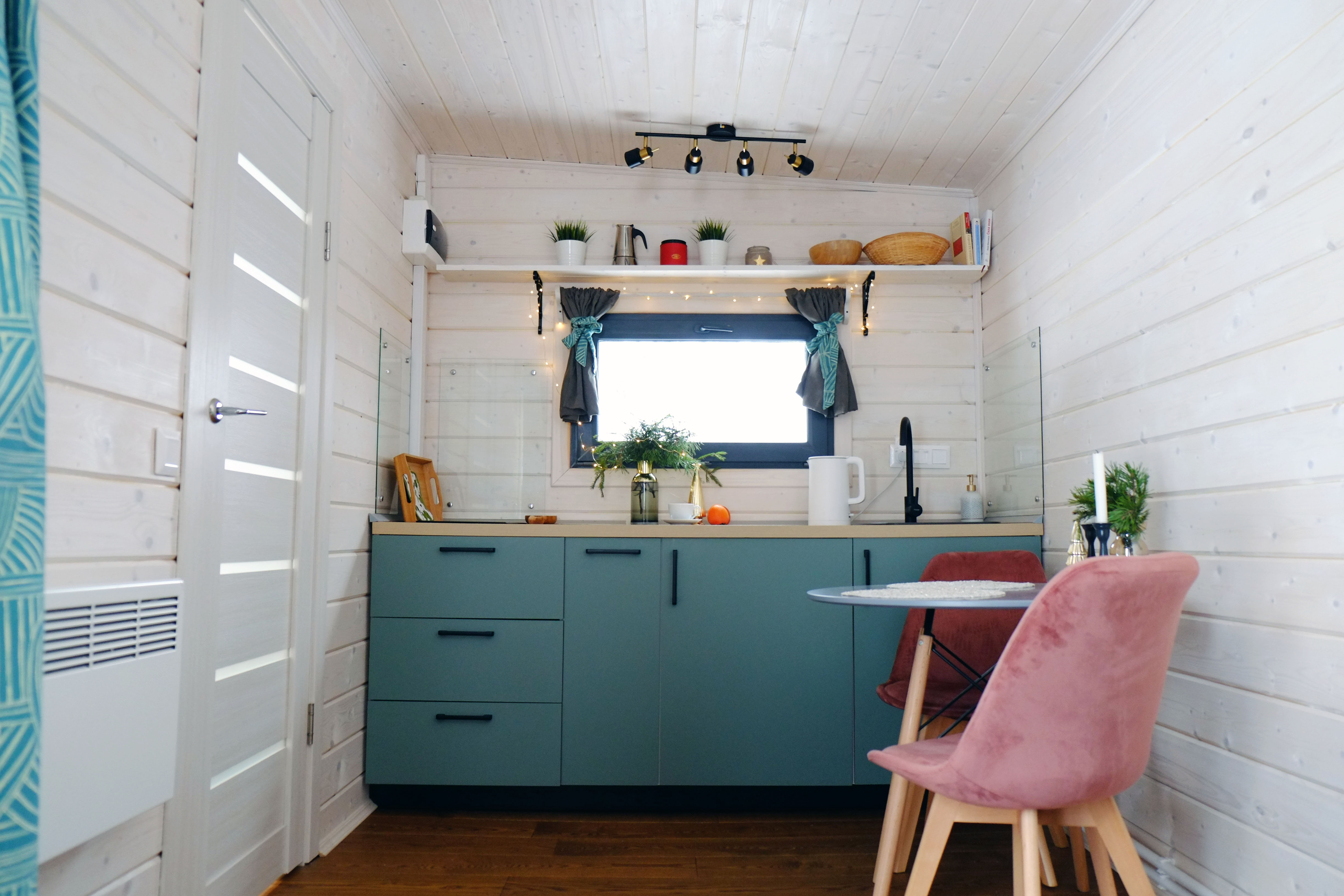 - В домиках есть кухня, оборудованная всем необходимым: холодильник, плита, столовые приборы, посуда, чайник, микроволновка, все для чая и кофе.