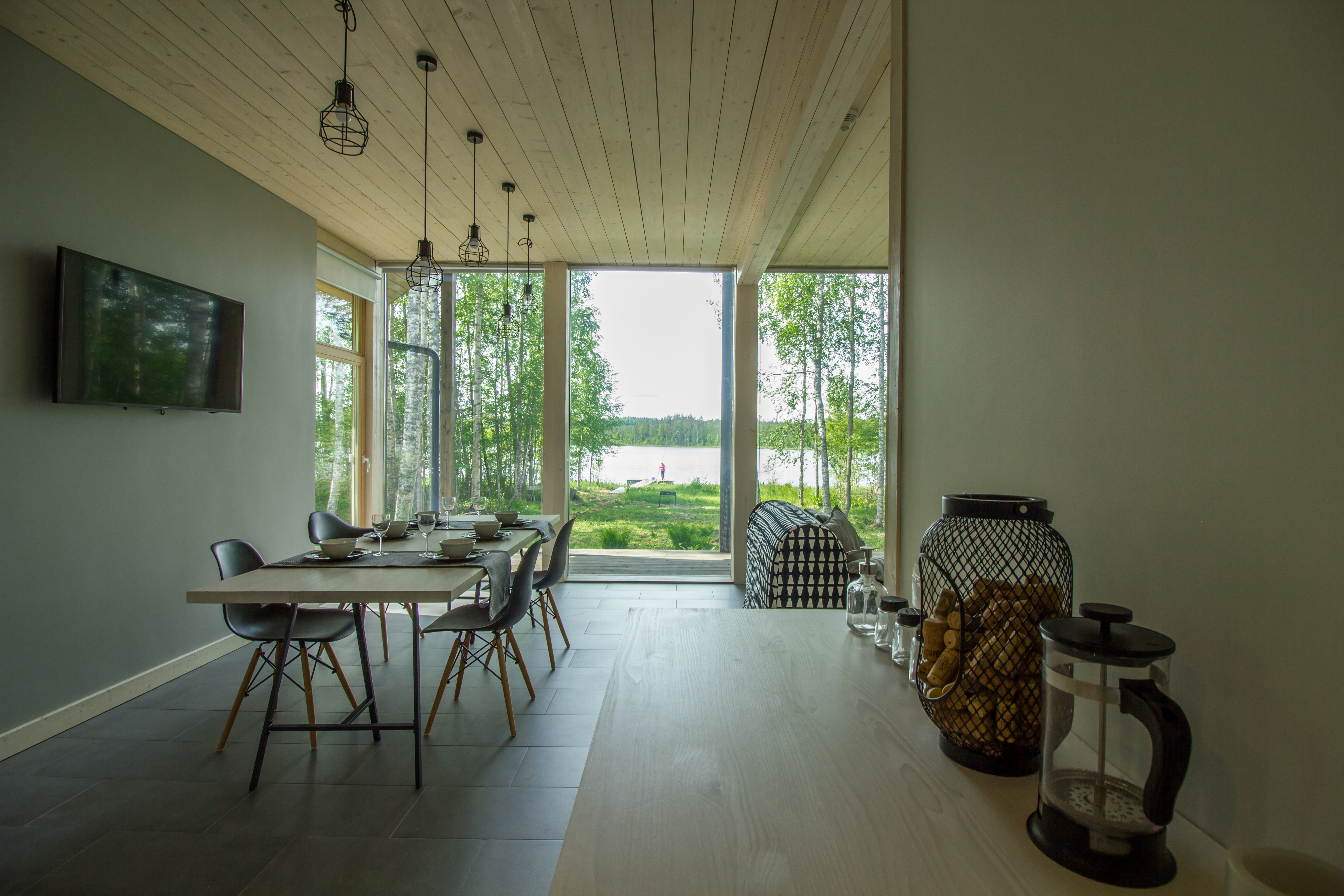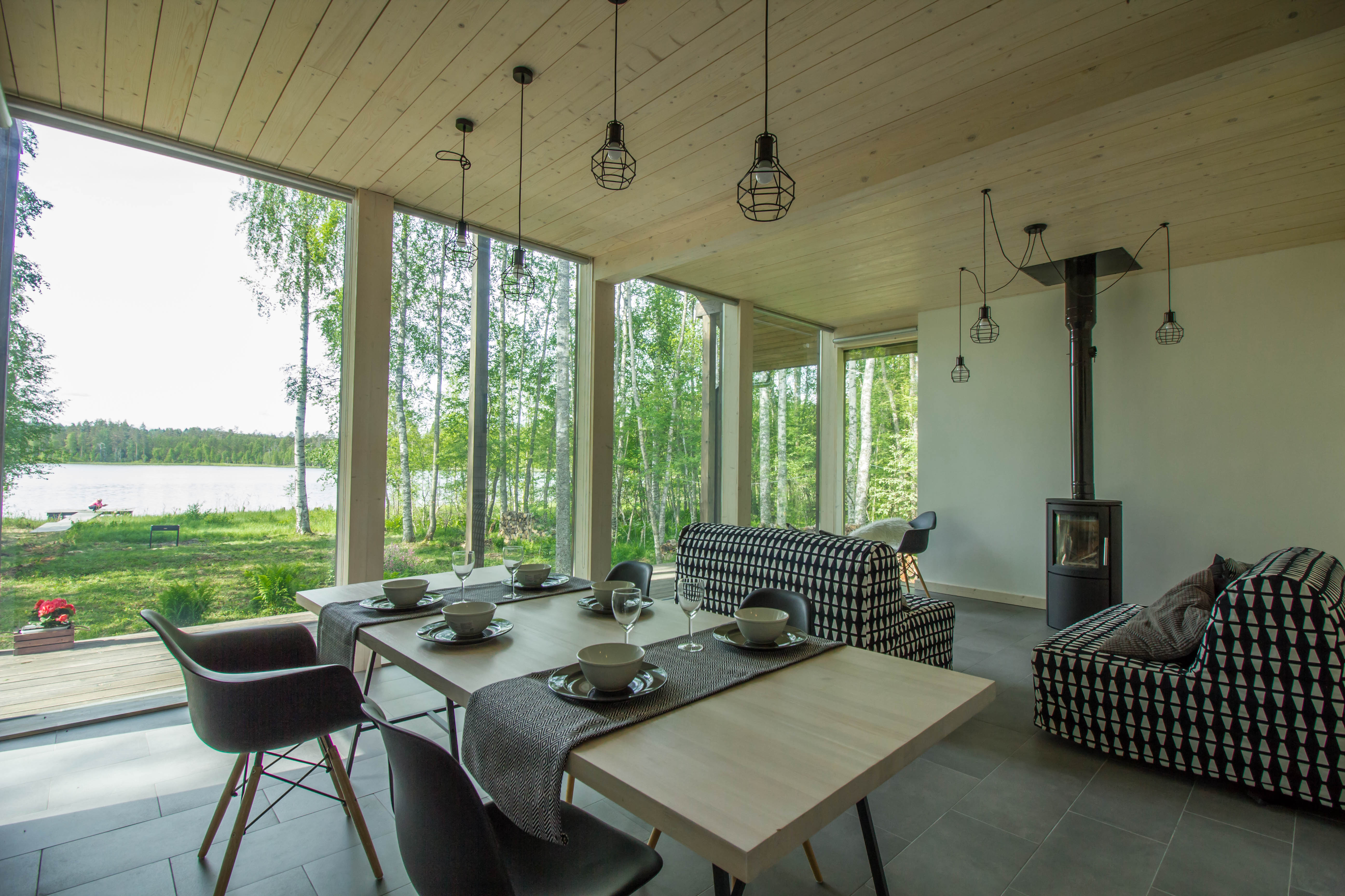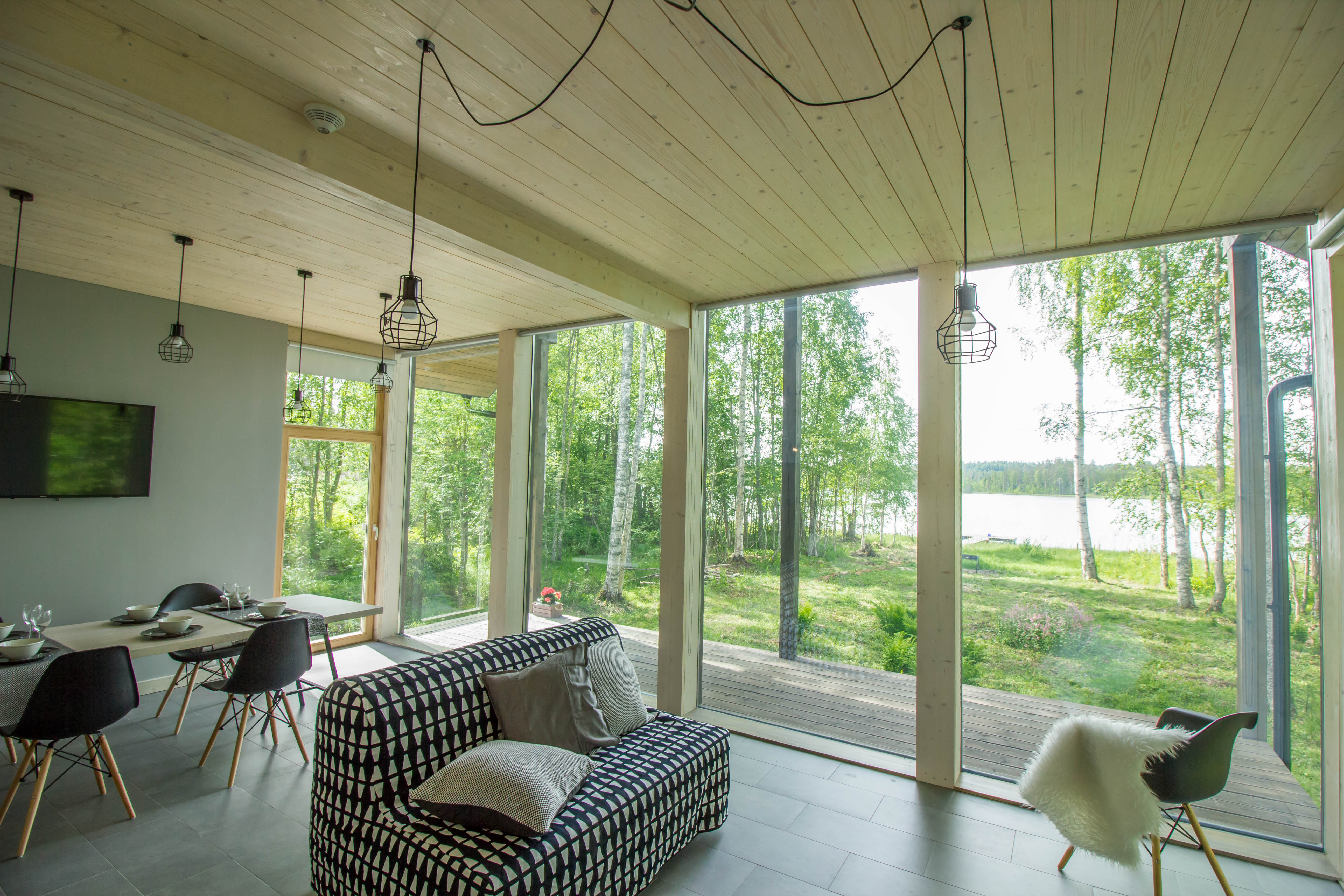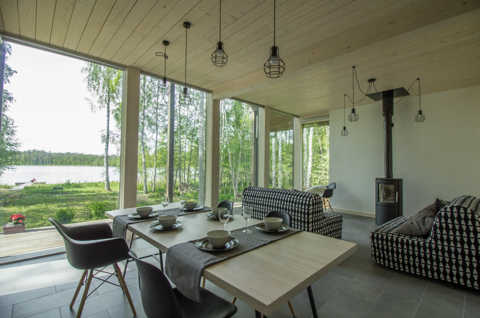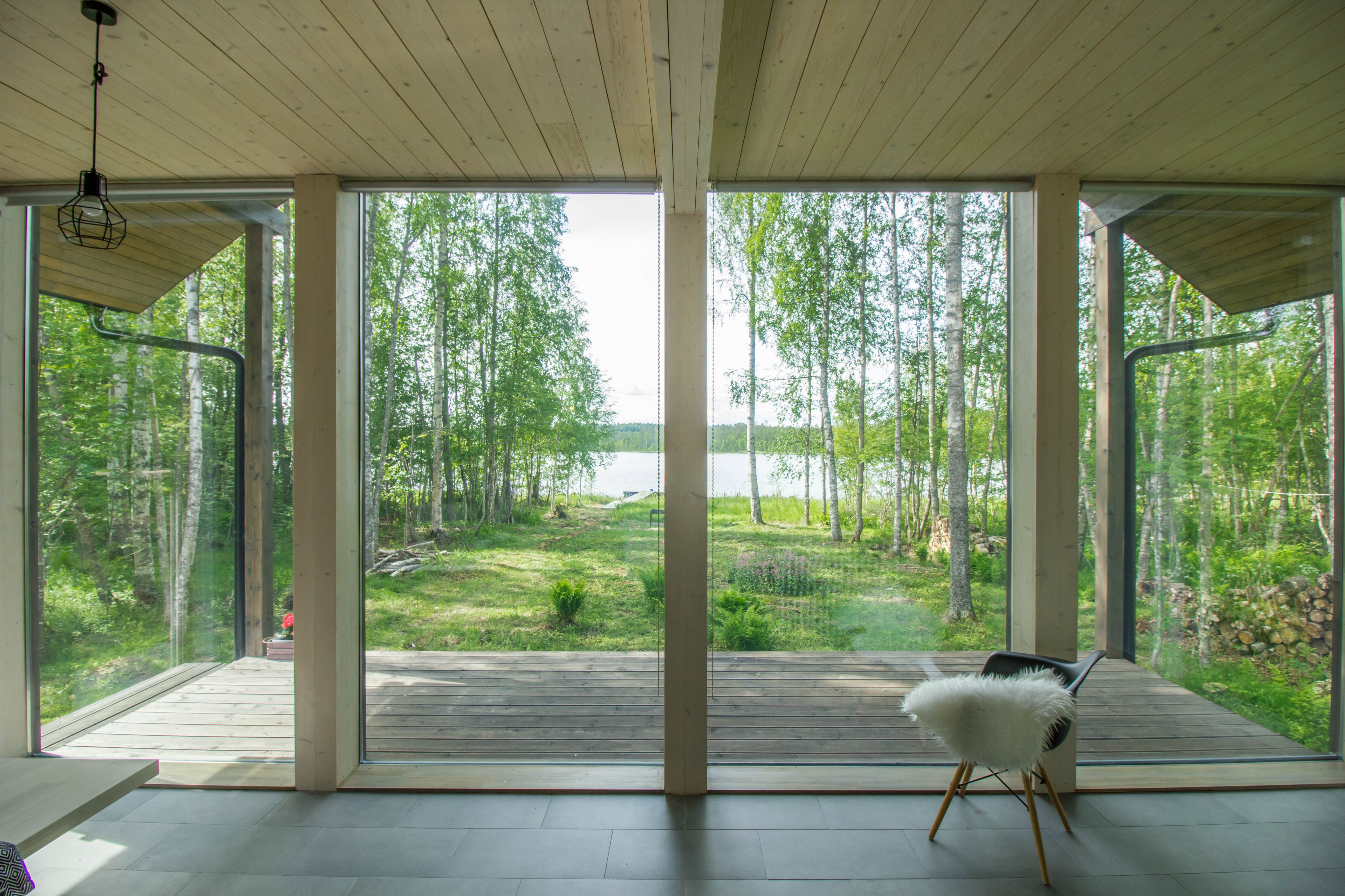 В доме находится панорамный холл с видом на озеро , с огромными окнами выходящими на три стороны.