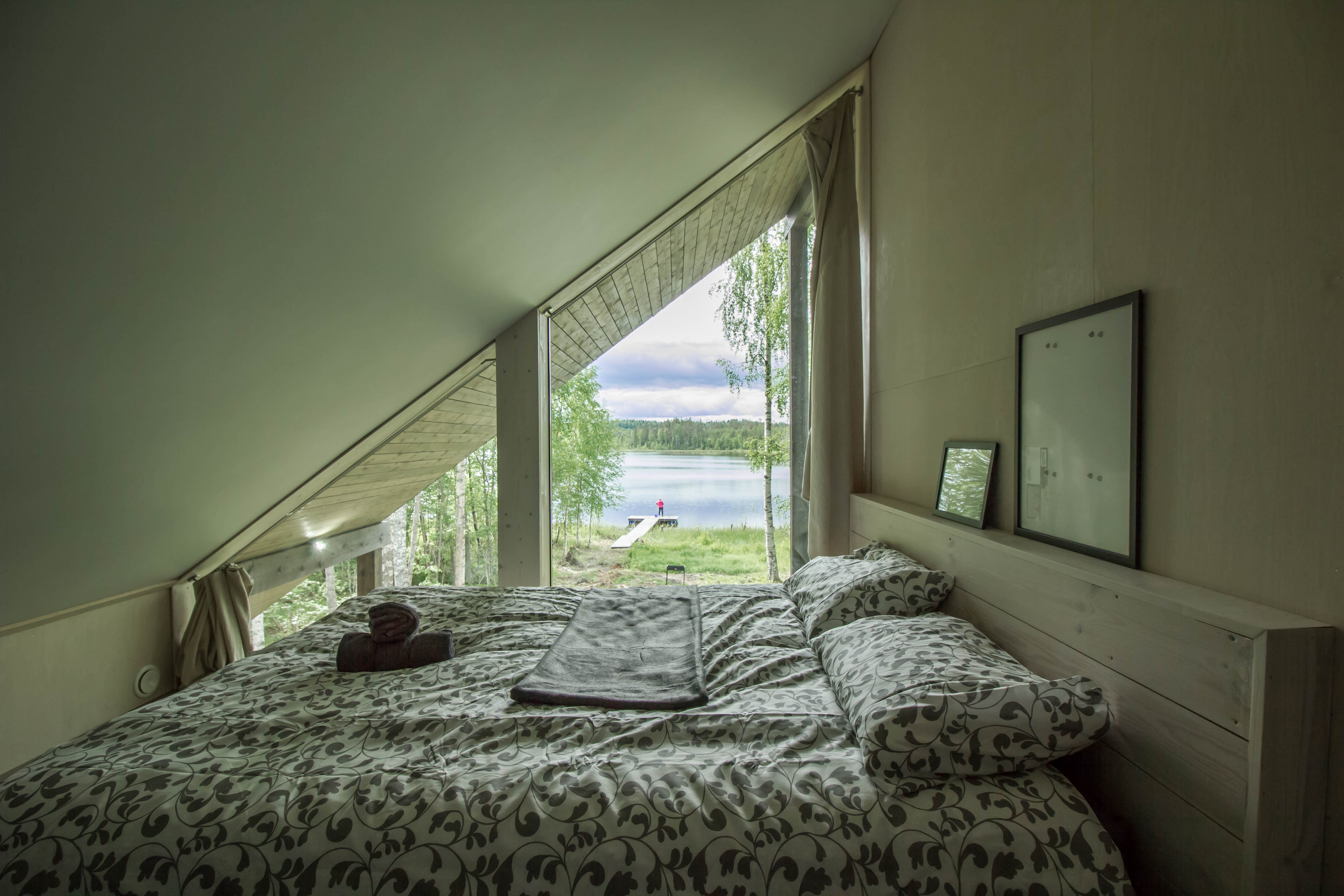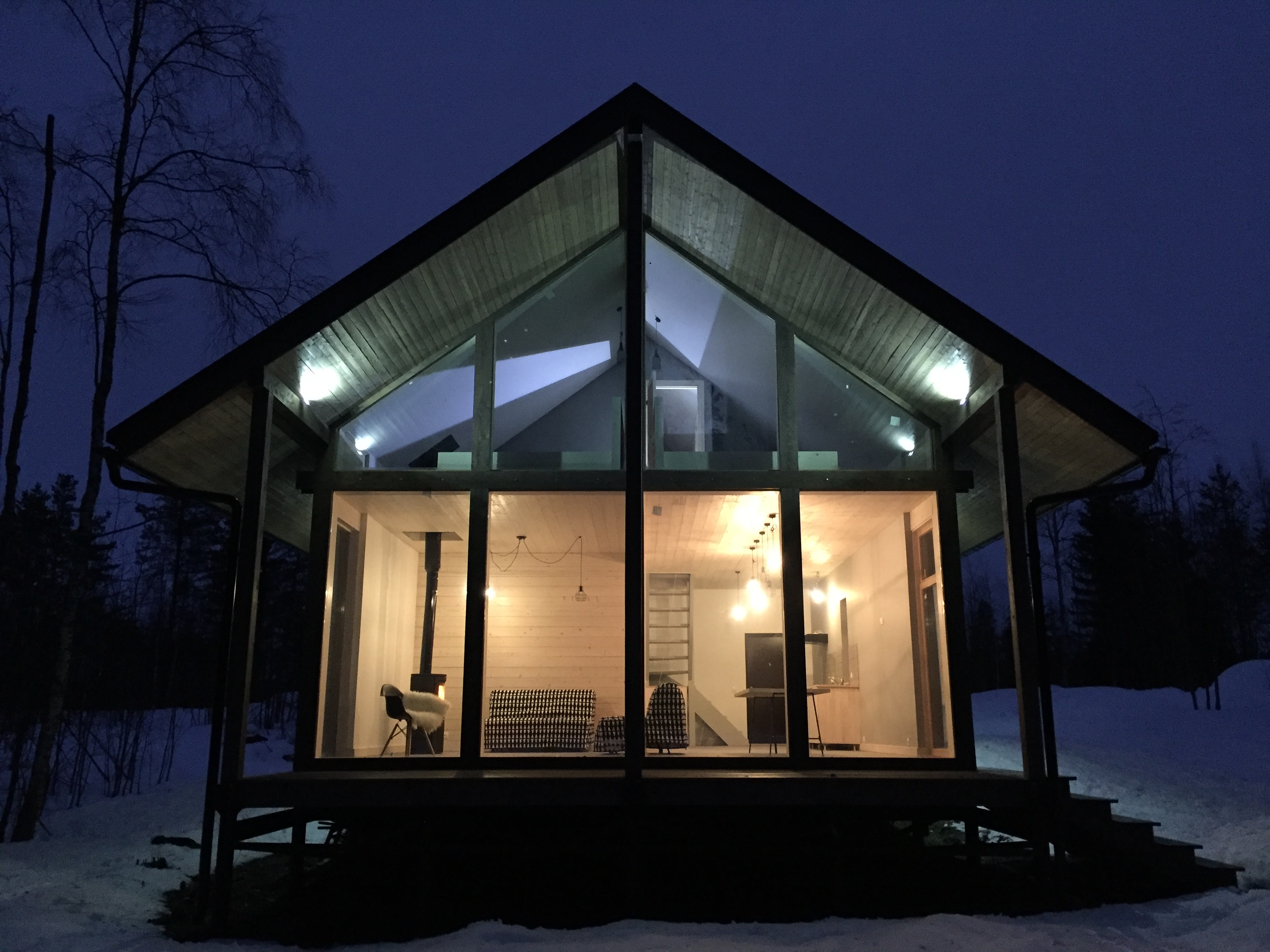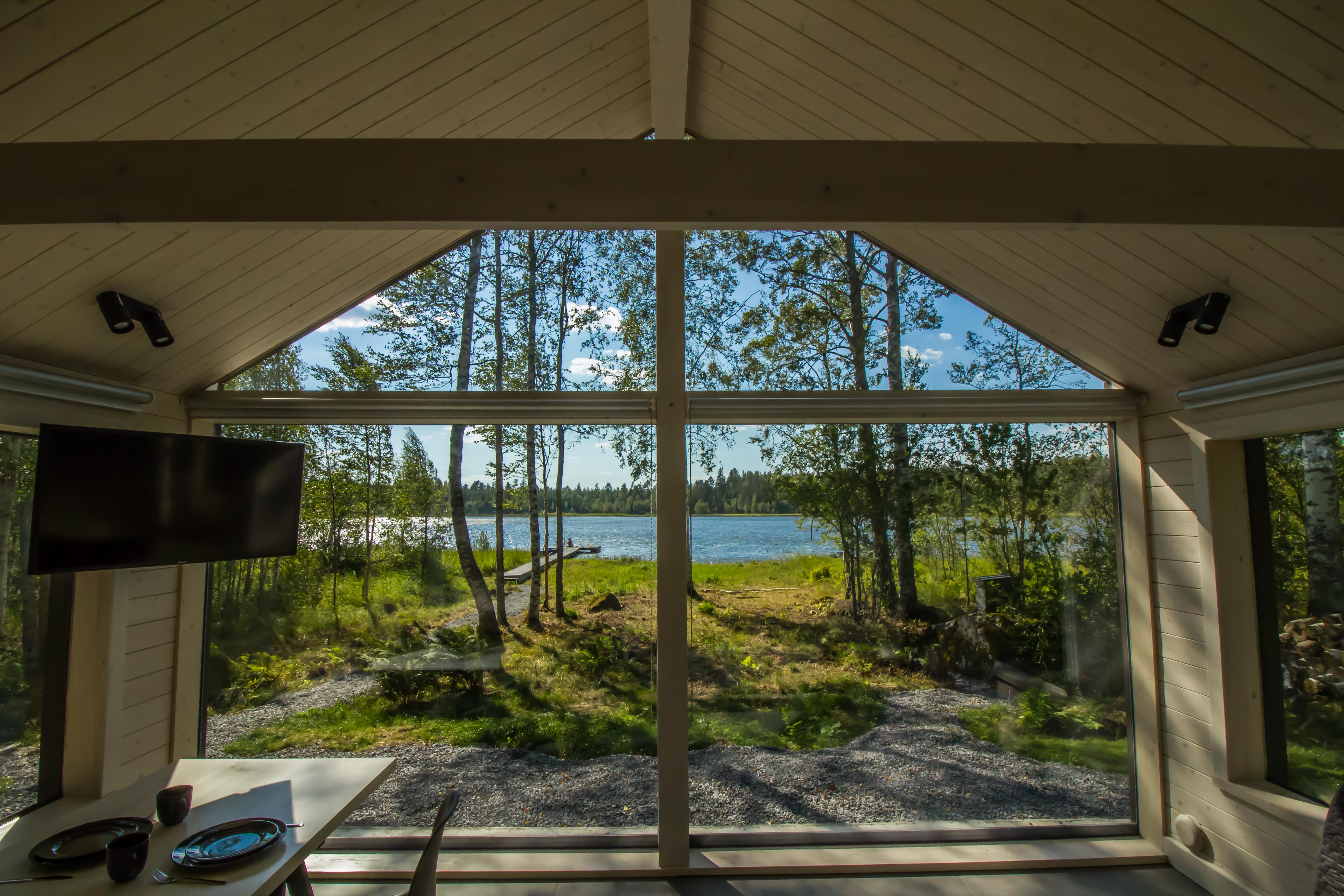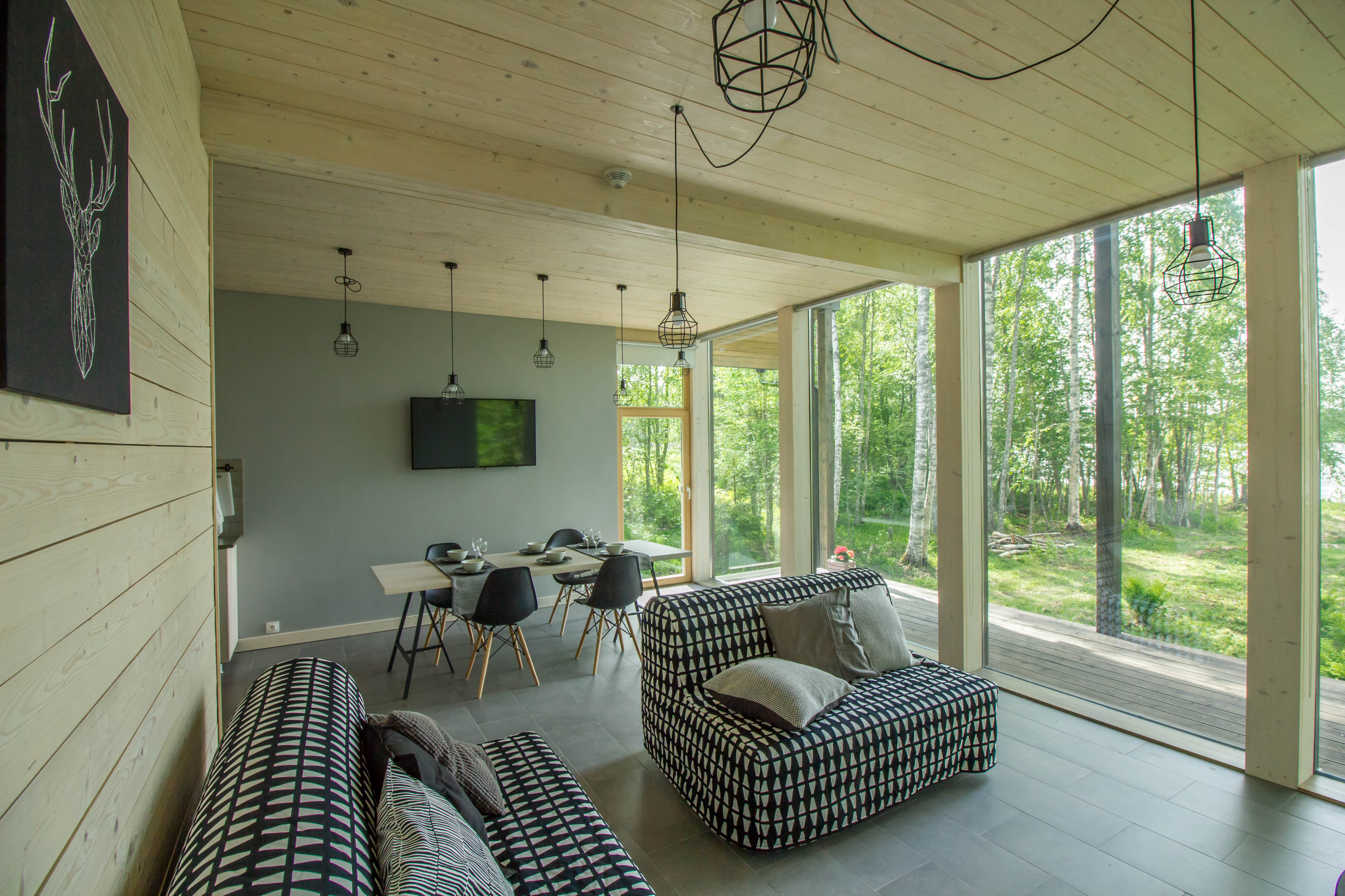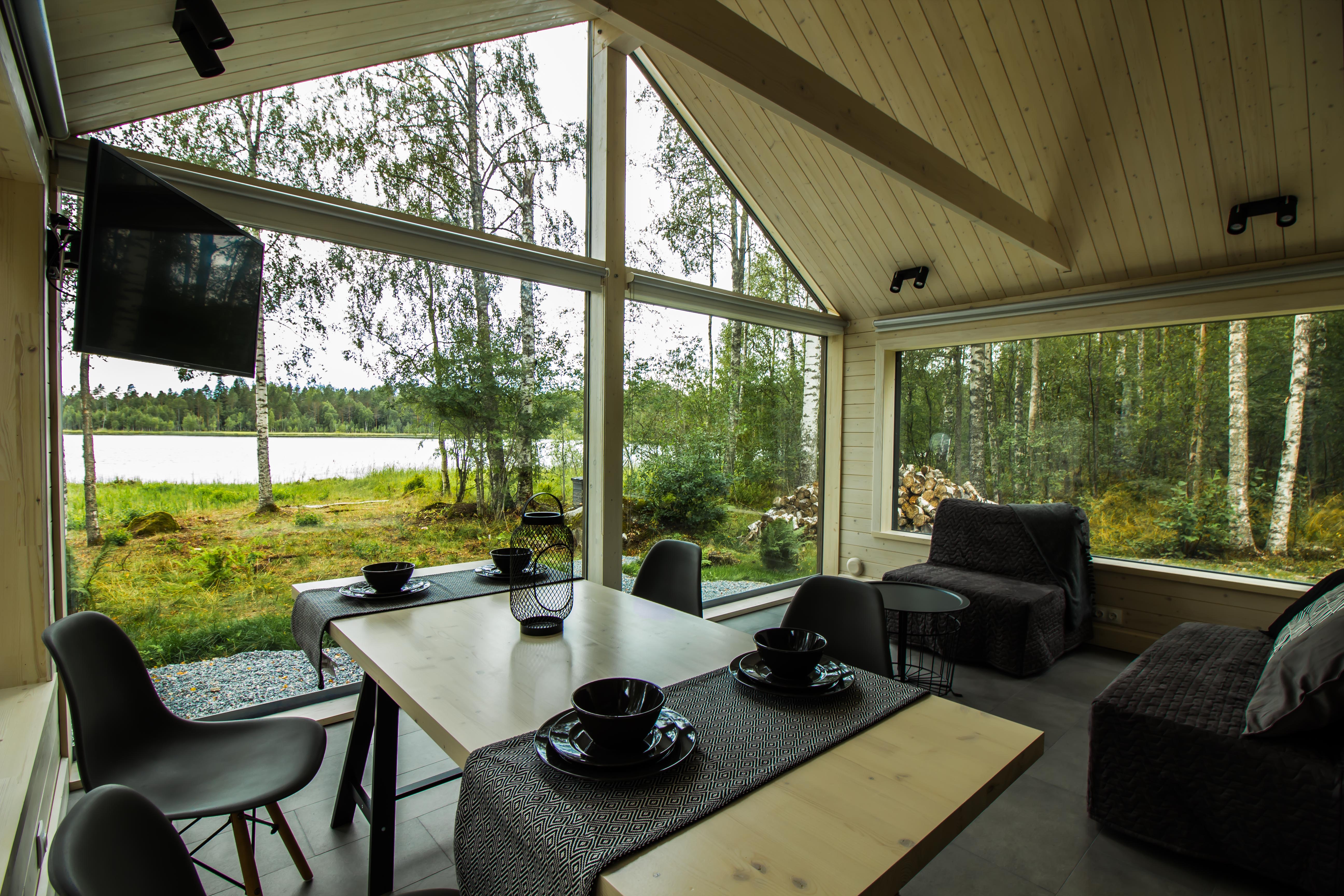 В доме находится панорамный холл с видом на озеро , с огромными окнами выходящими на три стороны.