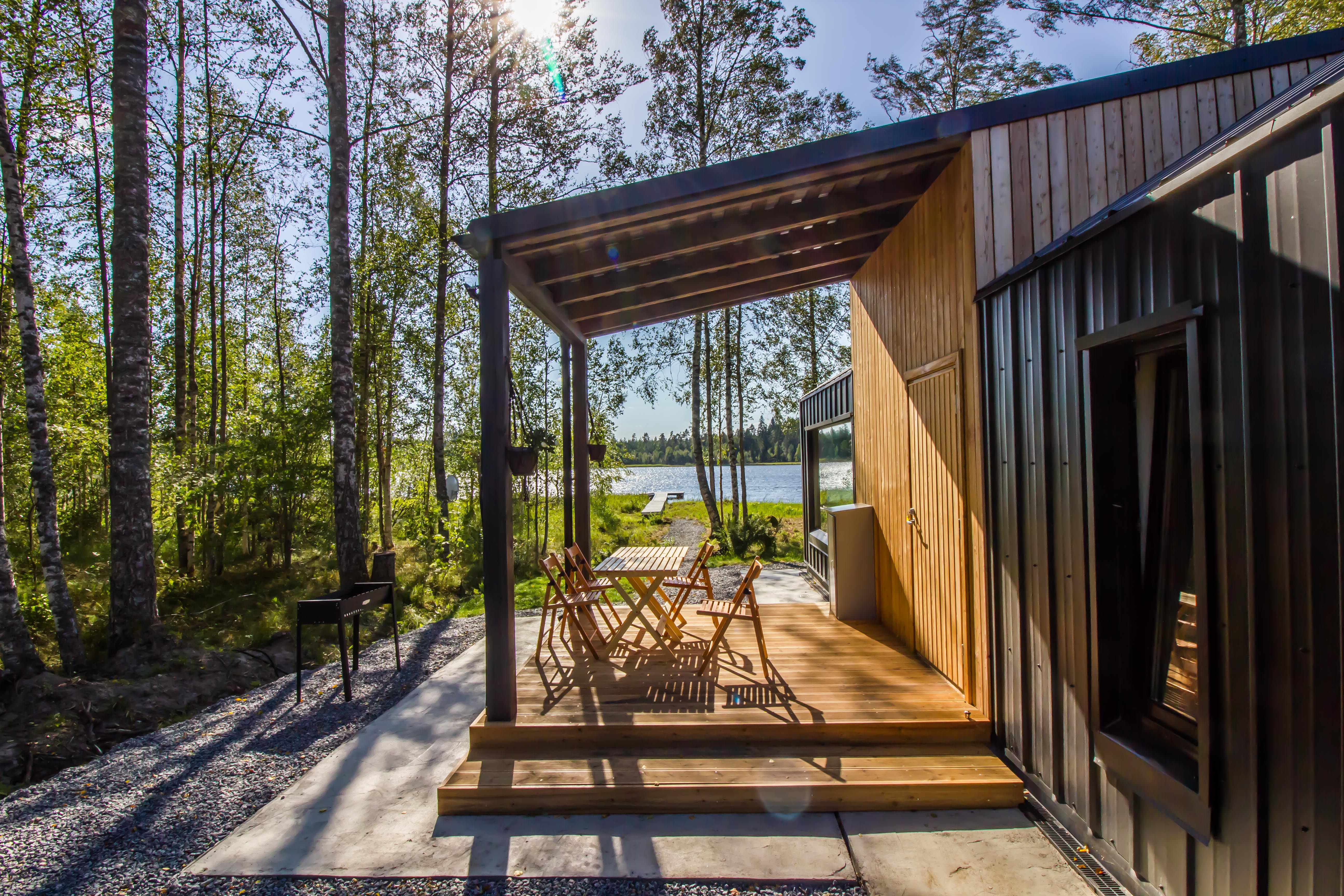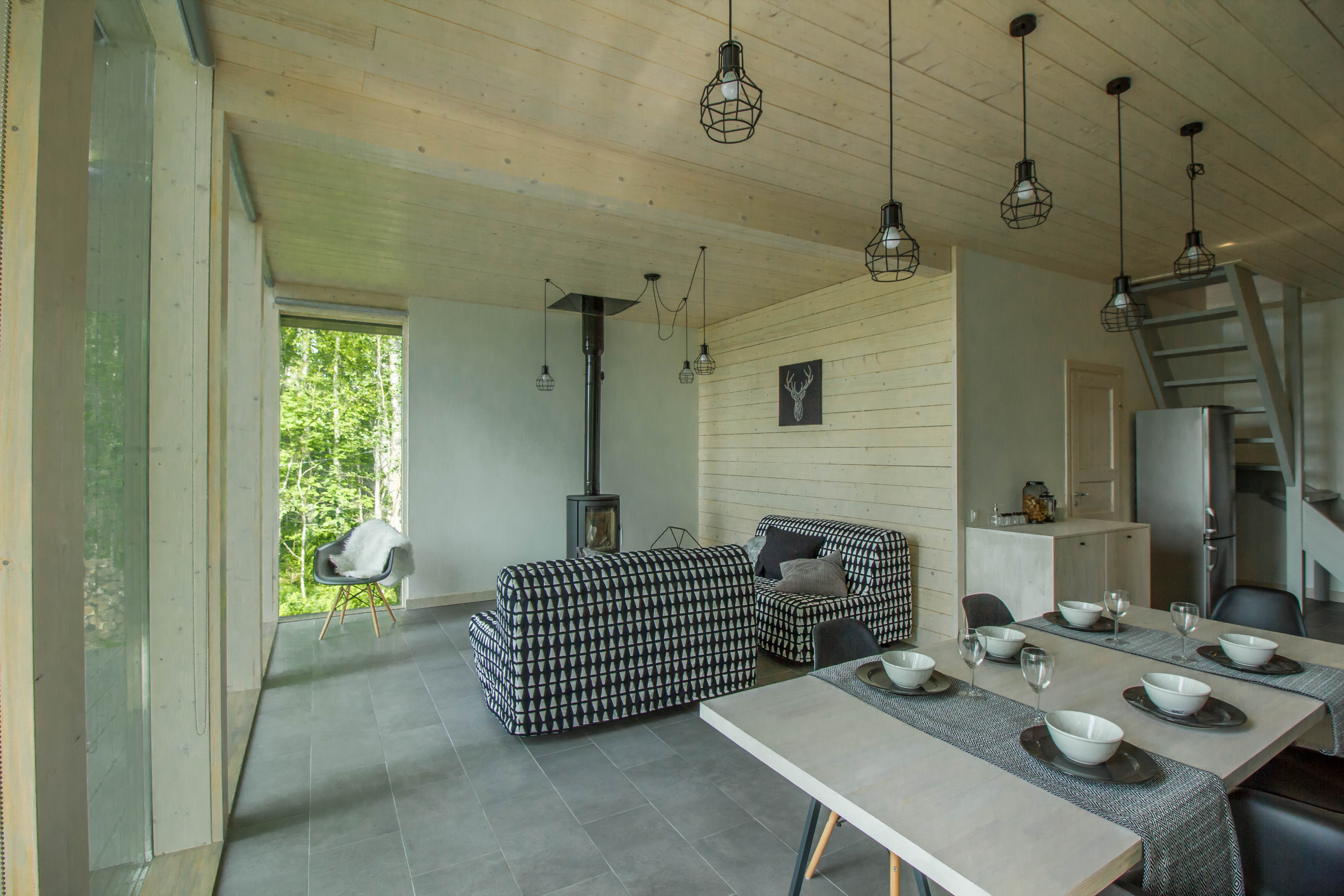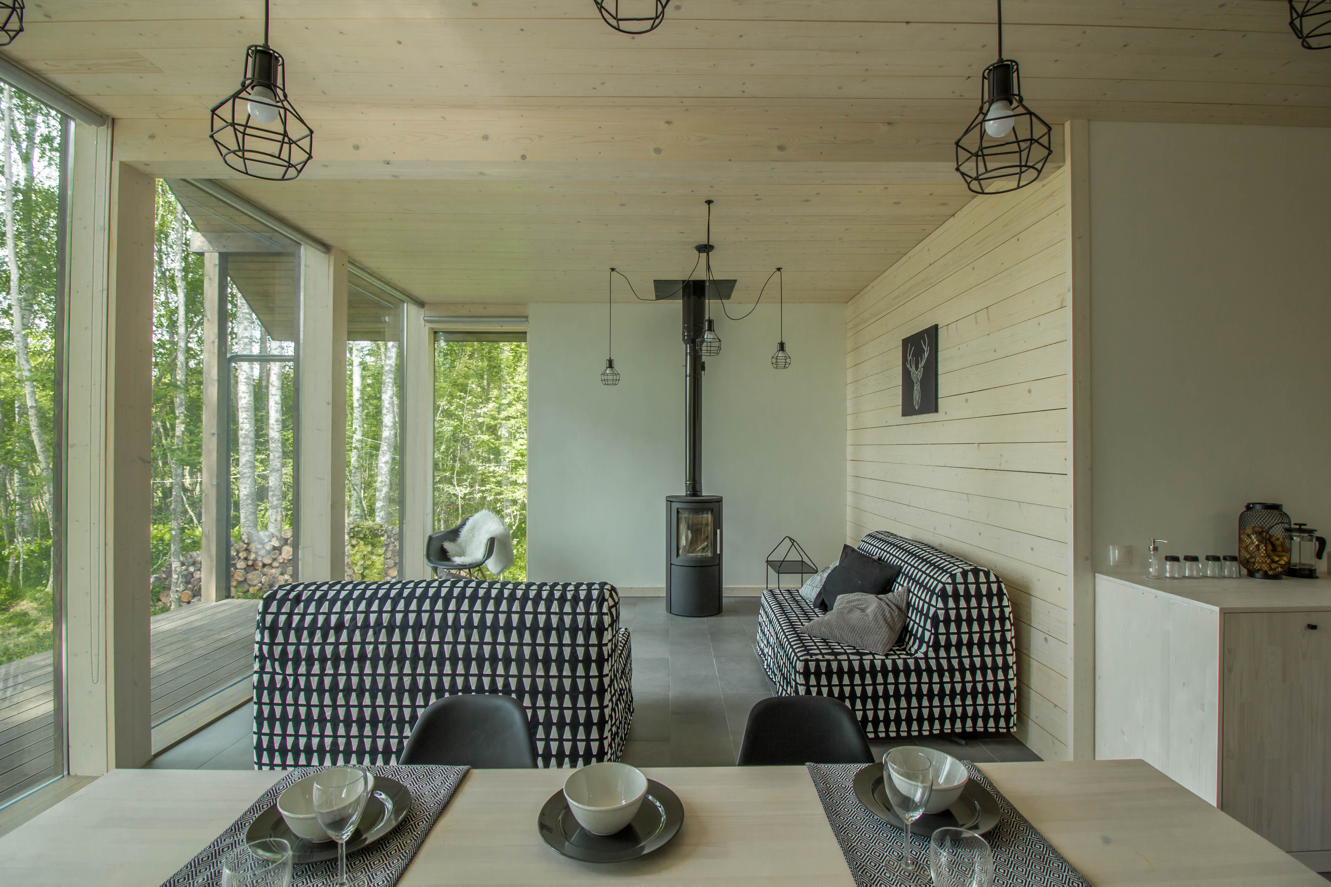 Коттедж ЛОФТ ХАУС имеет расширенную панораму первого этажа с угловыми окнами с шикарным видом на озеро, и небольшую уединенную террасу с креслом-качелью и шезлонгами, также есть зона отдыха с мангалом.