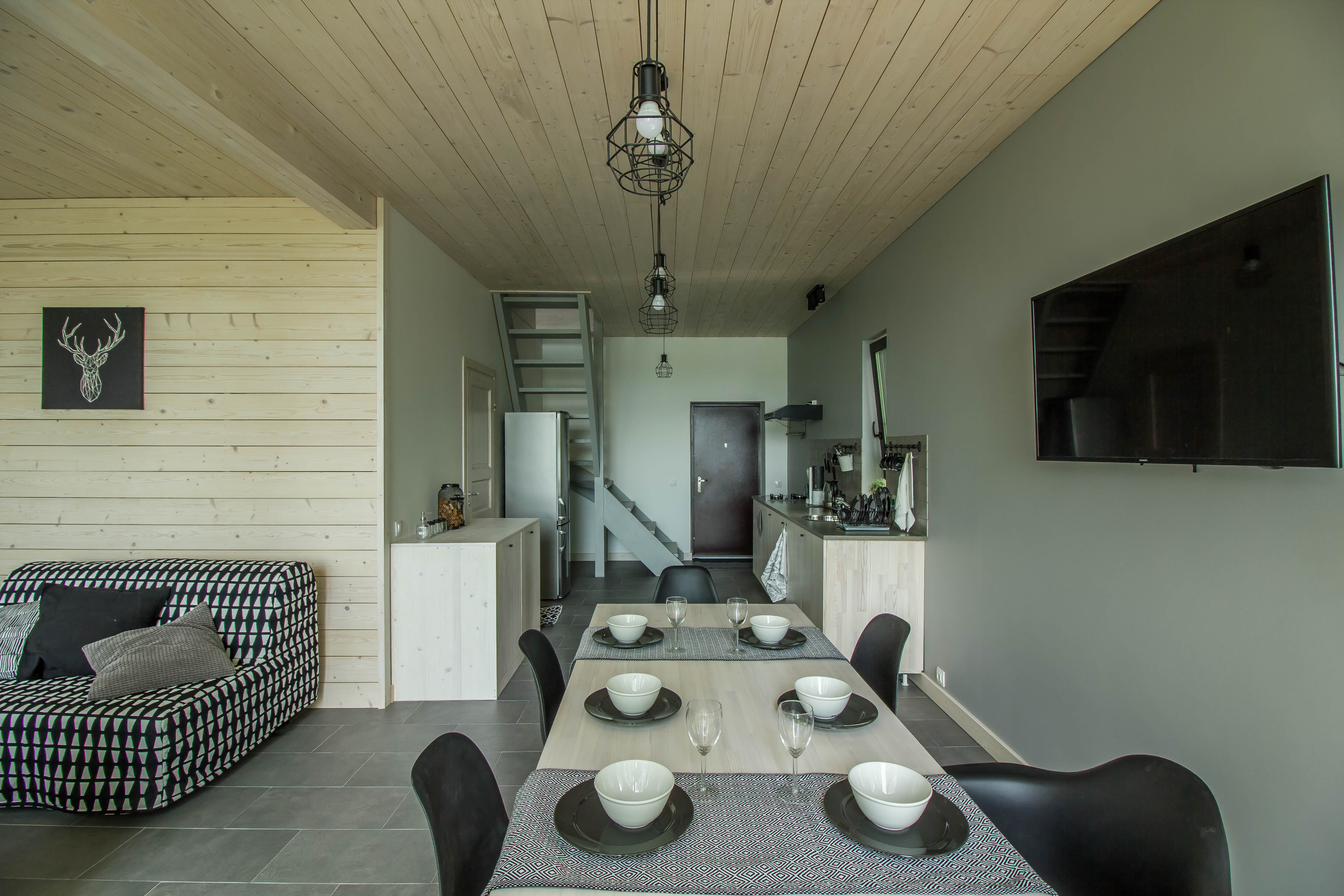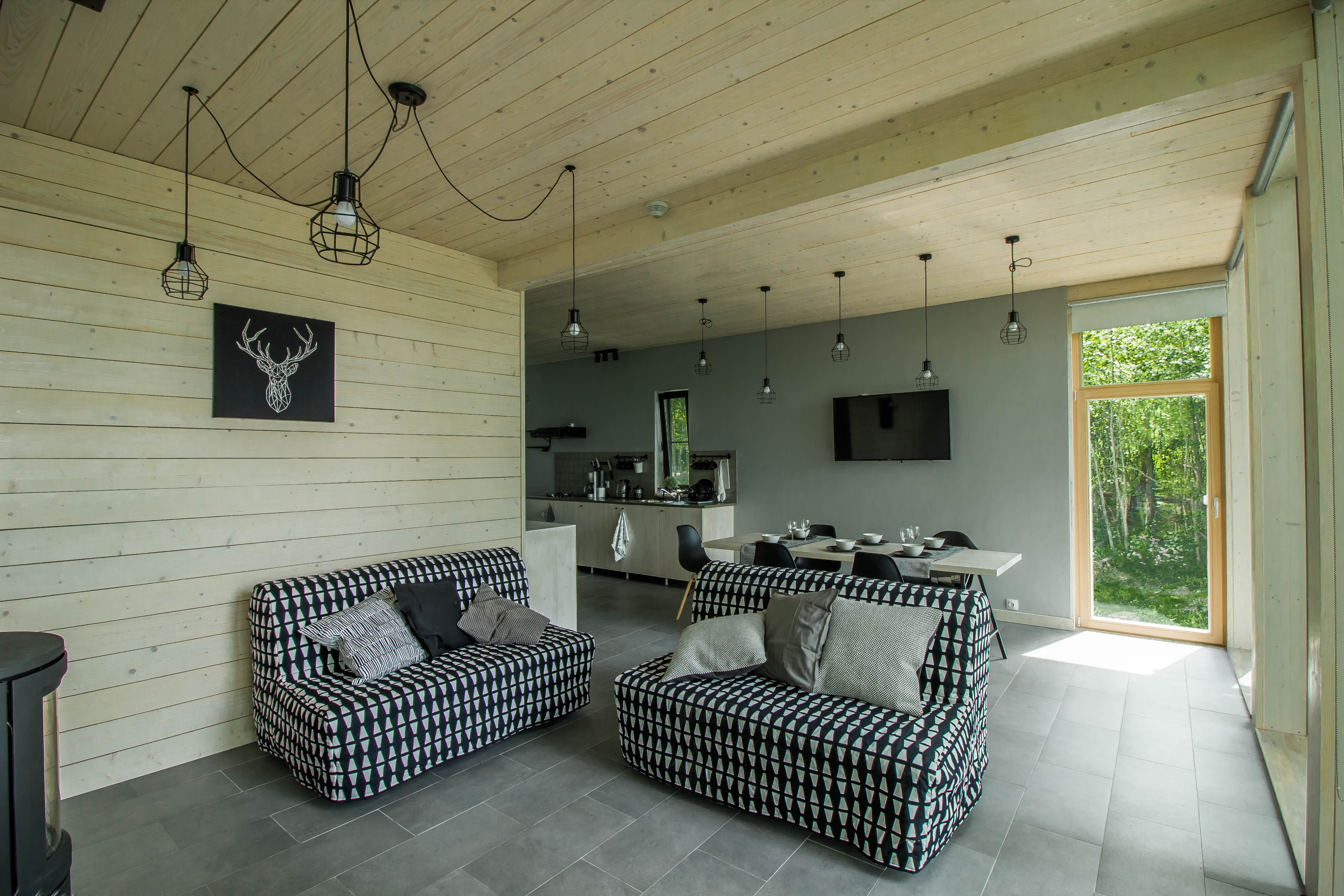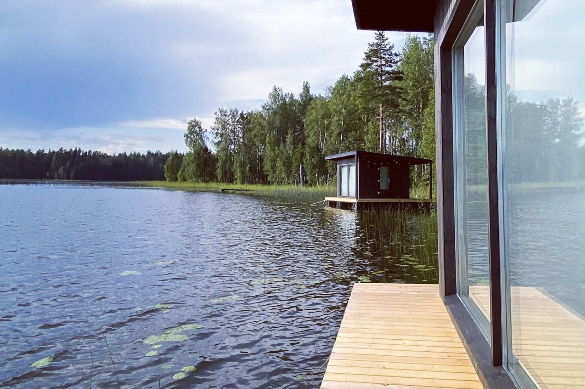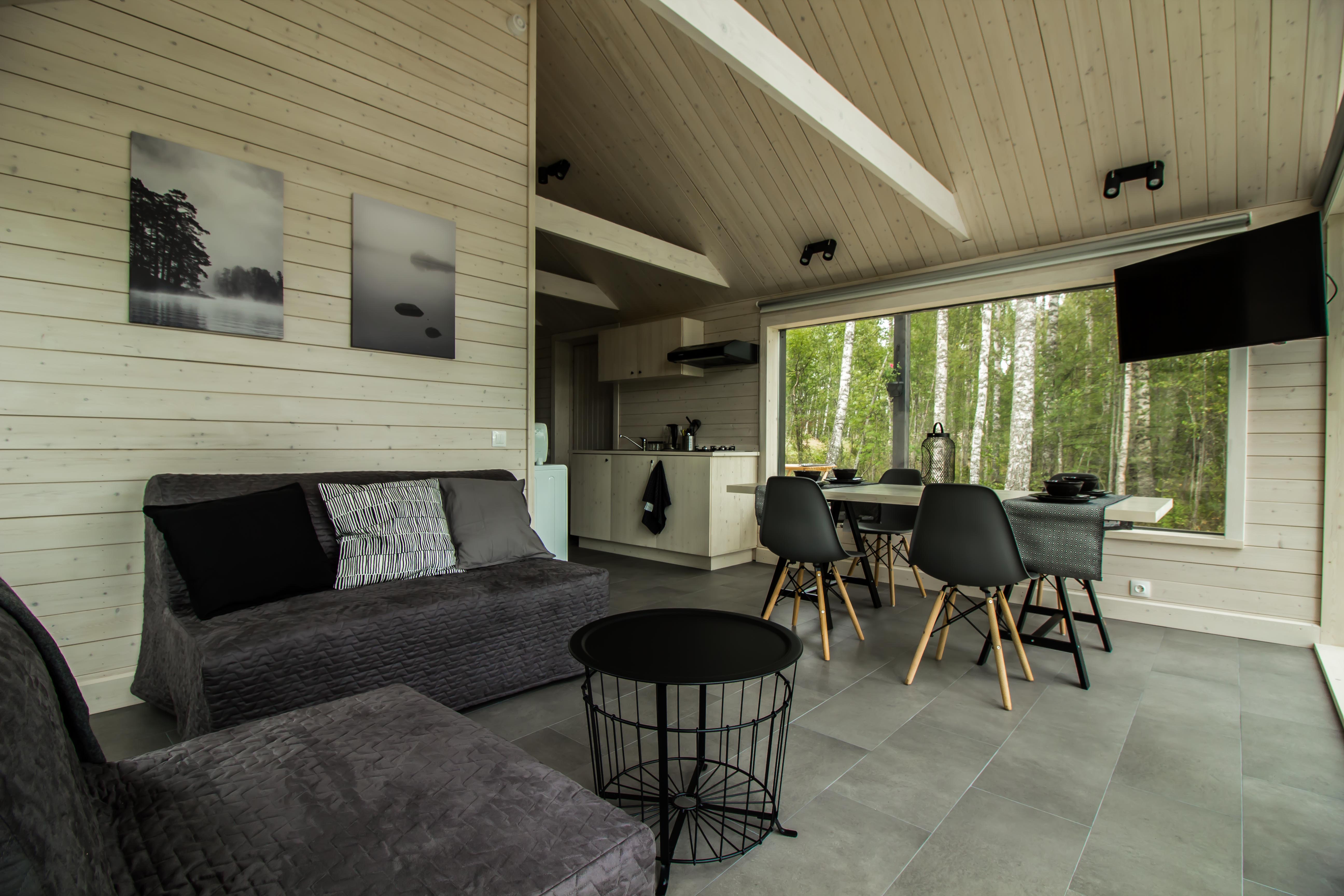 Коттедж ЛОФТ ХАУС имеет расширенную панораму первого этажа с угловыми окнами с шикарным видом на озеро, и небольшую уединенную террасу с креслом-качелью и шезлонгами, также есть зона отдыха с мангалом.