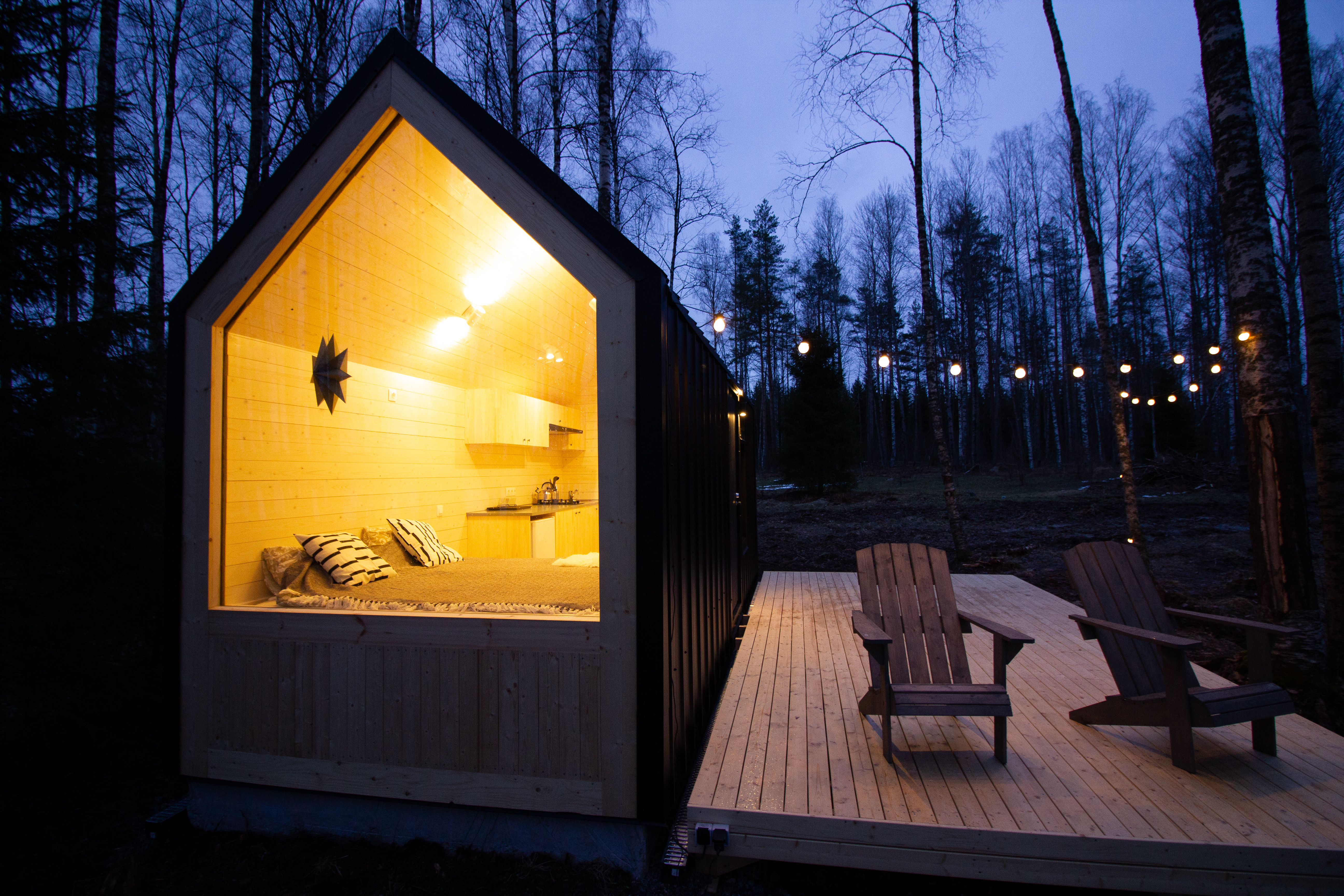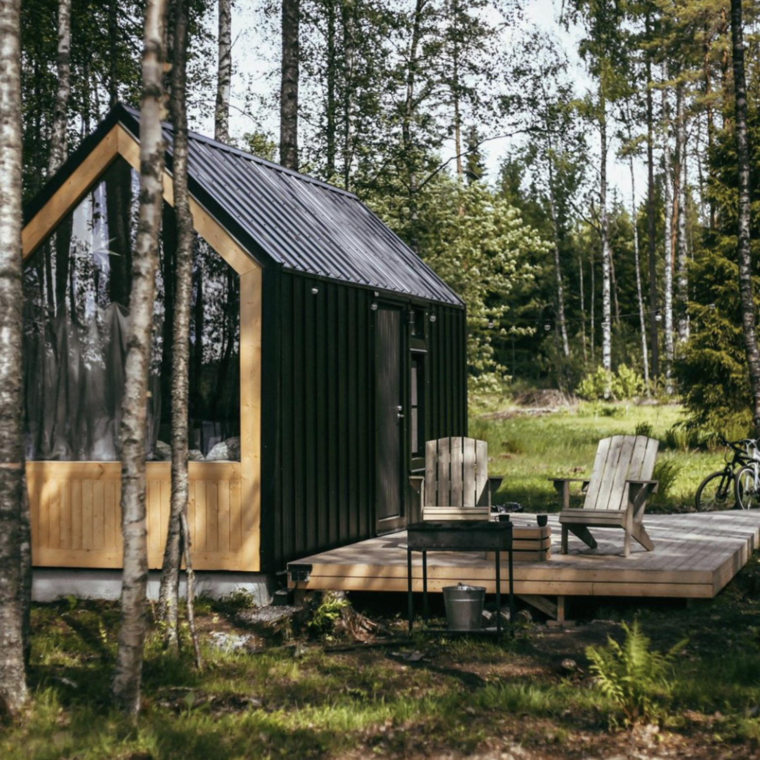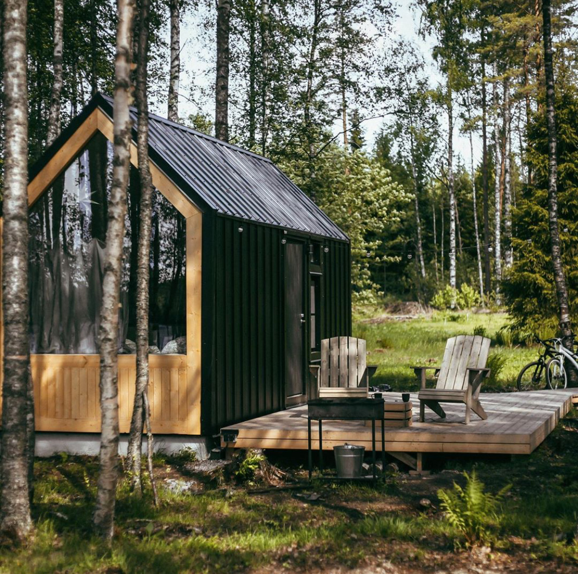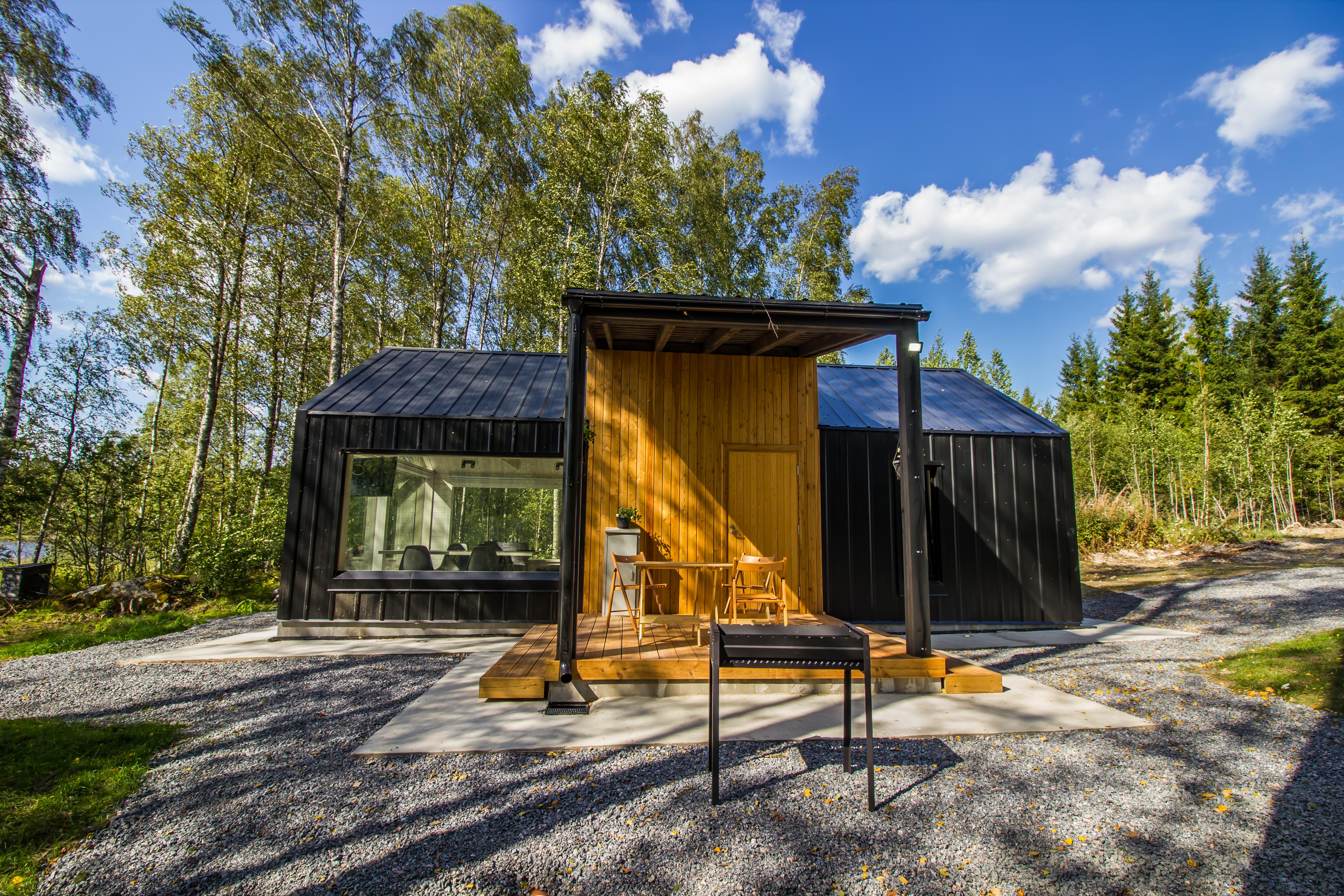 На территории 3 мини-домика на расстоянии 10-15 метров, терраса каждого отвернута от соседнего дома